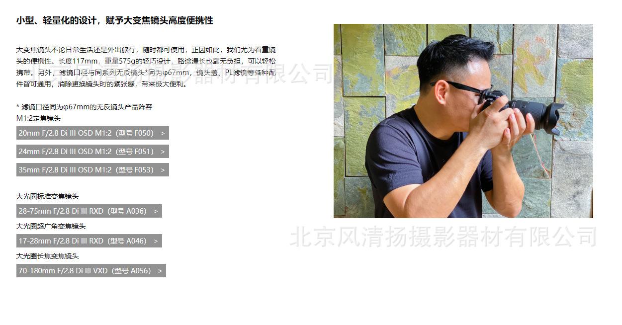 Diseñado para cámaras sin espejo de fotograma completo con montura E de Sony, este versátil objetivo con zoom tiene una apertura máxima de F2.8.