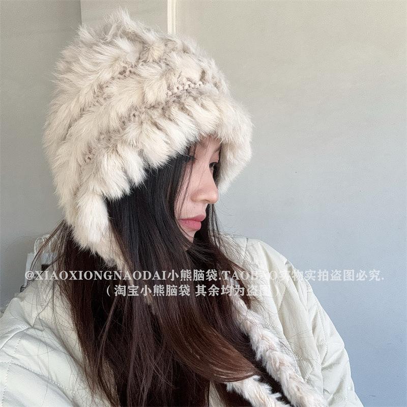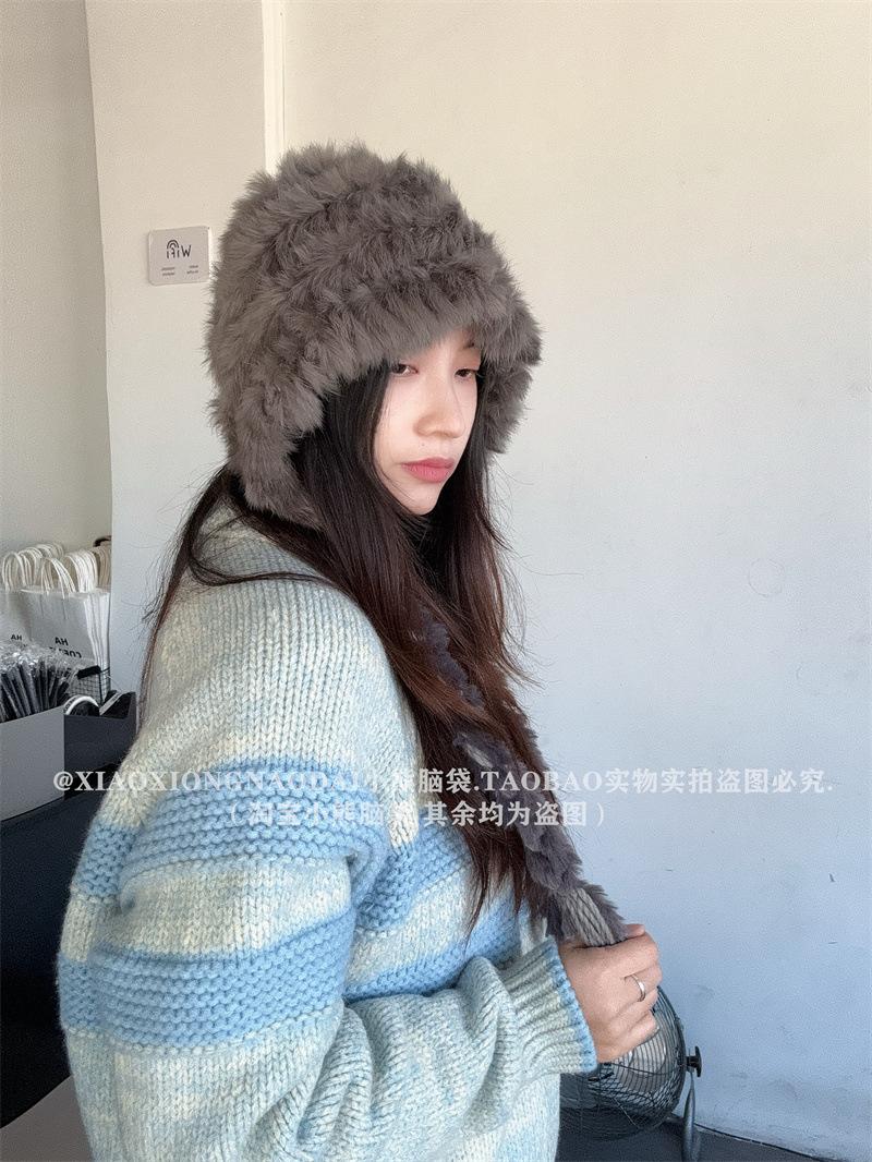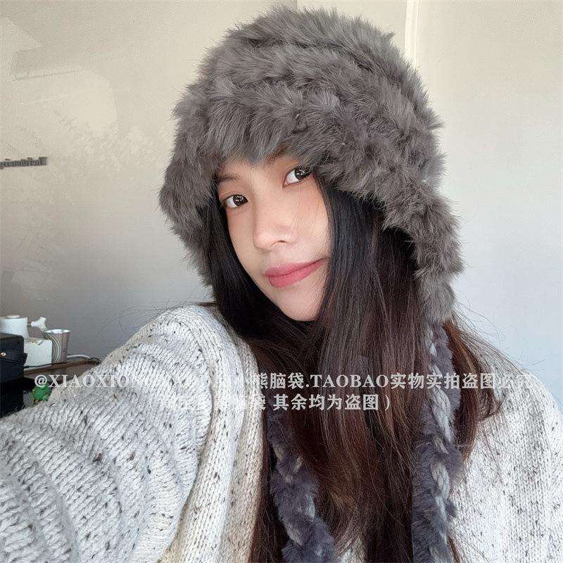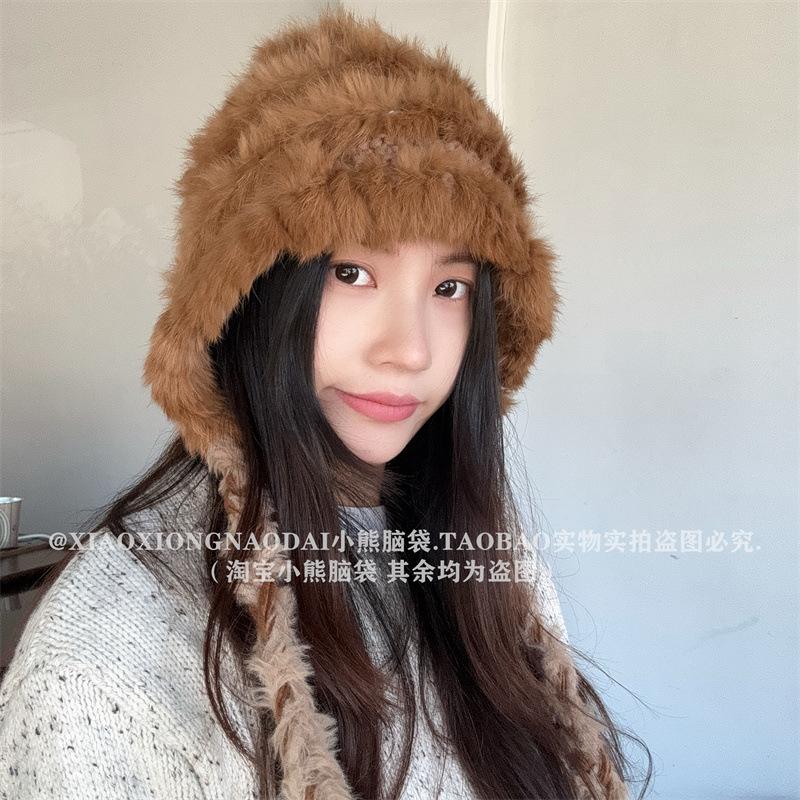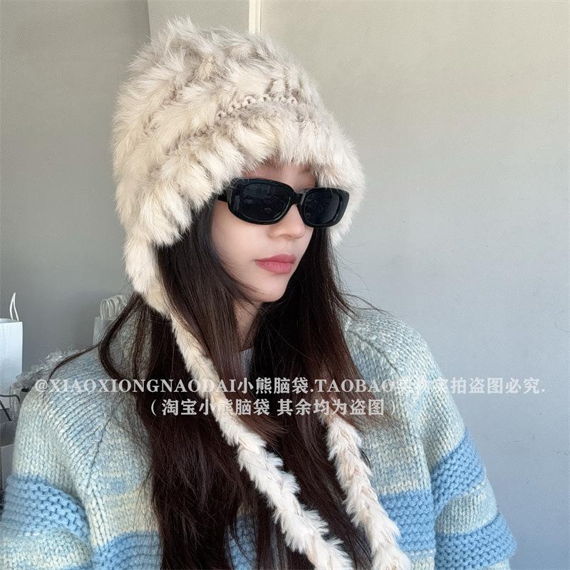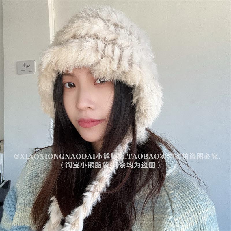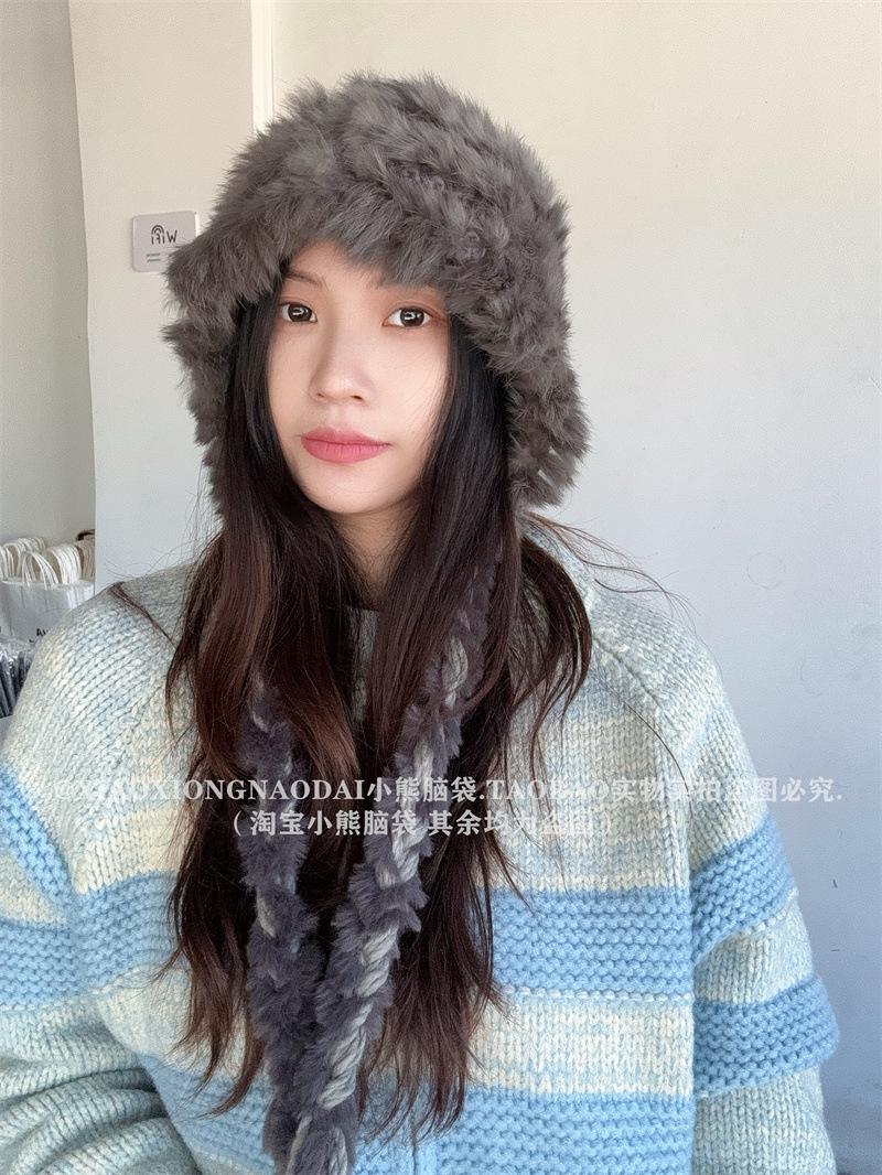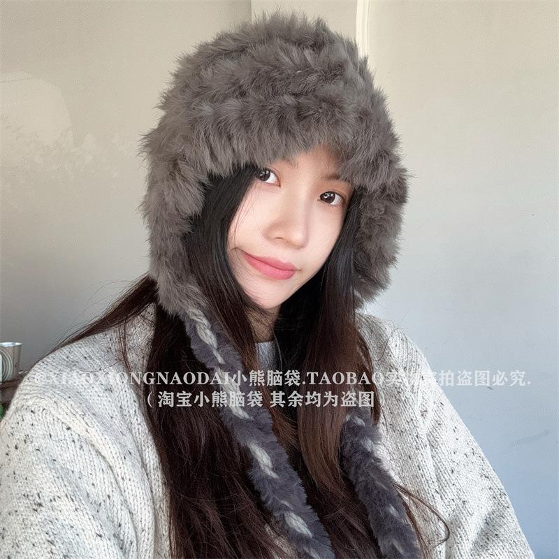 Gorro protector de orejas estilo coreano con mezcla de piel de conejo auténtica, gorro pequeño con bolsa para otoño e invierno, gorro tejido a mano, gorro Lei Feng para mujer