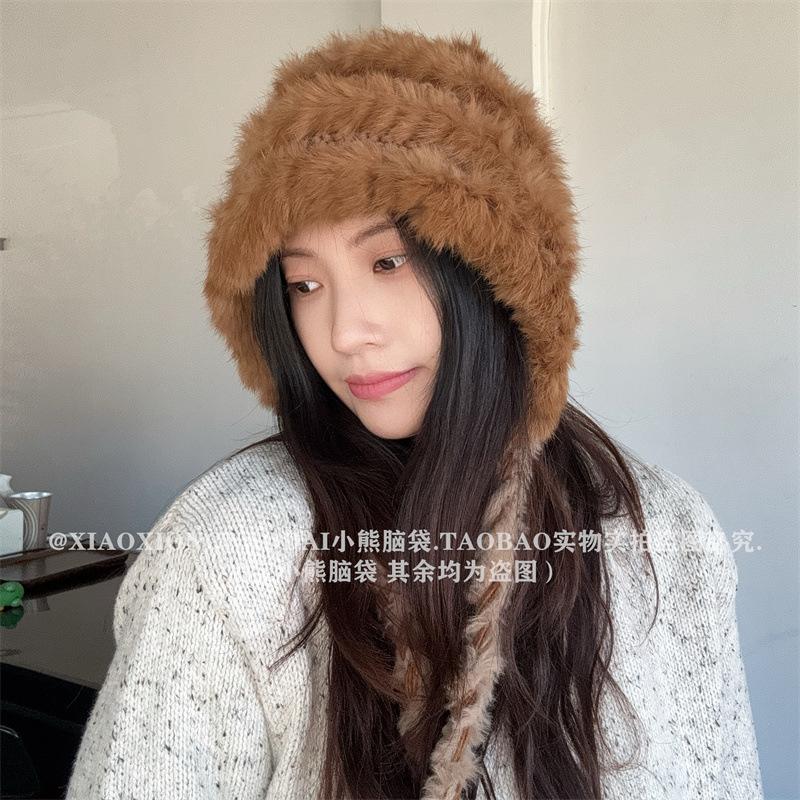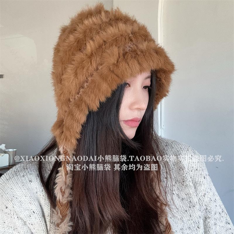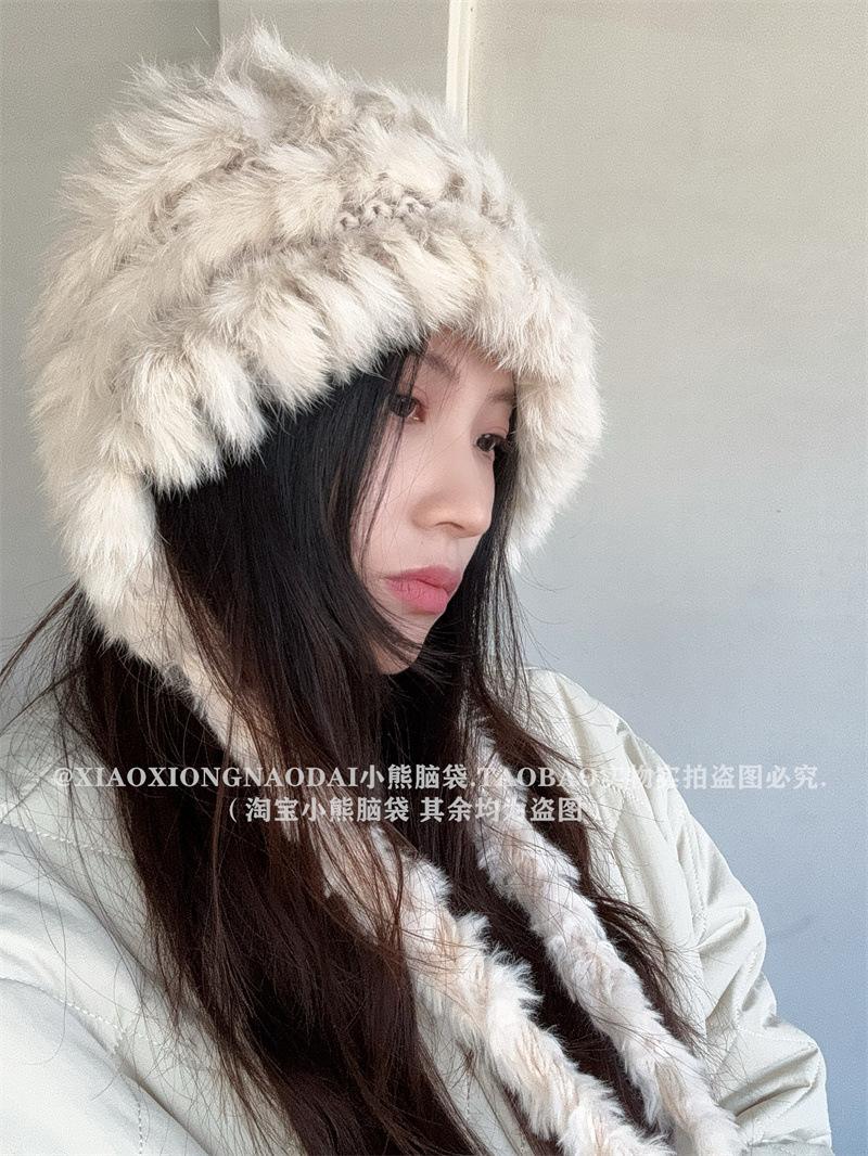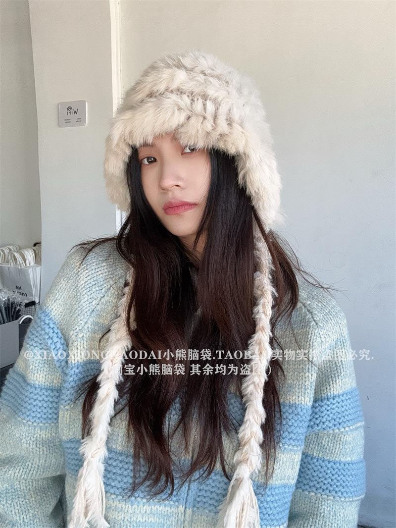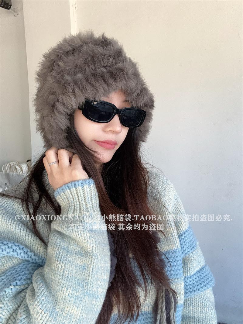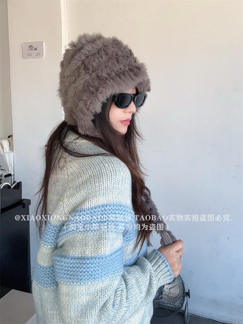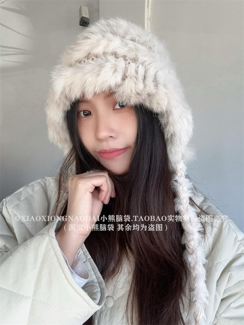 Gorro protector de orejas estilo coreano con mezcla de piel de conejo auténtica, gorro pequeño con bolsa para otoño e invierno, gorro tejido a mano, gorro Lei Feng para mujer