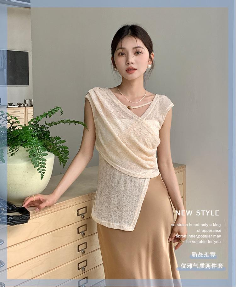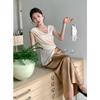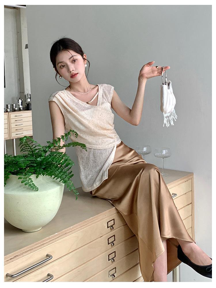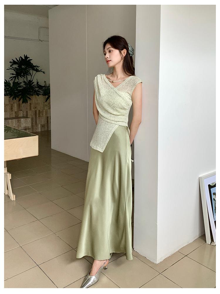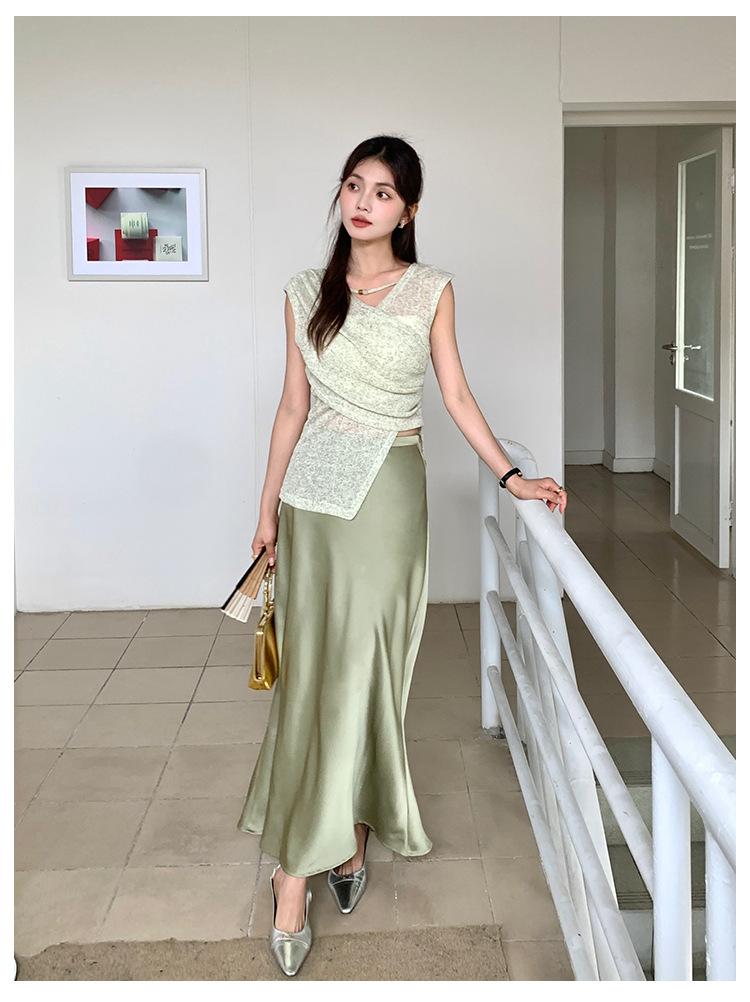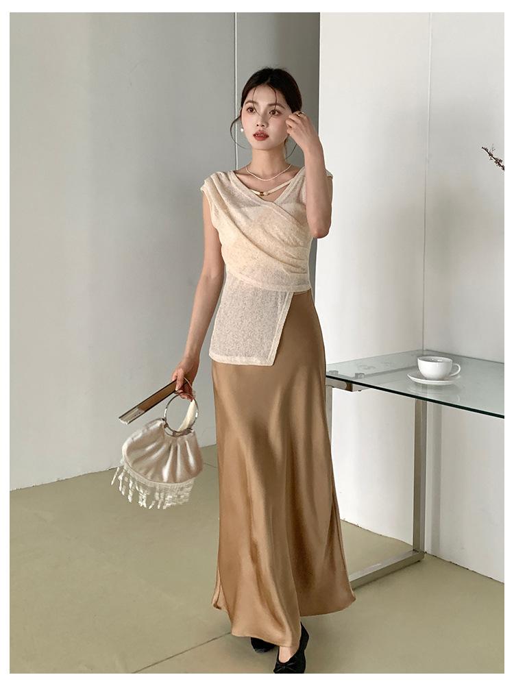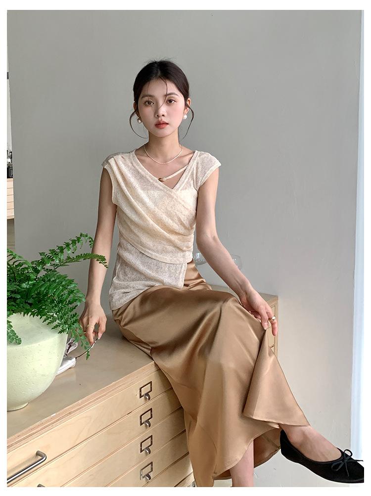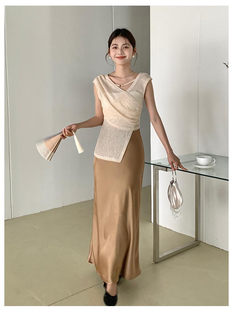 Conjunto de dos piezas formado por camiseta y falda de satén, para mujer, de punto irregular, color liso, de alta calidad, para verano