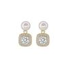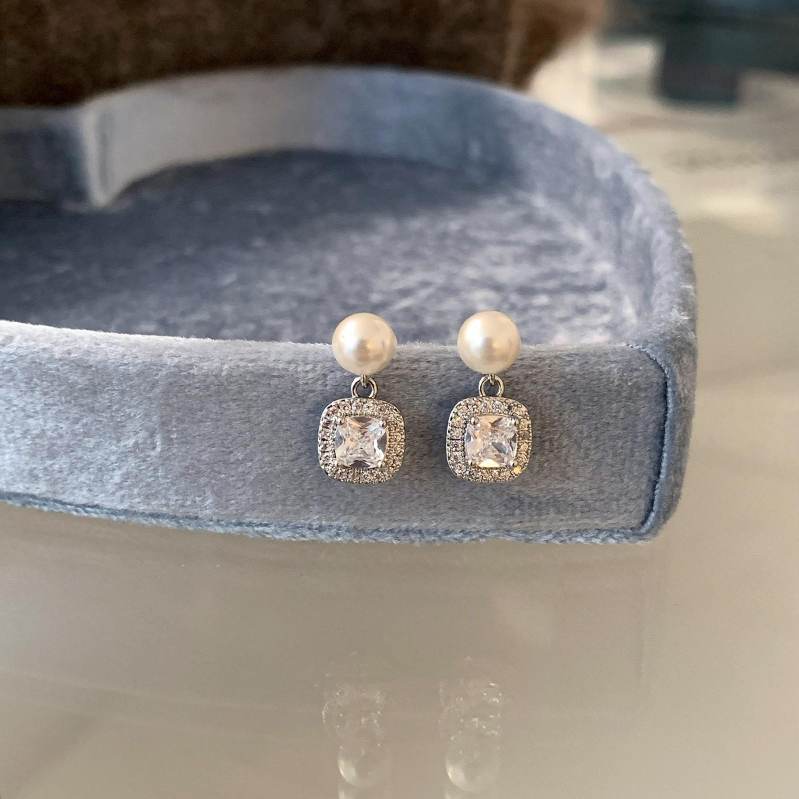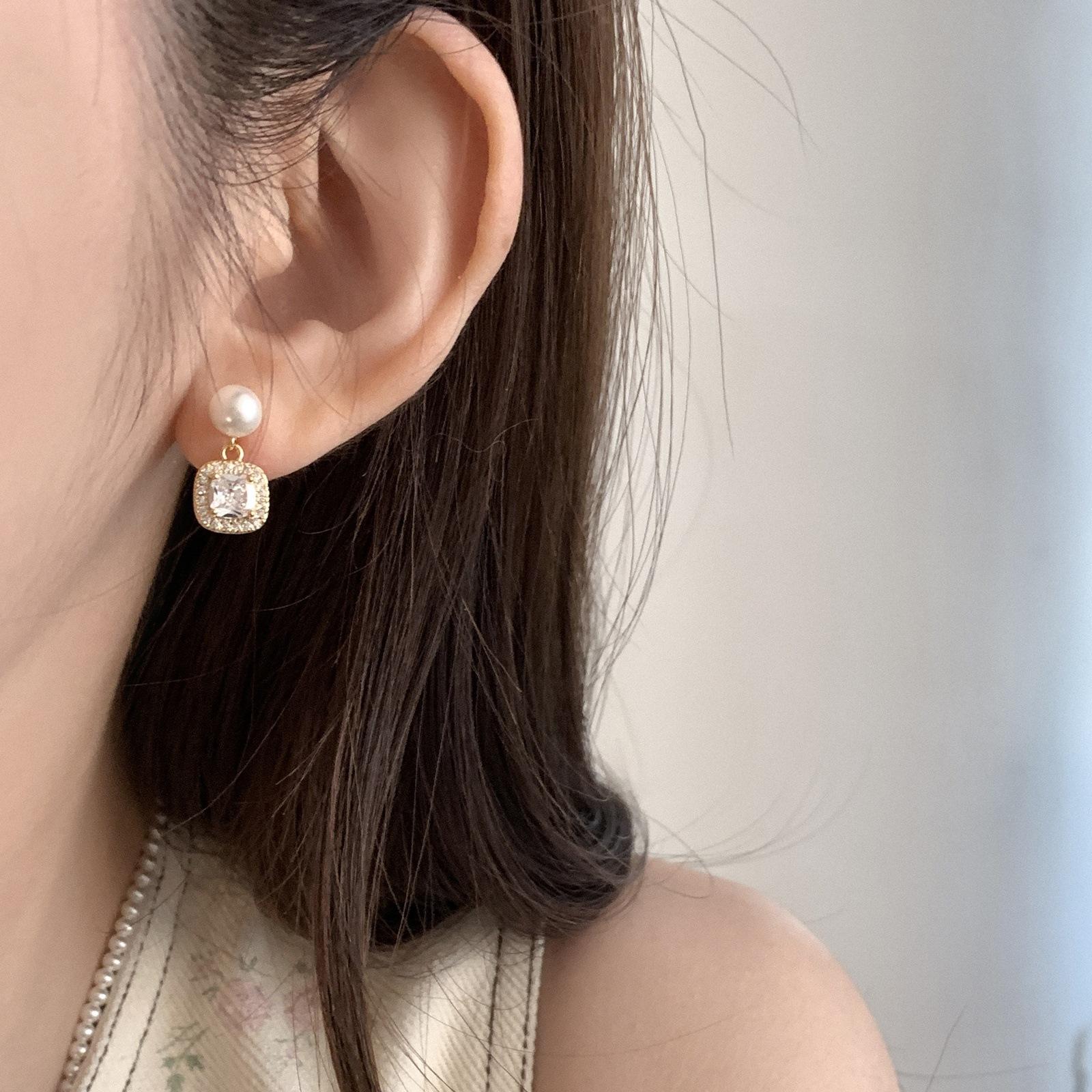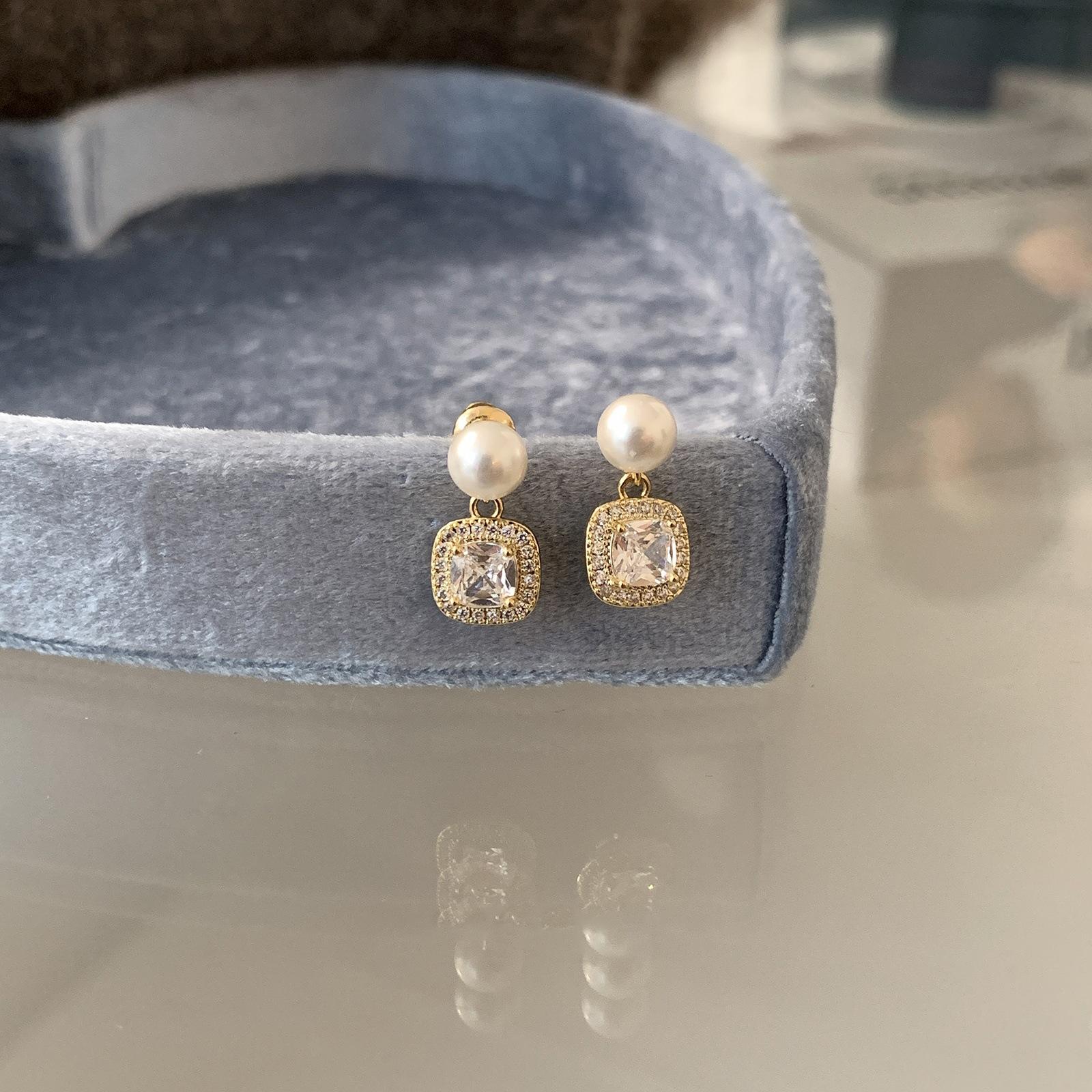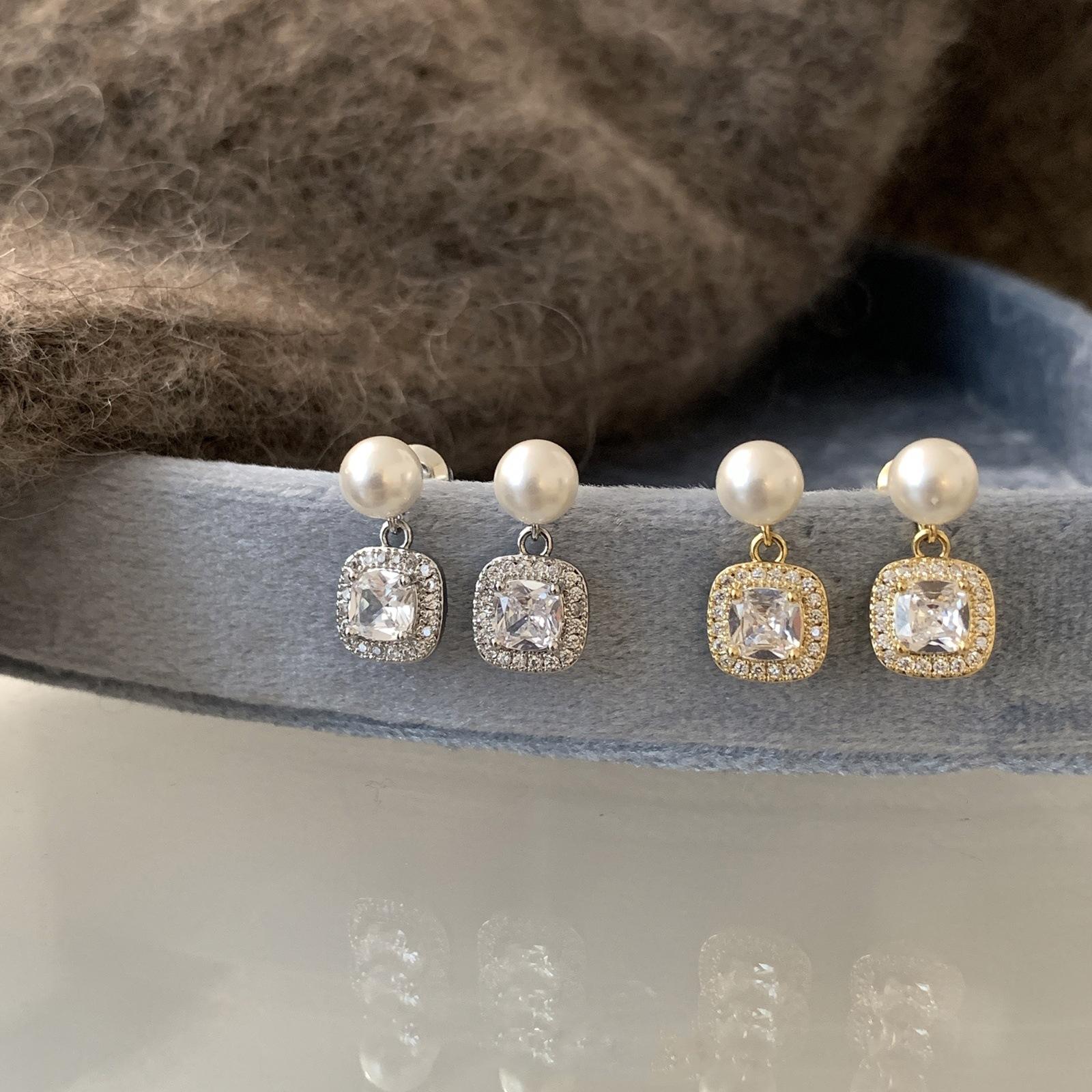 Sugar cube pearl stud earrings [white diamond], Sugar cube pearl stud earrings [yellow diamond], Sugar cube pe...