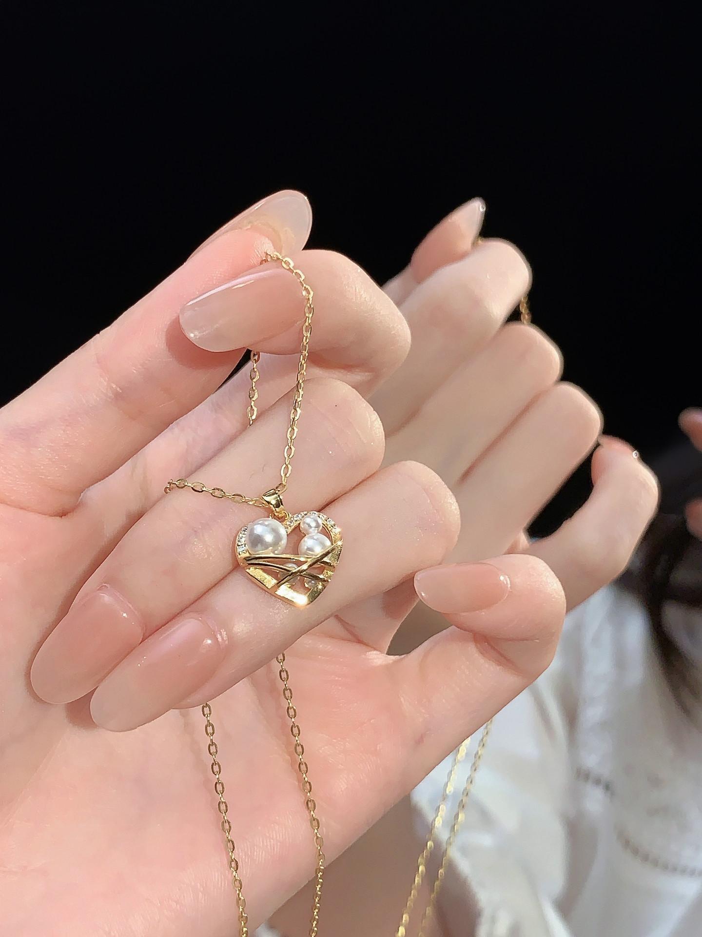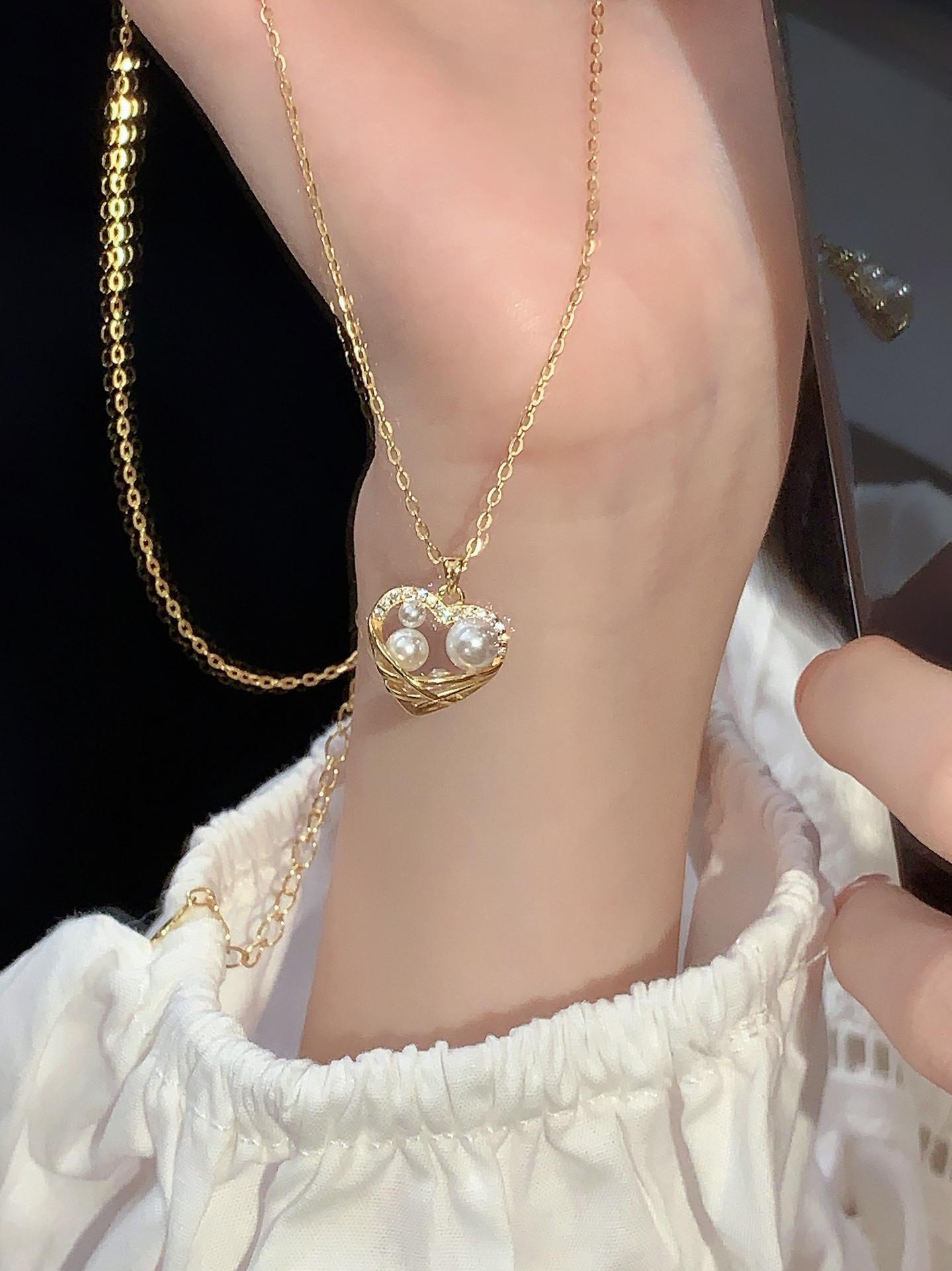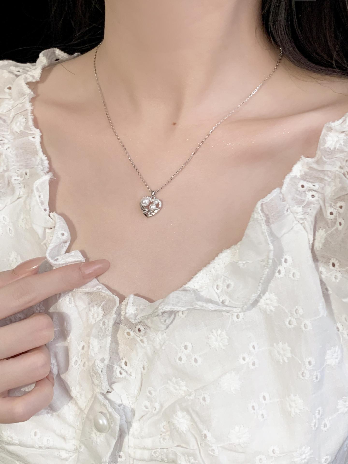 Collar de plata de ley S925 con diseño de corazón de melocotón y perla de imitación, estilo japonés y coreano, con diseño de amor hueco, estilo Tiki, a la moda para mujer