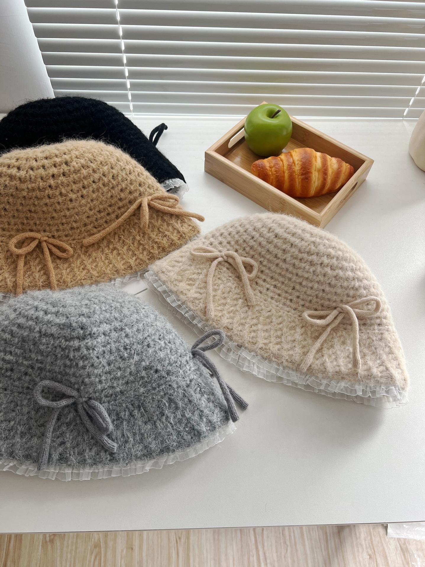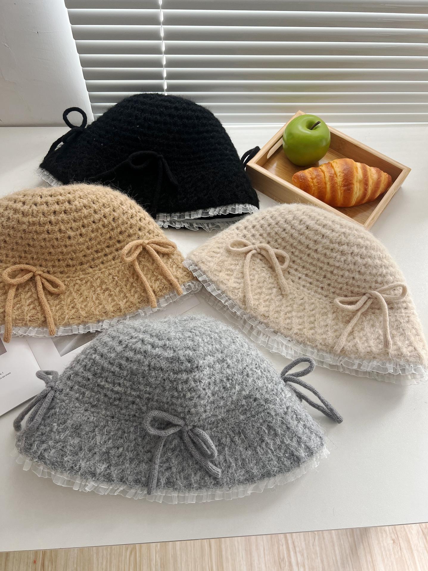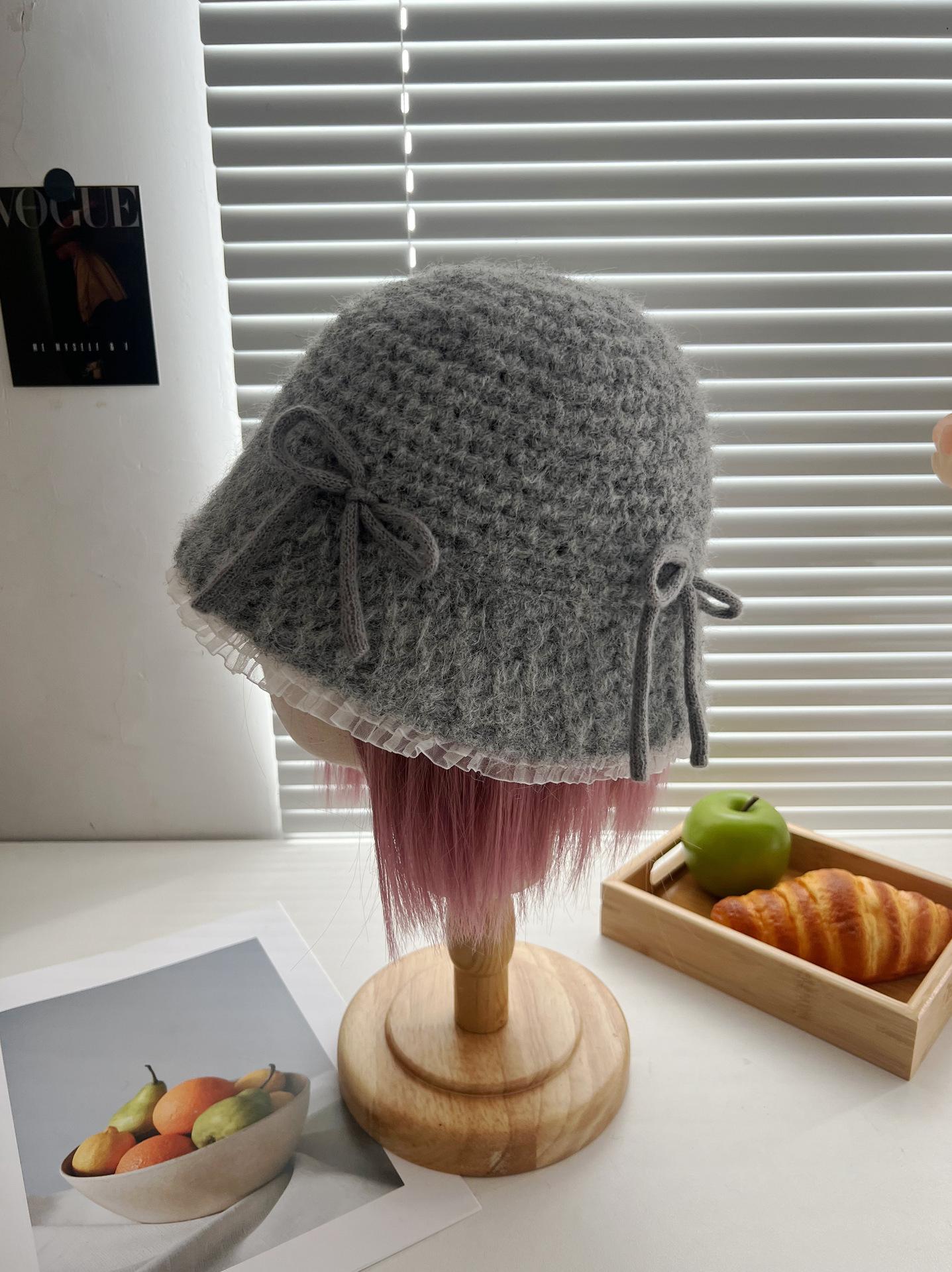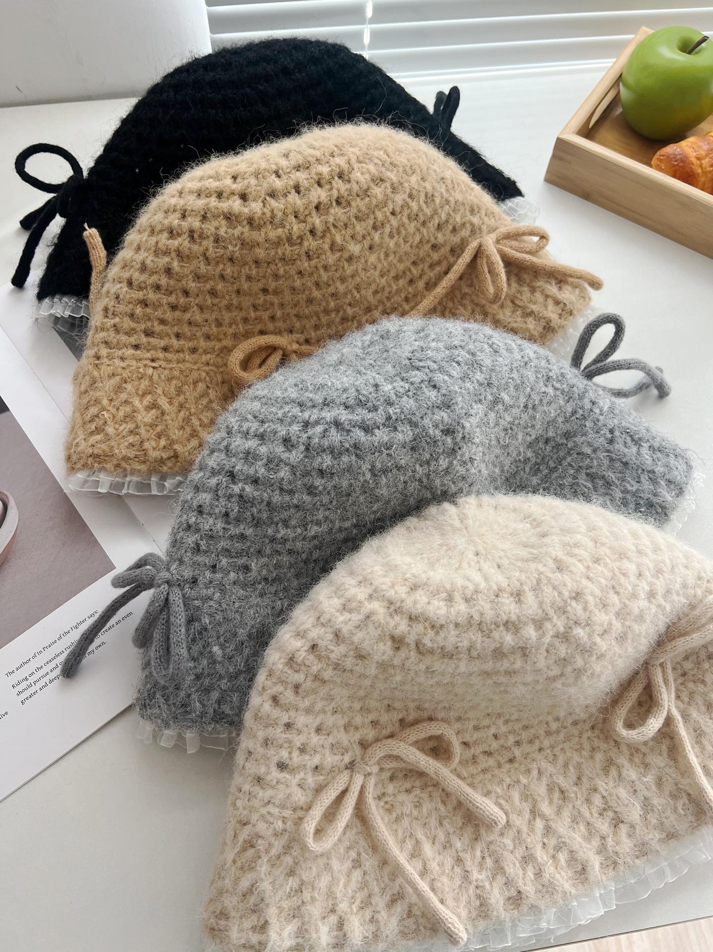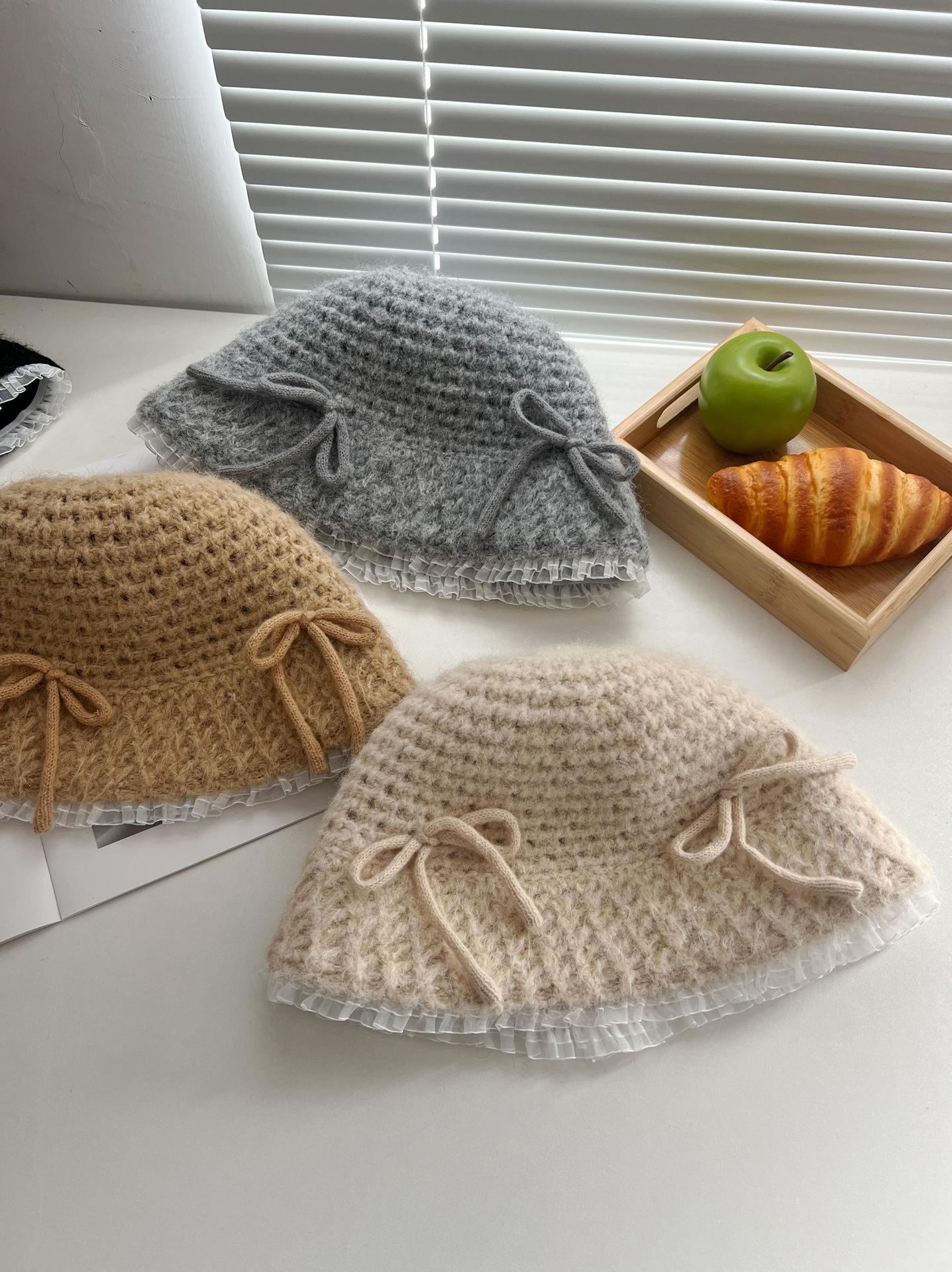 Sombrero de lana tejido con lazo dulce y lindo estilo japonés para mujer otoño e invierno cálido protección para las orejas sombrero de pescador de cabeza de cubo hace que la cara se vea pequeña