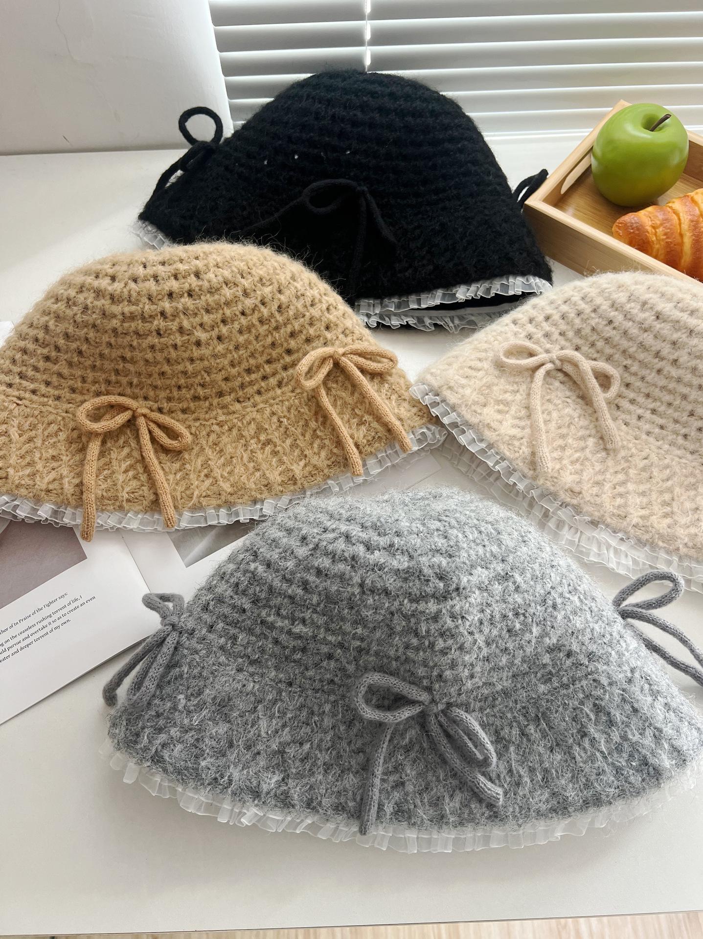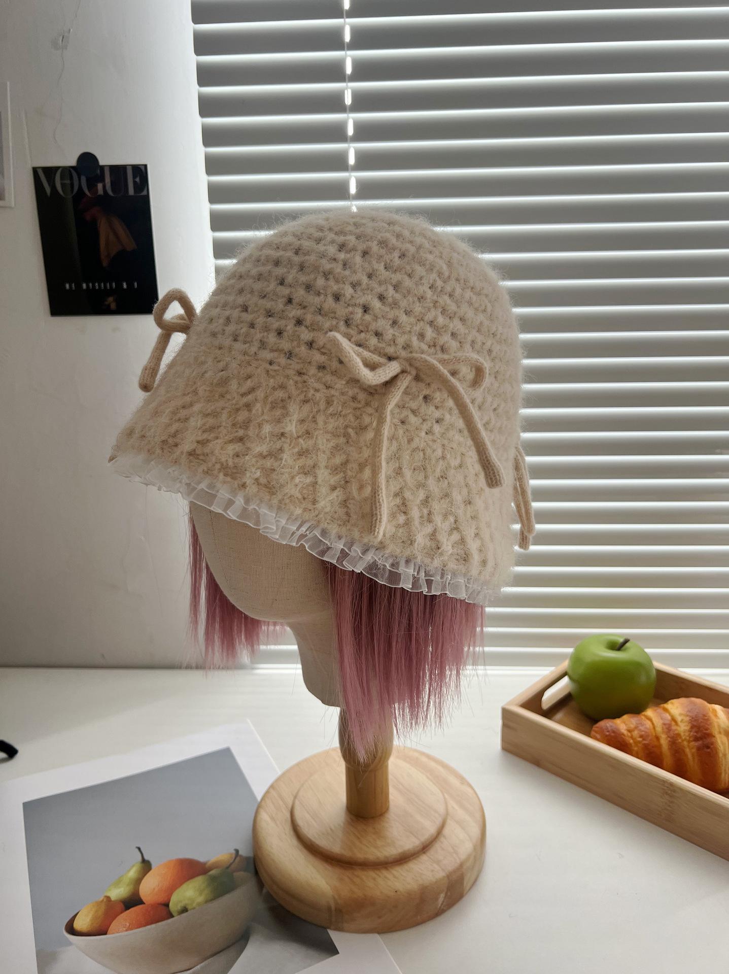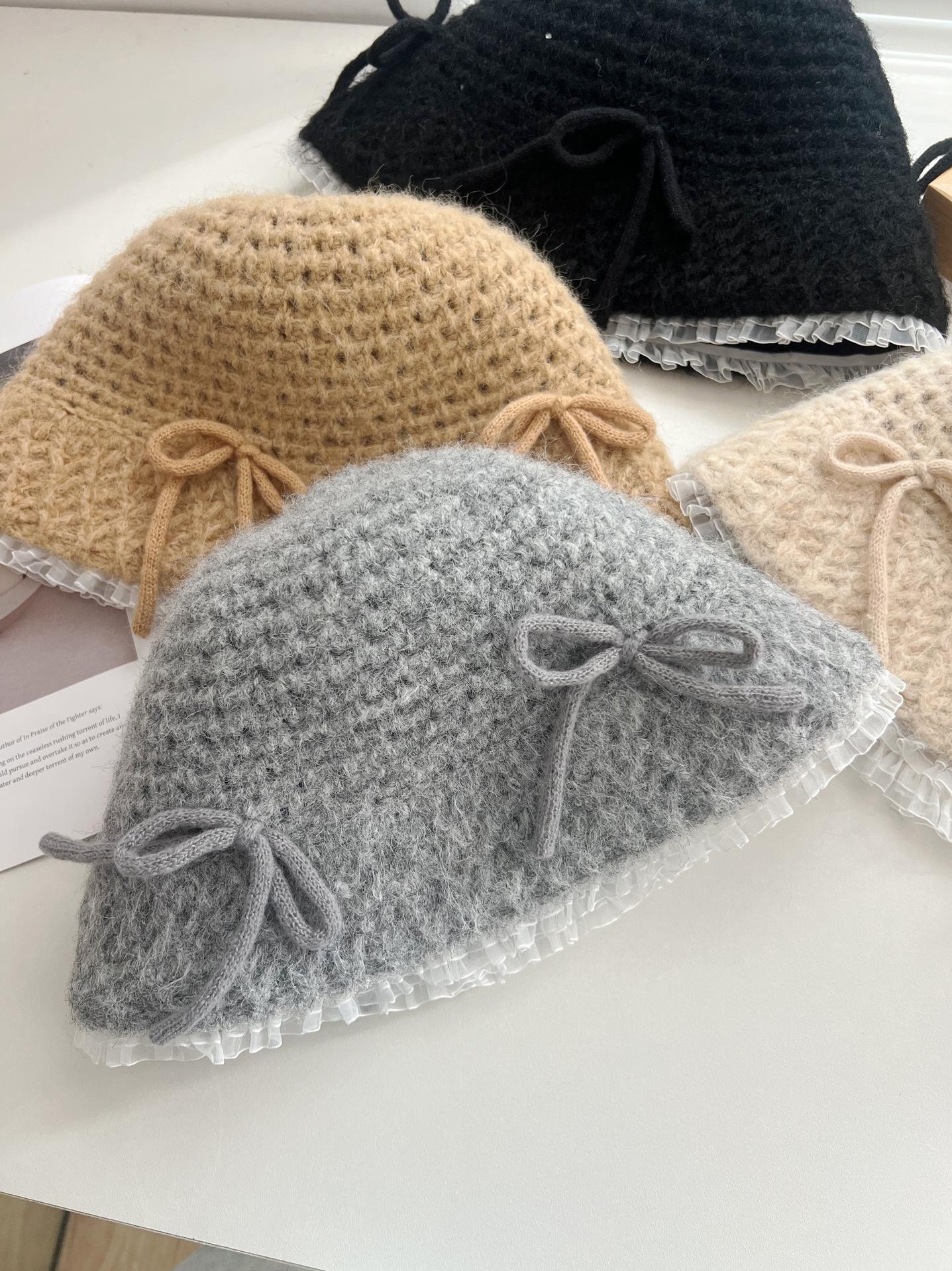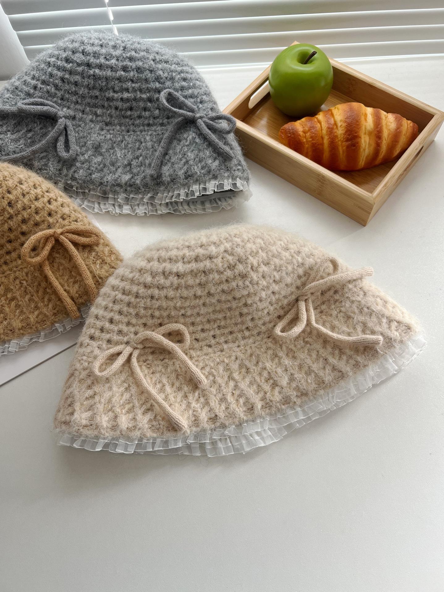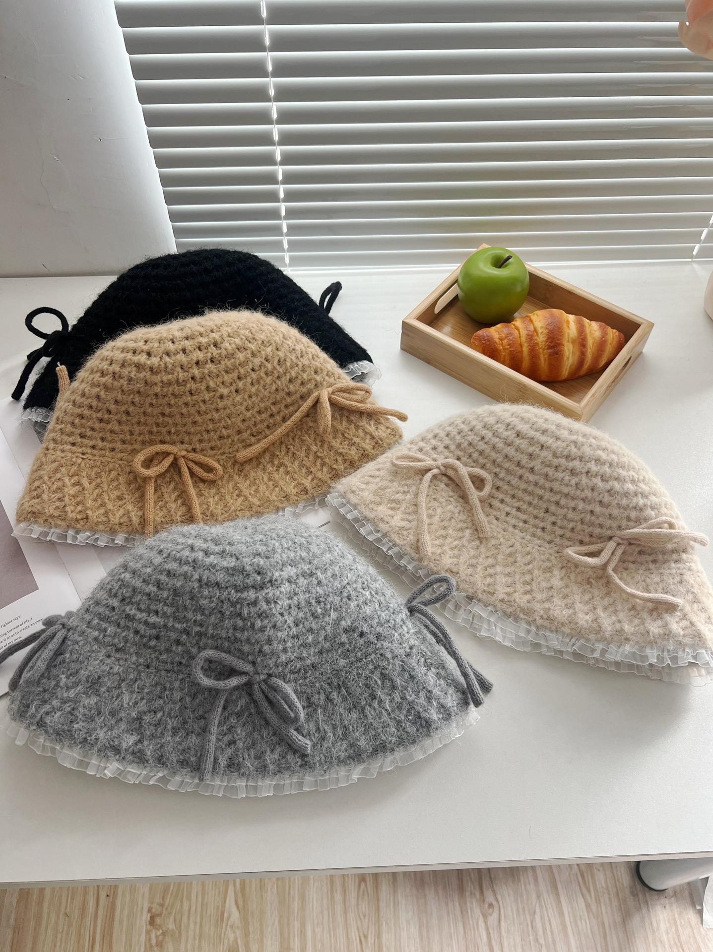 Sombrero de lana tejido con lazo dulce y lindo estilo japonés para mujer otoño e invierno cálido protección para las orejas sombrero de pescador de cabeza de cubo hace que la cara se vea pequeña
