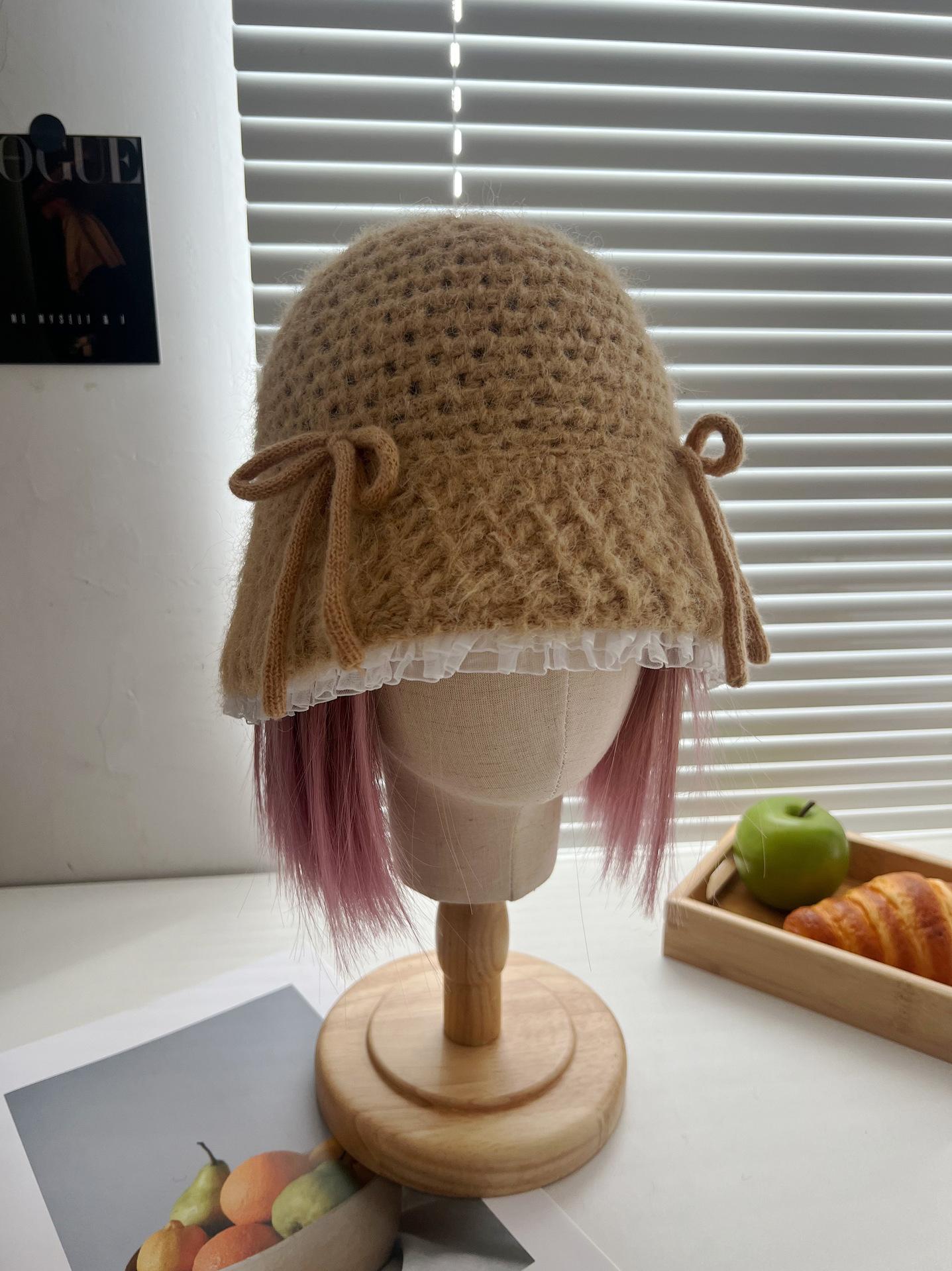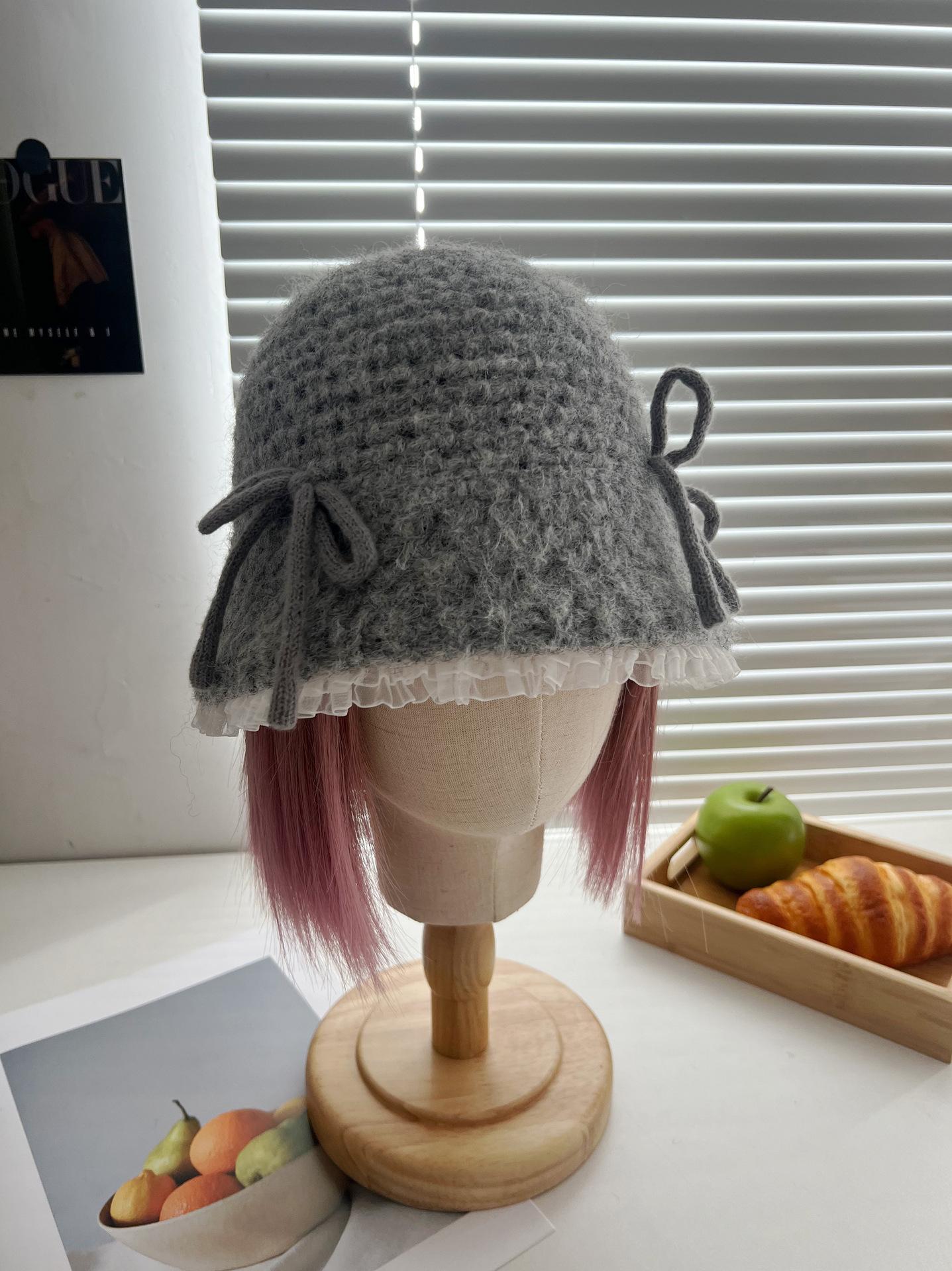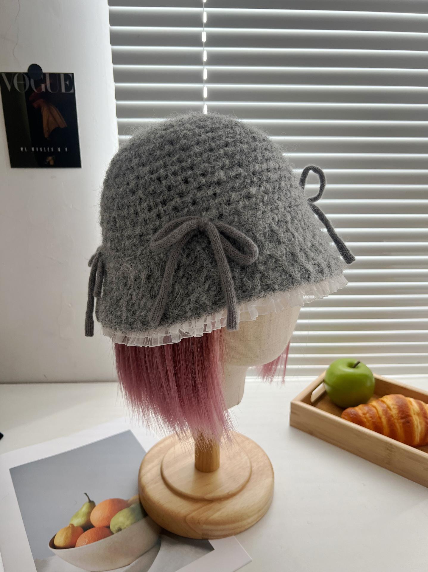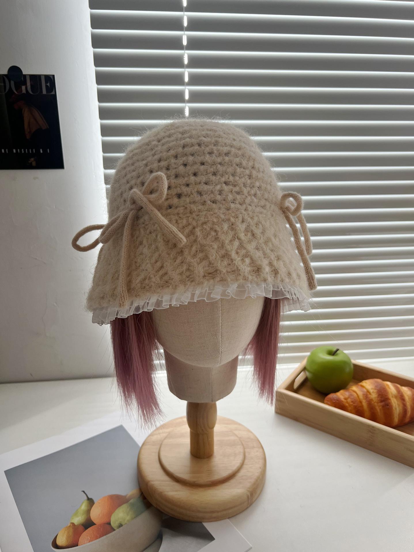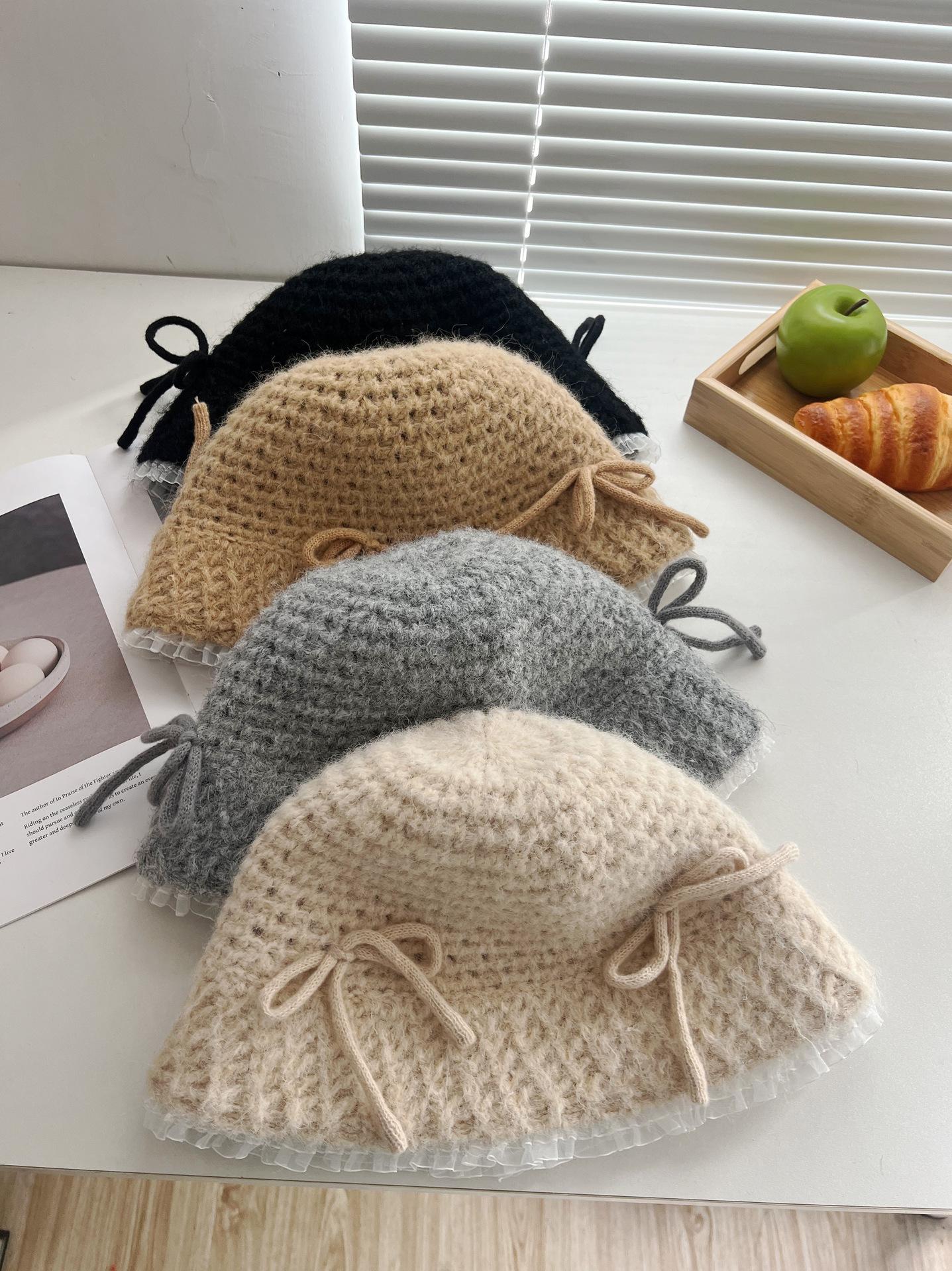Sombrero de lana tejido con lazo dulce y lindo estilo japonés para mujer otoño e invierno cálido protección para las orejas sombrero de pescador de cabeza de cubo hace que la cara se vea pequeña