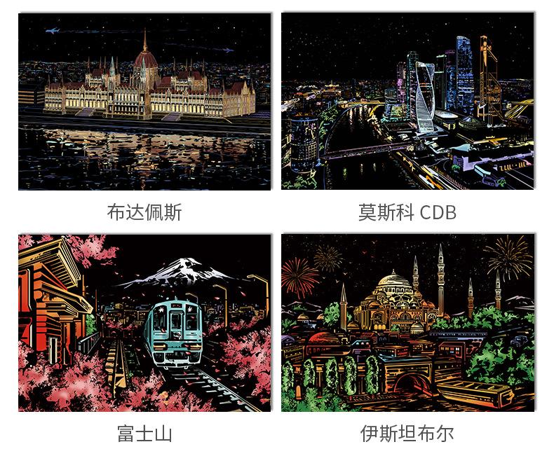 Nuevo Pintura Rascable de Ciudad Colorida Escena Nocturna Pintura DIY Set de Papel de Pintura Rascable con Pluma Regalo de Cumpleaños para Niños Venta al por Mayor