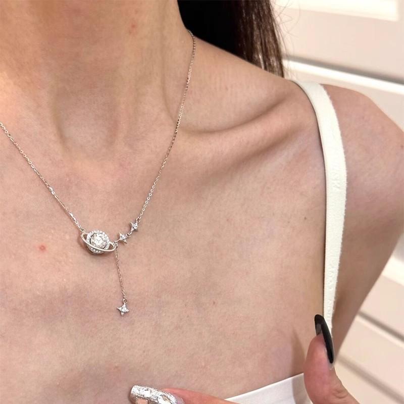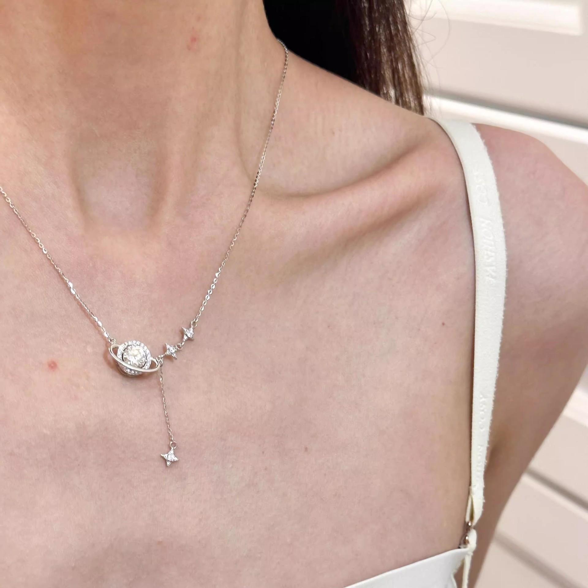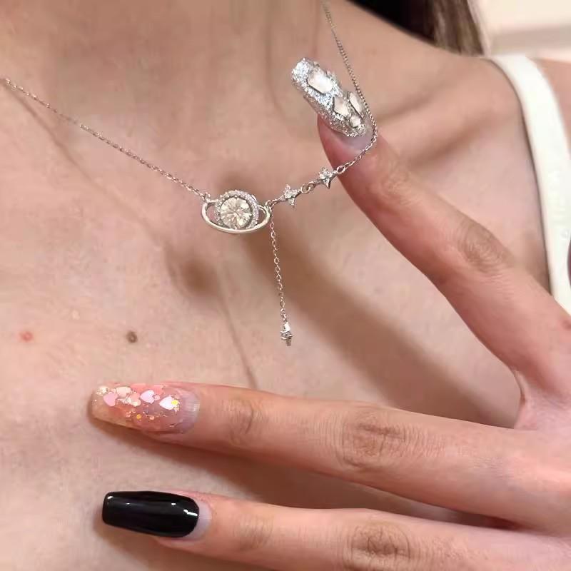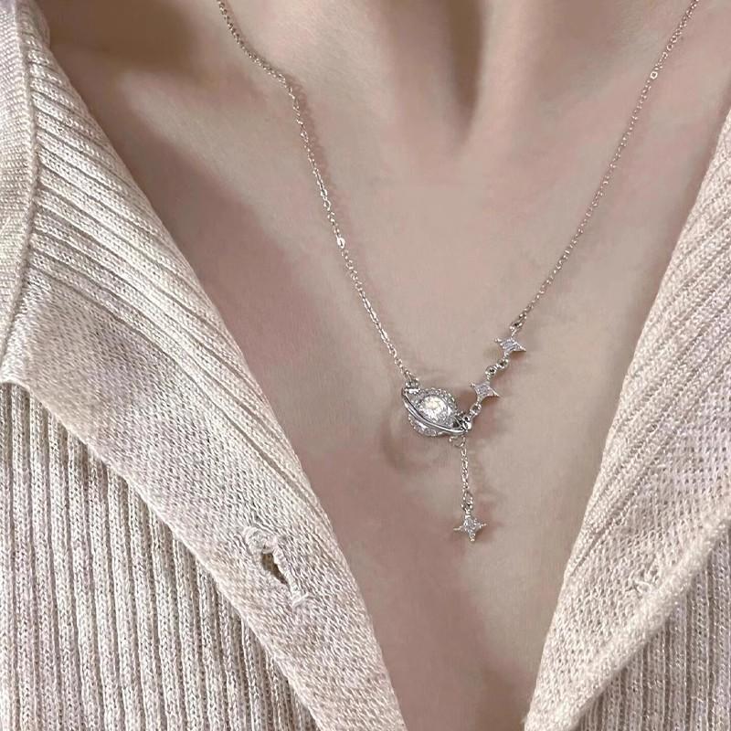 Collar de Borla Universo Galaxia Plateado para Mujer 2025 Nuevo Lujo Ligero de Alta Gama Sencillo Acero de Titanio Inoxidable Cadena Clavicular