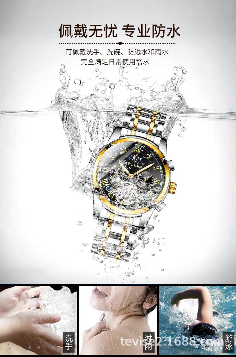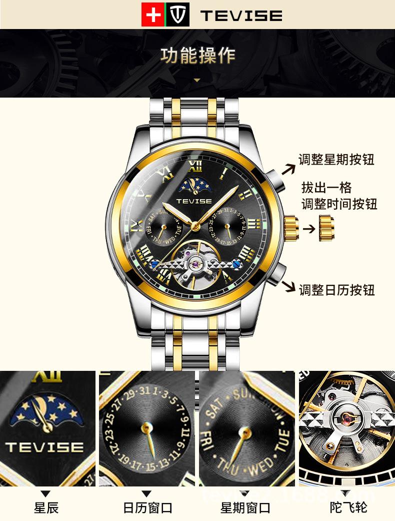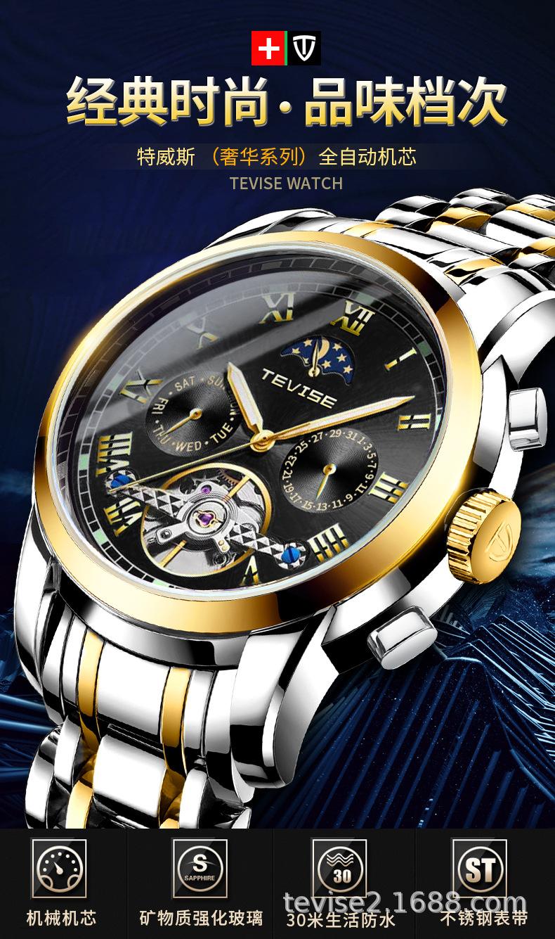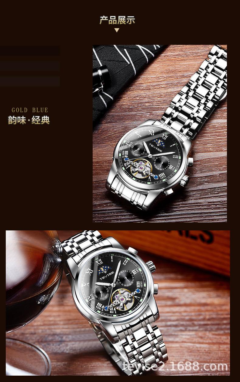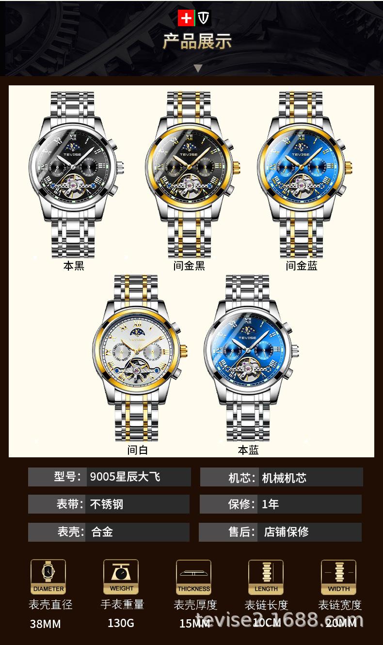 Reloj Nuevo para Hombre Tevise Celebridad de Internet Reloj Fase Lunar Estrella Impermeable Luminoso Reloj Tourbillon