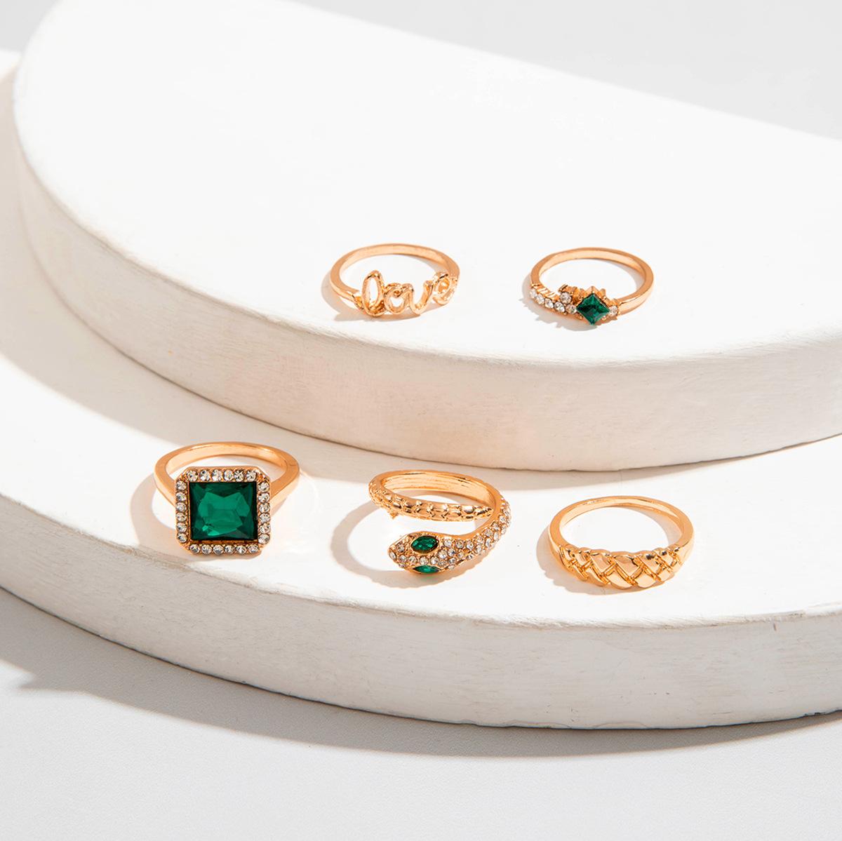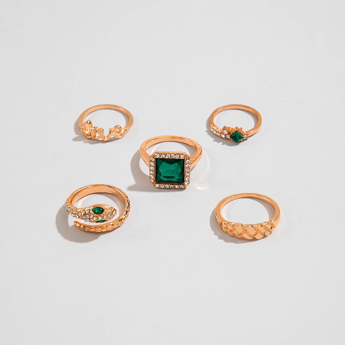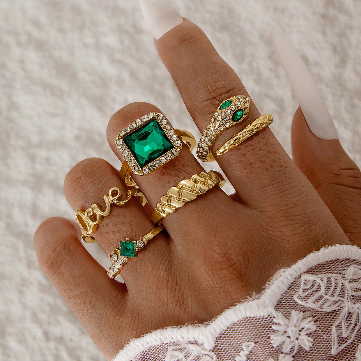 Juego de anillos europeos y americanos retro transfronterizos de metal con imitación de esmeralda y diseño de anillos de amor y con forma de serpiente