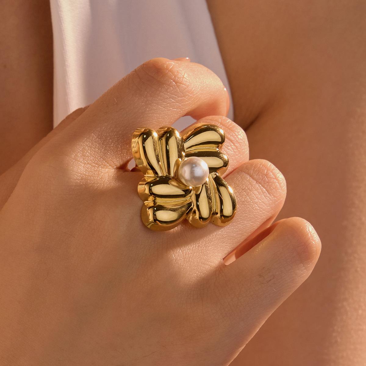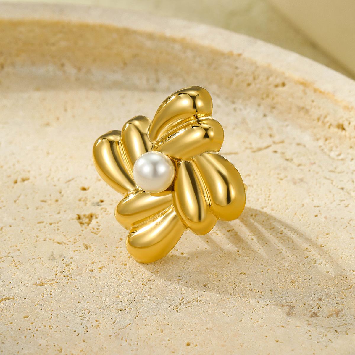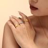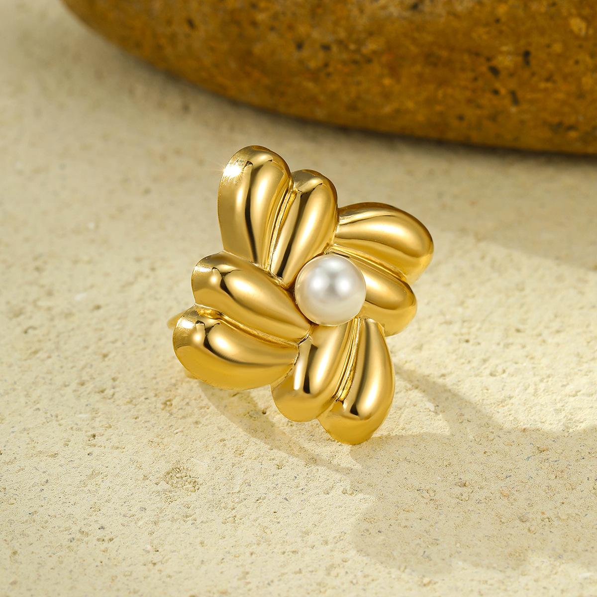 Anillo Nuevo Europeo y Americano Transfronterizo de Acero de Titanio Dorado Cuadrado Geométrico Rosca Anillo de Acero Inoxidable Incrustado con Perlas Joyería para Mujer