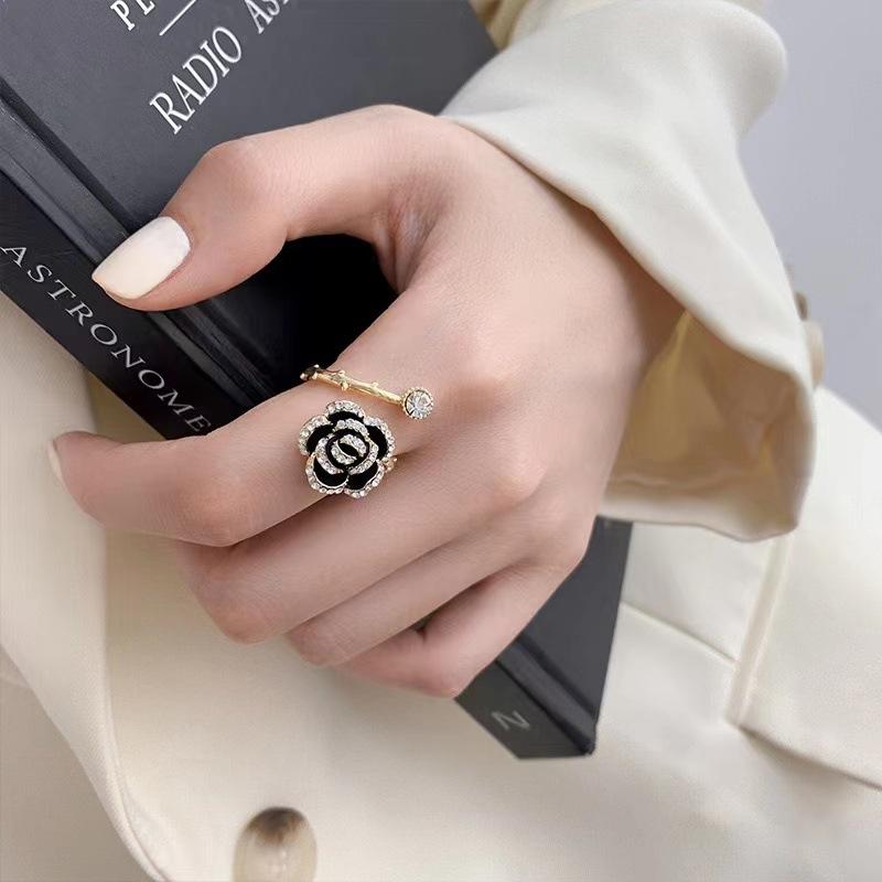 Corea del Sur Anillo Camelia Negra Mujer Diseño Nicho Lujo Ligero Sentido de Alta Gama Exquisito Moda Personalizado Anillo Abierto para el Dedo