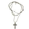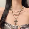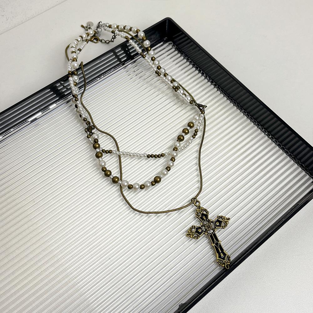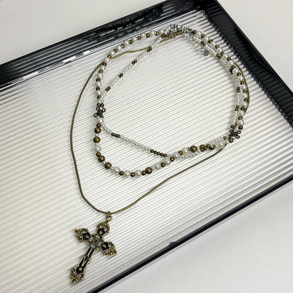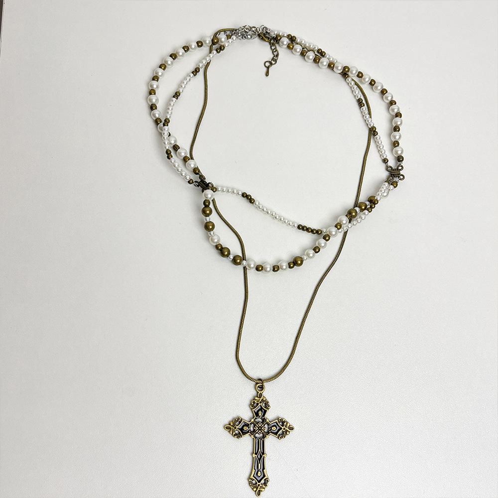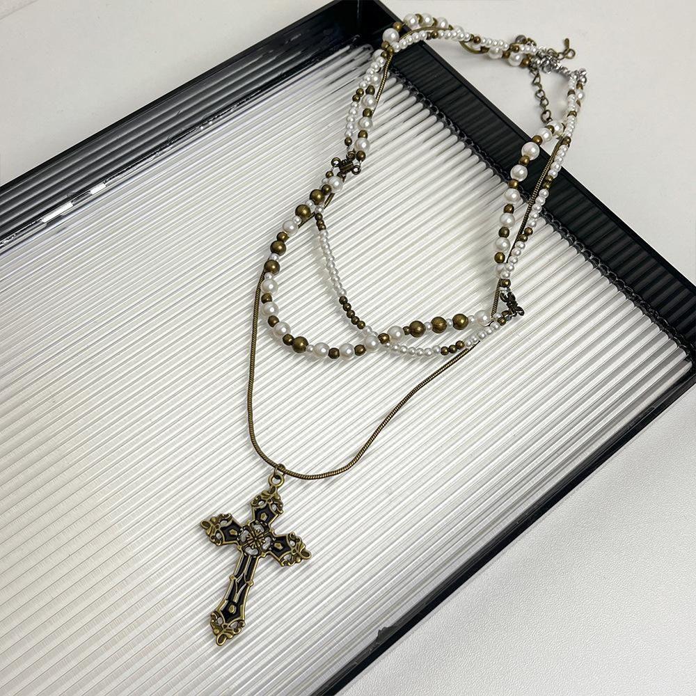 Collar de perlas con colgante de cruz apilada retro europeo y americano, diseño de nicho para mujer, cadena de clavícula con cuentas largas