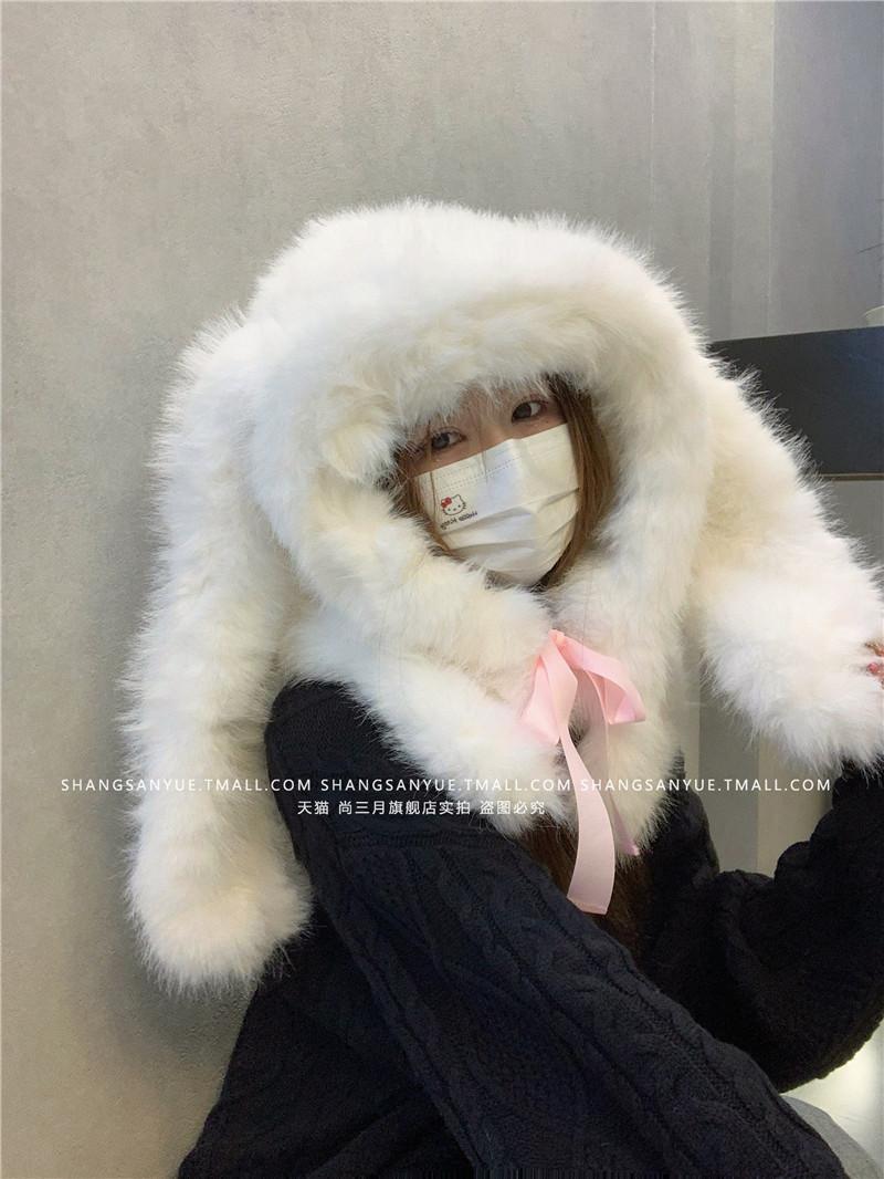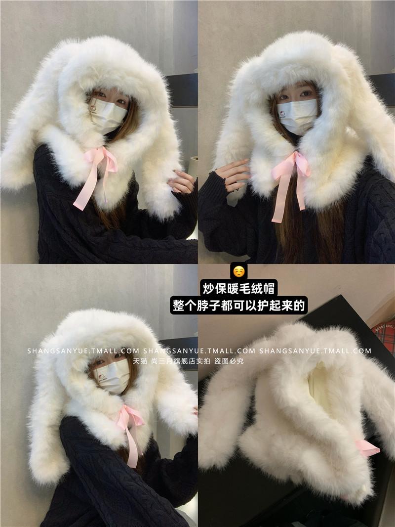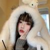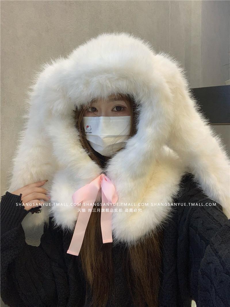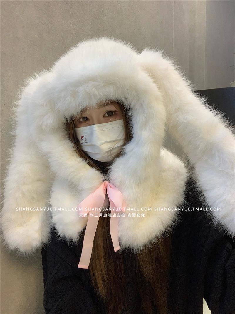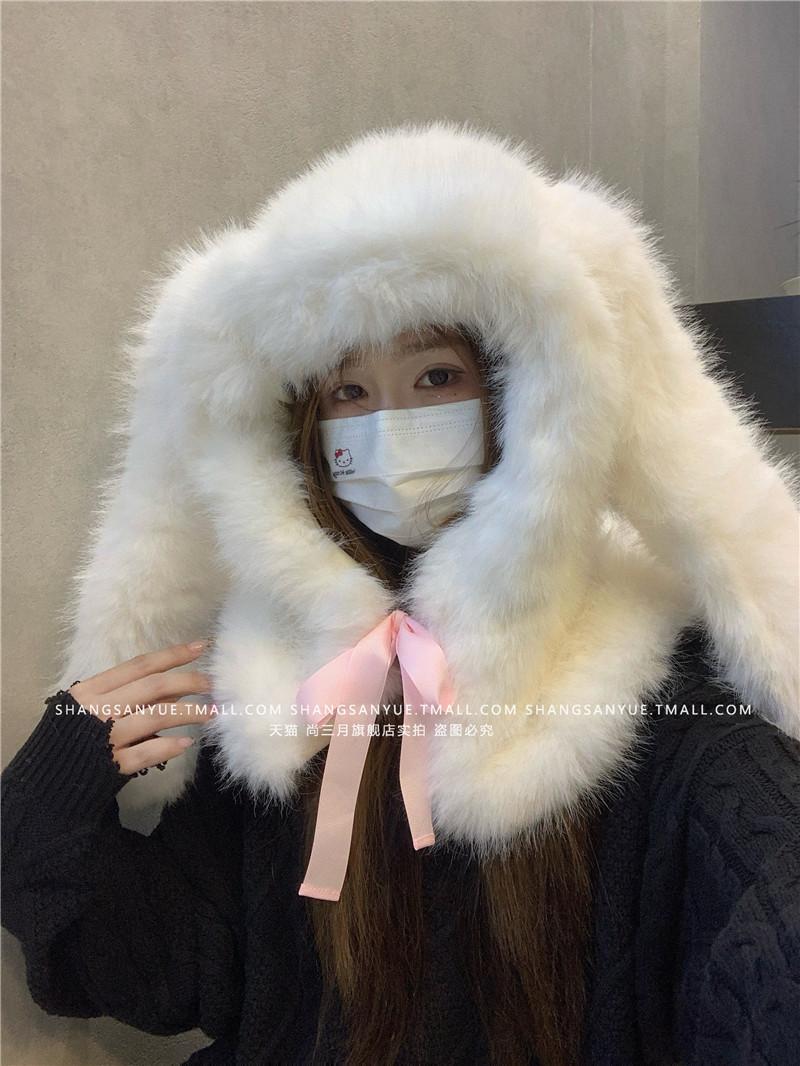 Gorro de felpa con orejas de conejo, bufanda todo en uno, cálido y protector de orejas para invierno, gorro Lei Feng, grueso y esponjoso, para ciclismo.