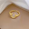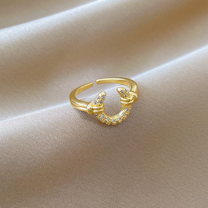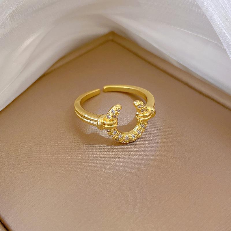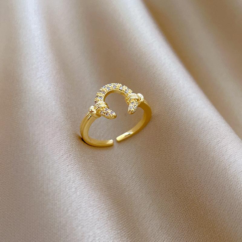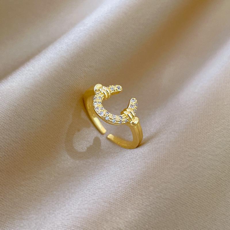 [Oro Real] Anillo de Media Luna Creciente Curvado con Diamantes Completos Apertura Ajustable Joyería Simple Anillo Japonés Anillo de Pareja
