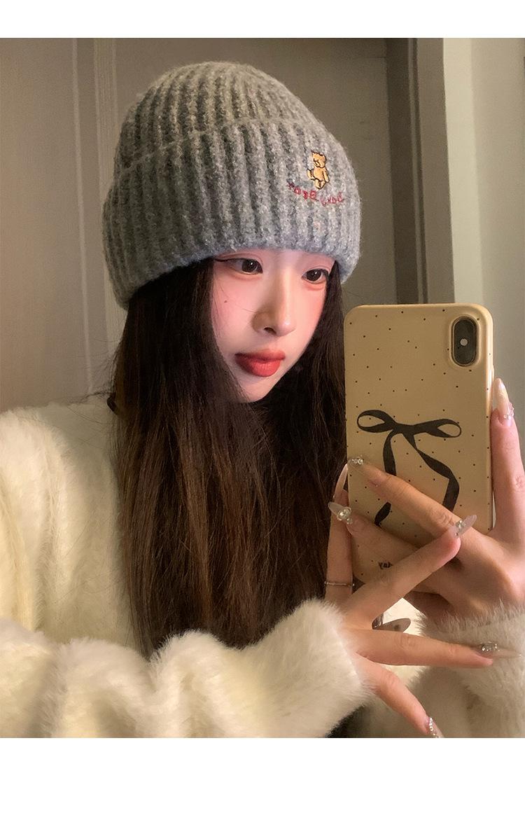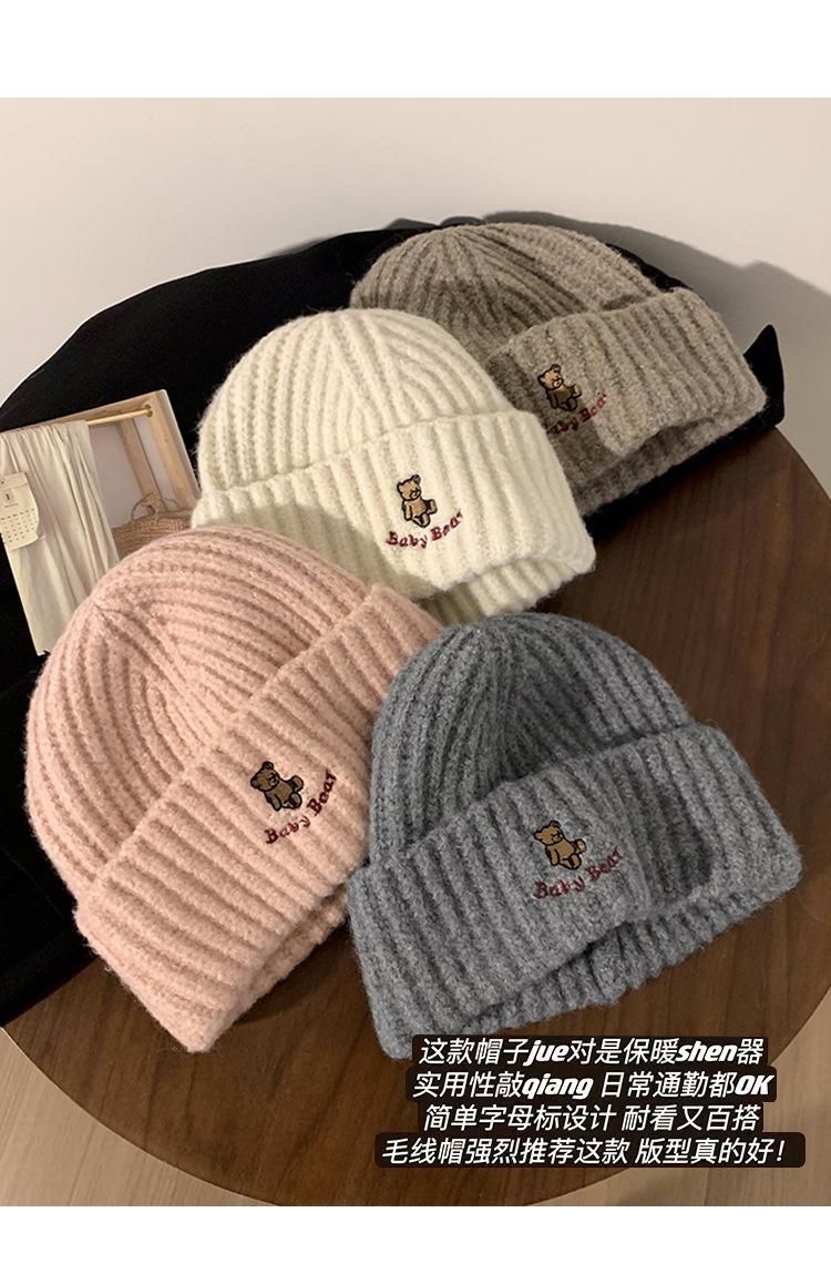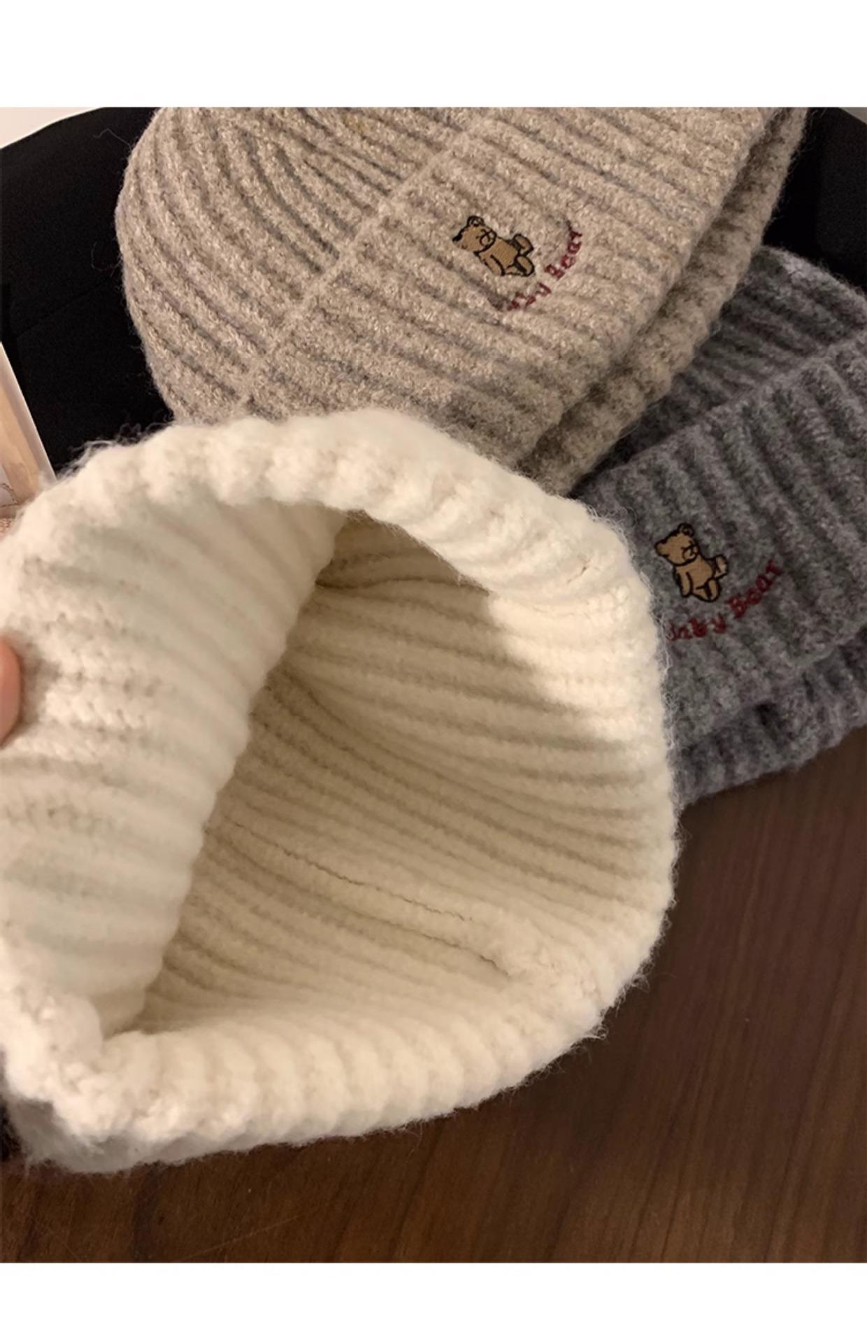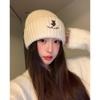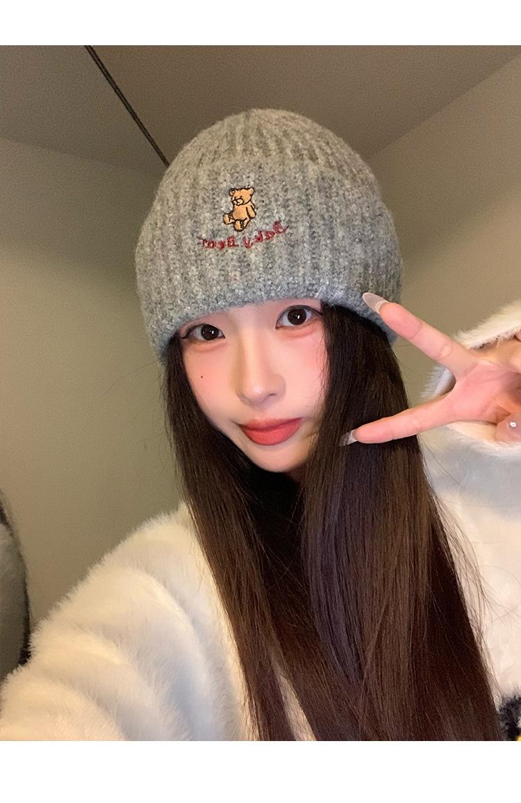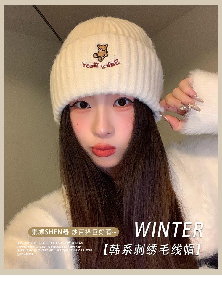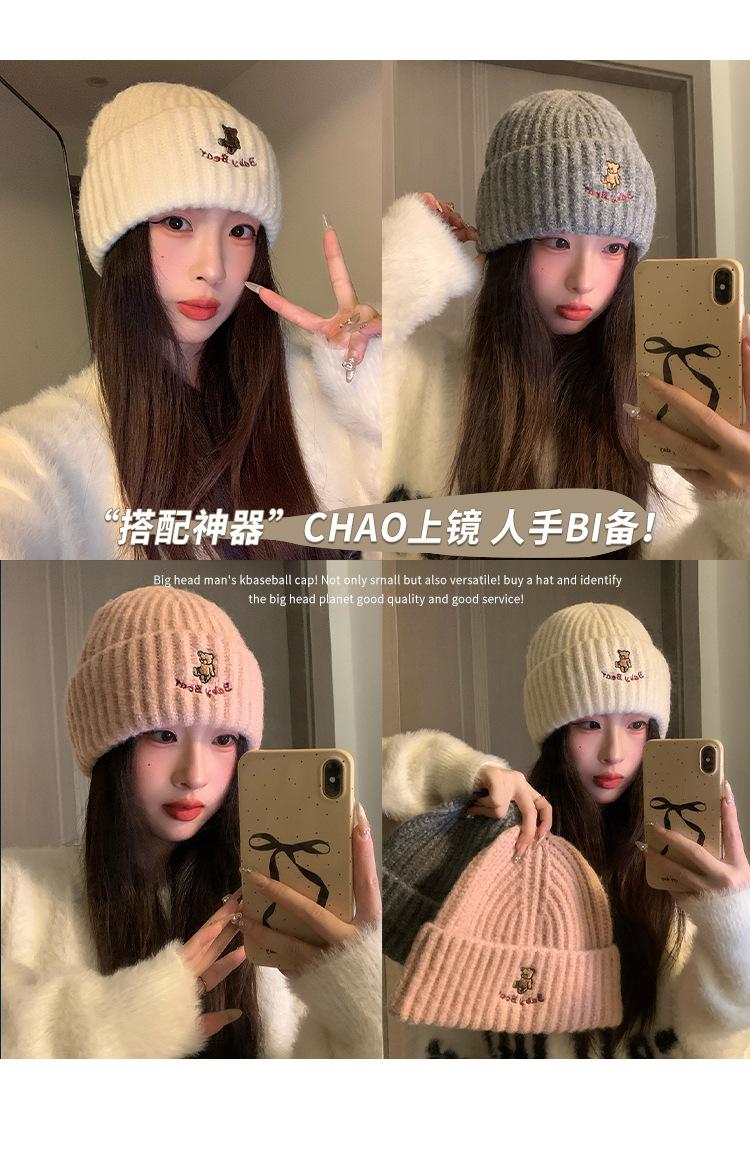 Gorro de lana pequeño con cara de oso para mujer, gorro coreano para el frío, cálido, de punto, con protección para las orejas, para otoño e invierno.