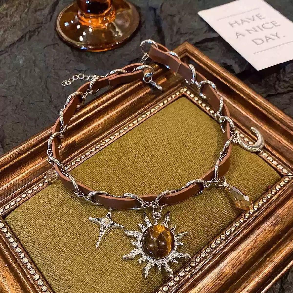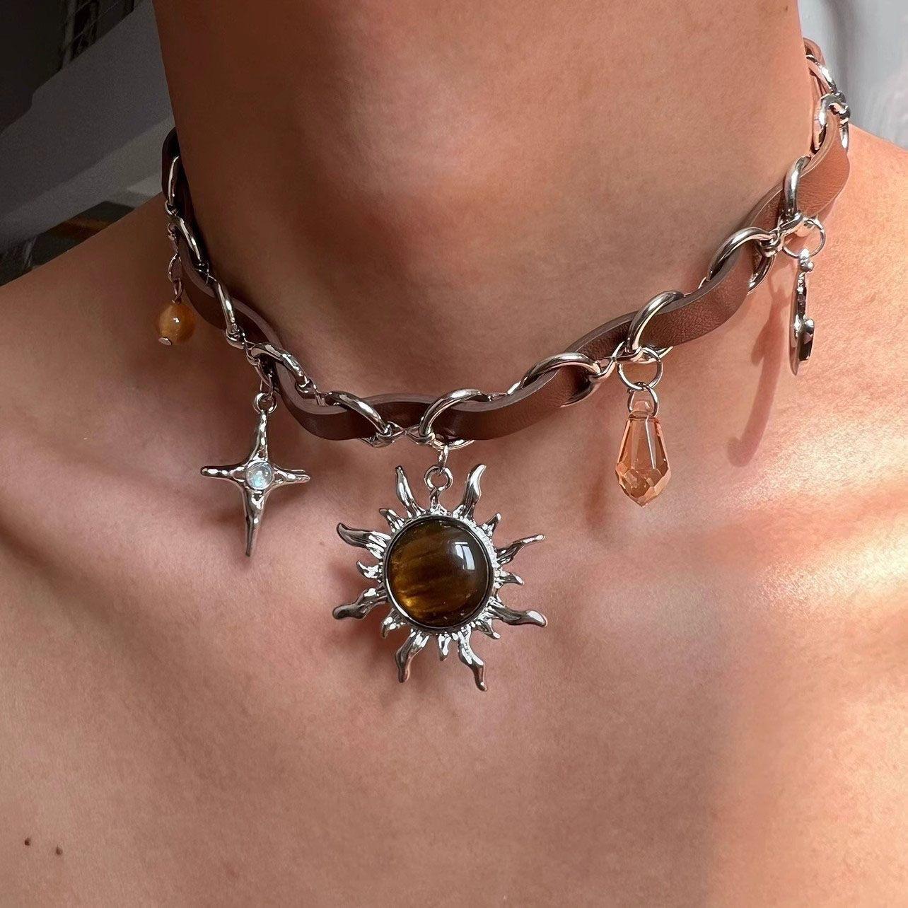 Collar de Sol con Empalme de Cuero para Mujer 2024 Nuevo Collar Gargantilla Cadena Clavícula Diseño Nicho Moda Estilo Étnico Collar