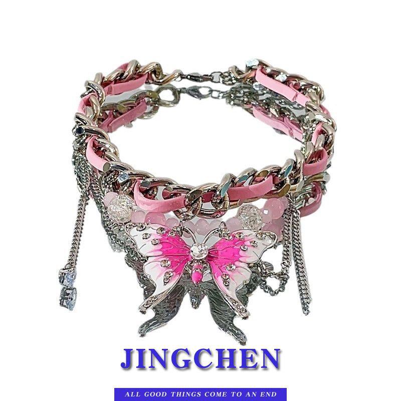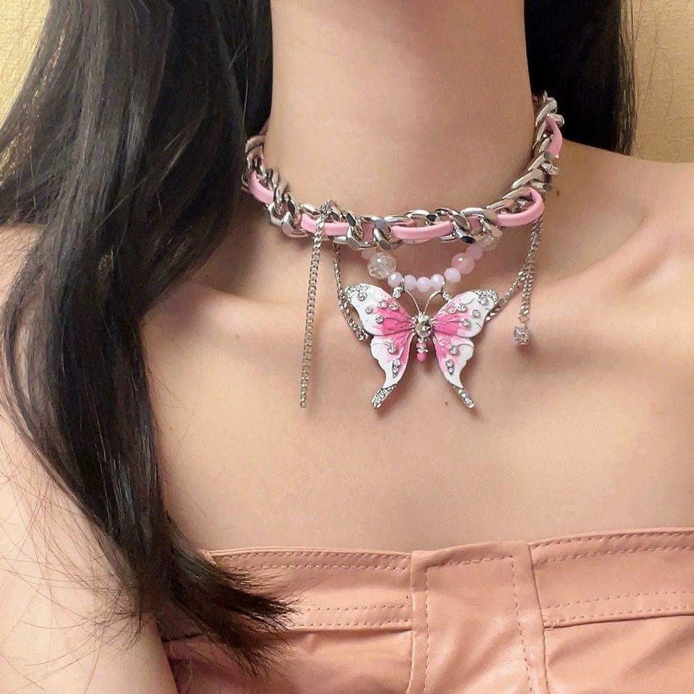 Collar de Mariposa Rosa con Costuras de Cuero para Mujer Gargantilla Diseño Nicho Dulce Cool Estilo Spice Girl Accesorios
