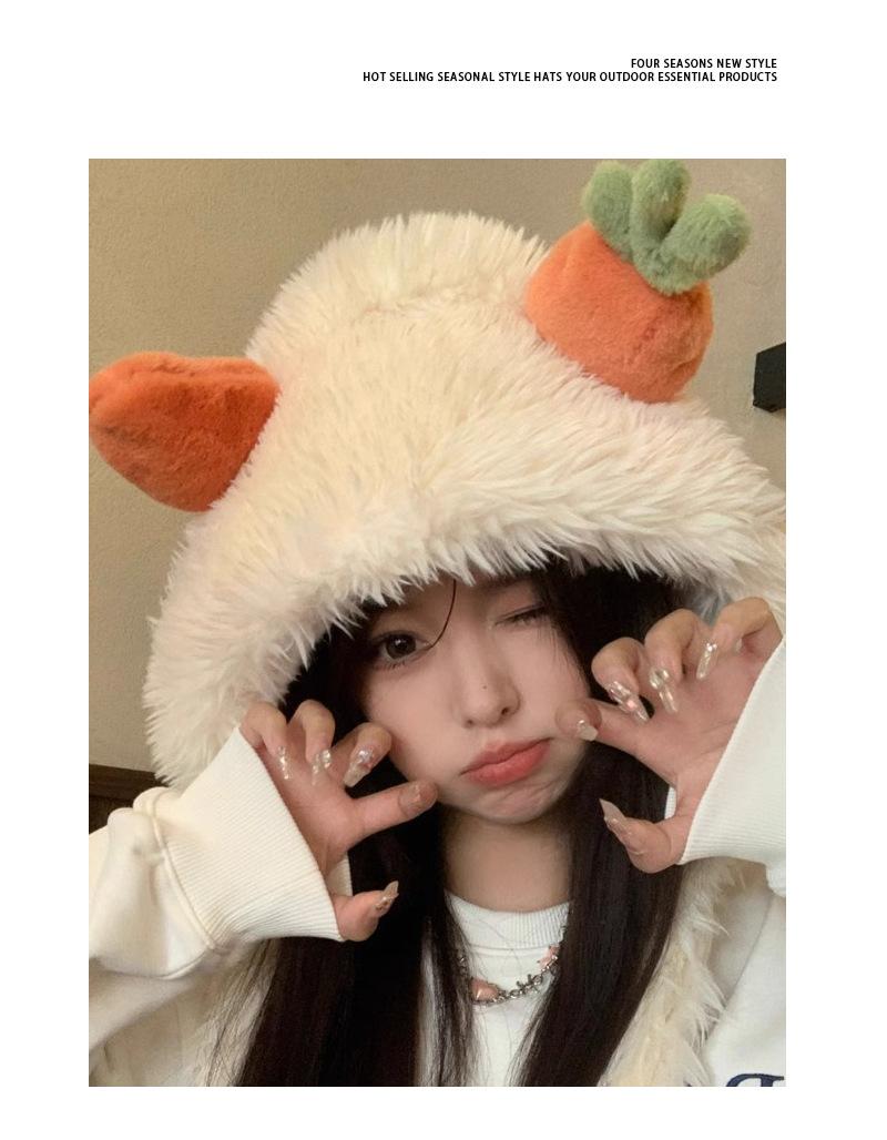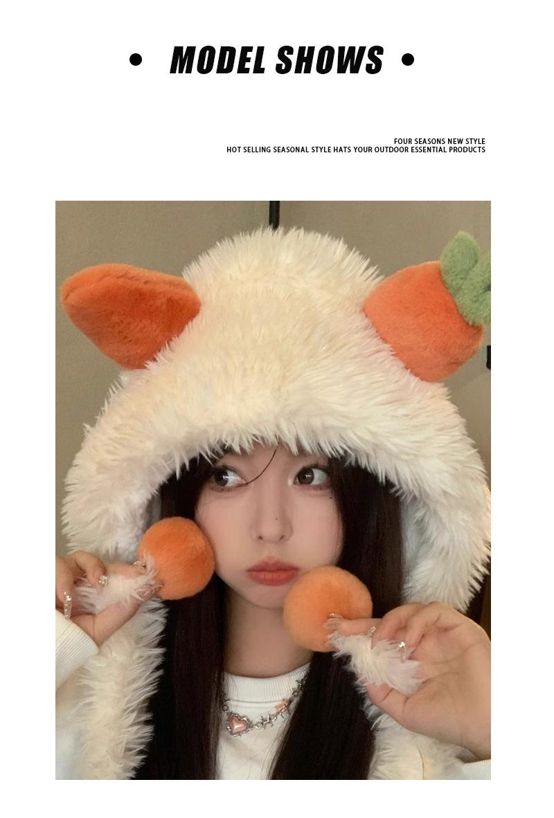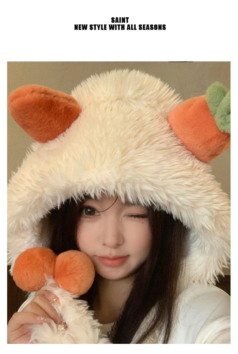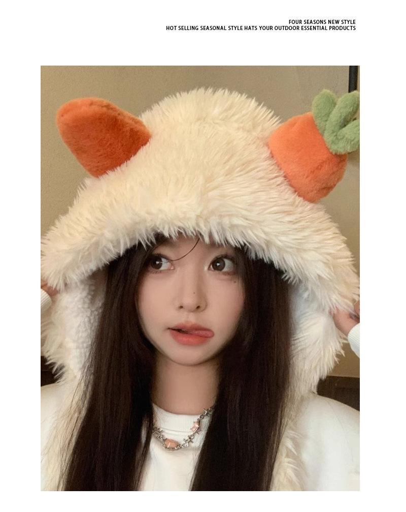 Gorro de zanahoria para mujer, bonito gorro de invierno con pelo de Lei Feng, pequeño, cálido, grueso, resistente al frío, de felpa, con protección para las orejas.