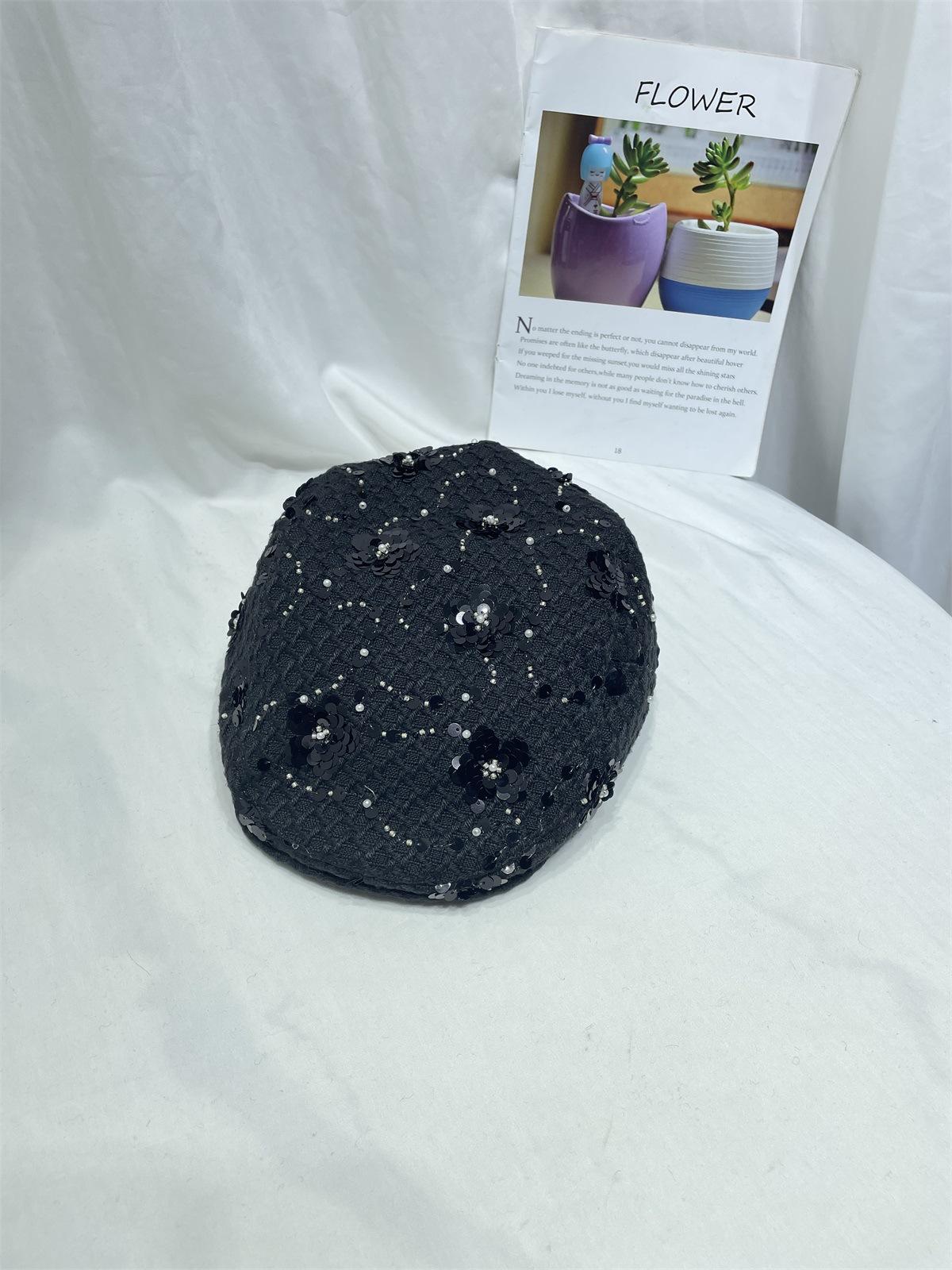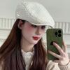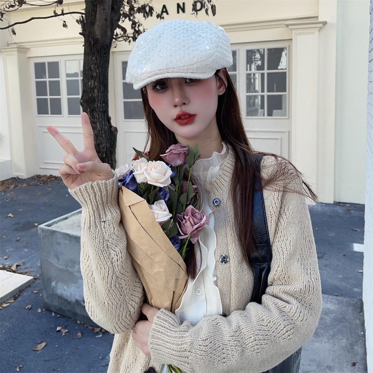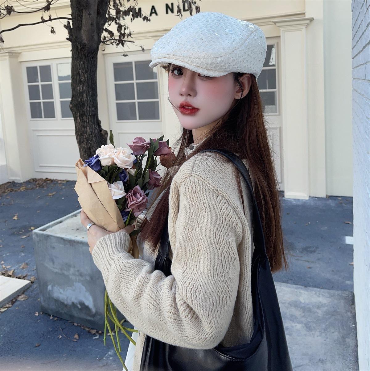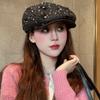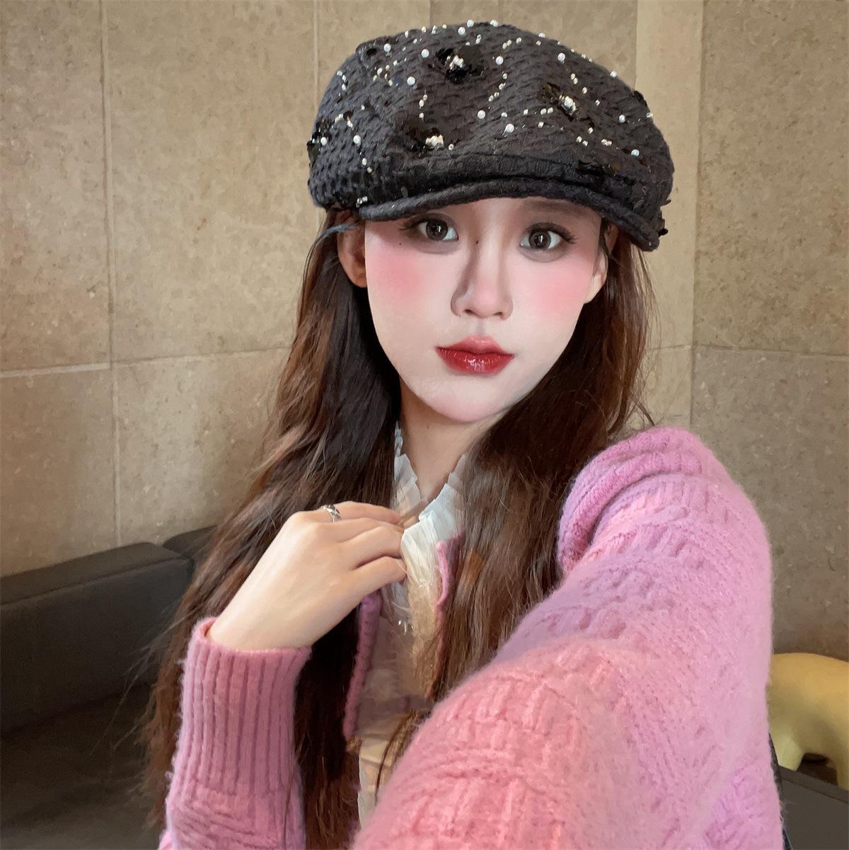 Gorra de nicho retro con lentejuelas y flor hacia adelante para mujer, otoño e invierno, moda coreana elegante, boina de pintor, gorra combinable