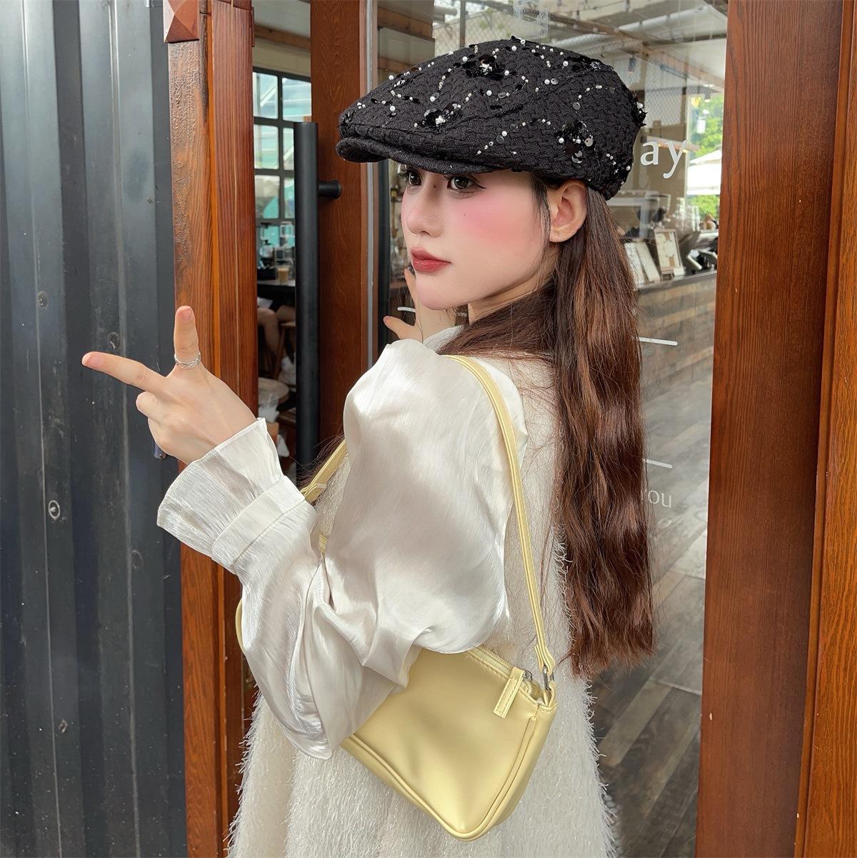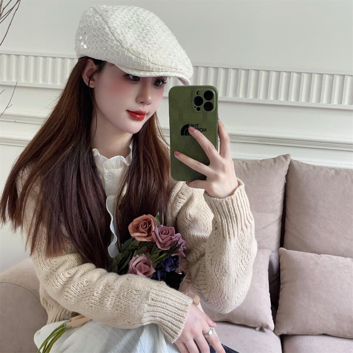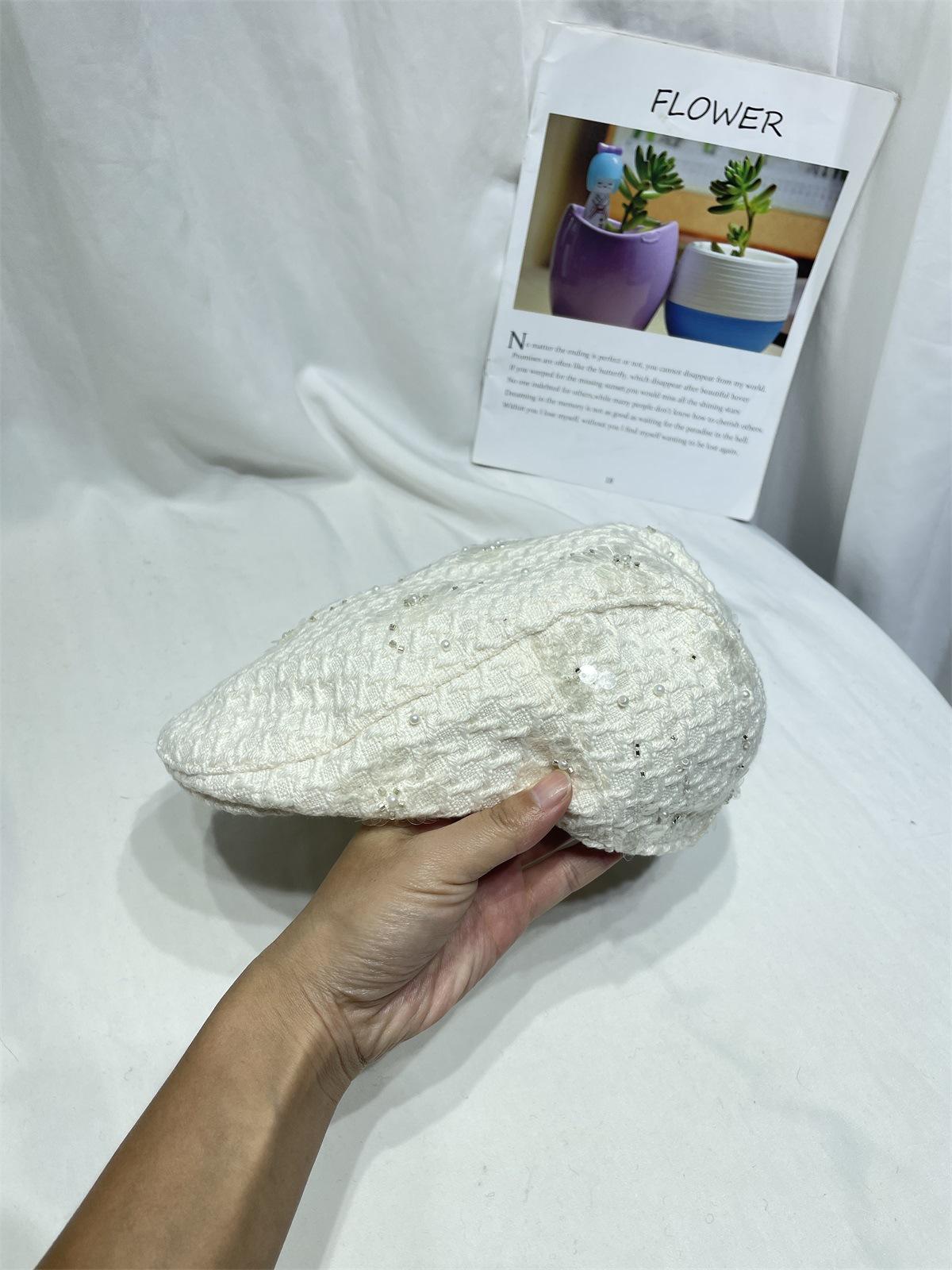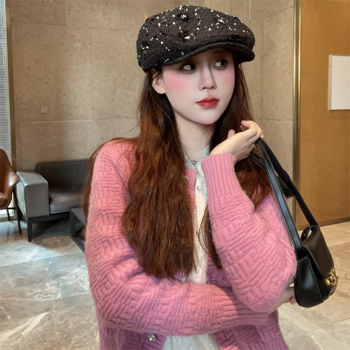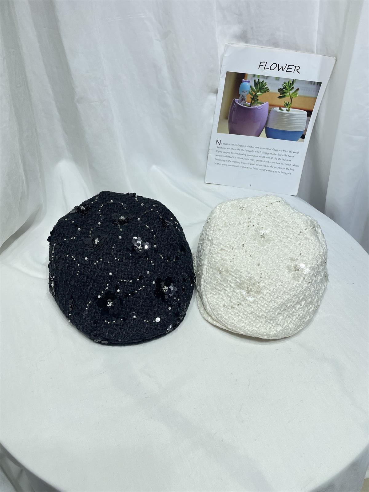 Gorra de nicho retro con lentejuelas y flor hacia adelante para mujer, otoño e invierno, moda coreana elegante, boina de pintor, gorra combinable