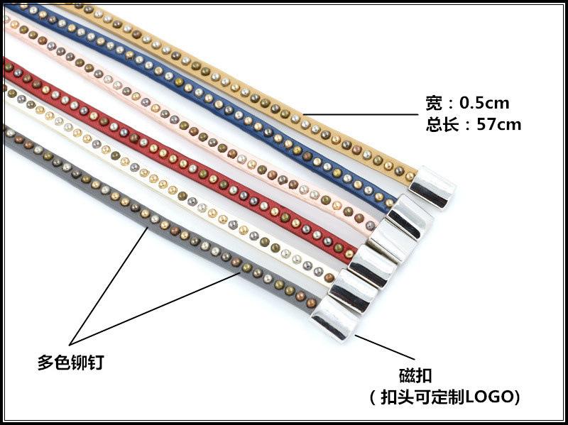 | Nombre: Pulsera de remaches para pareja Material: PU + remaches de cuatro colores + hebilla magnética Artesanía: Puramente hecho a mano Color: A#, B#, C#, D#, E#, F# Tamaño: 0.5cm de ancho, 57cm de largo Peso: unos 12 gramos Embalaje: 1 pieza/bolsa opp, 12 piezas en una bolsa opp grande ------------------------------------------------------------------------------------------------------- Debido a los diferentes métodos de medición, habrá ligeras diferencias en tamaño y peso, lo que no es un problema de calidad del producto. |