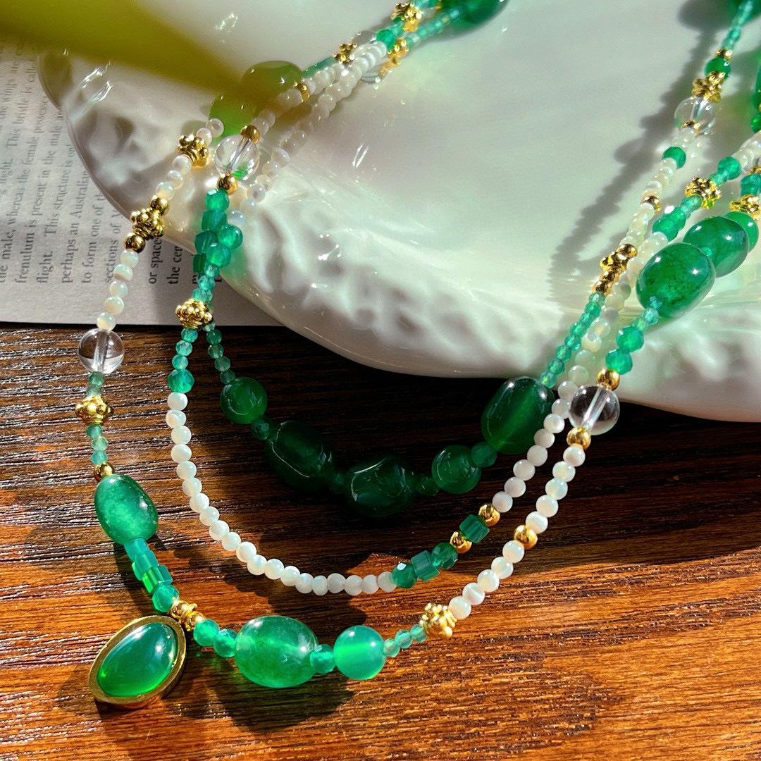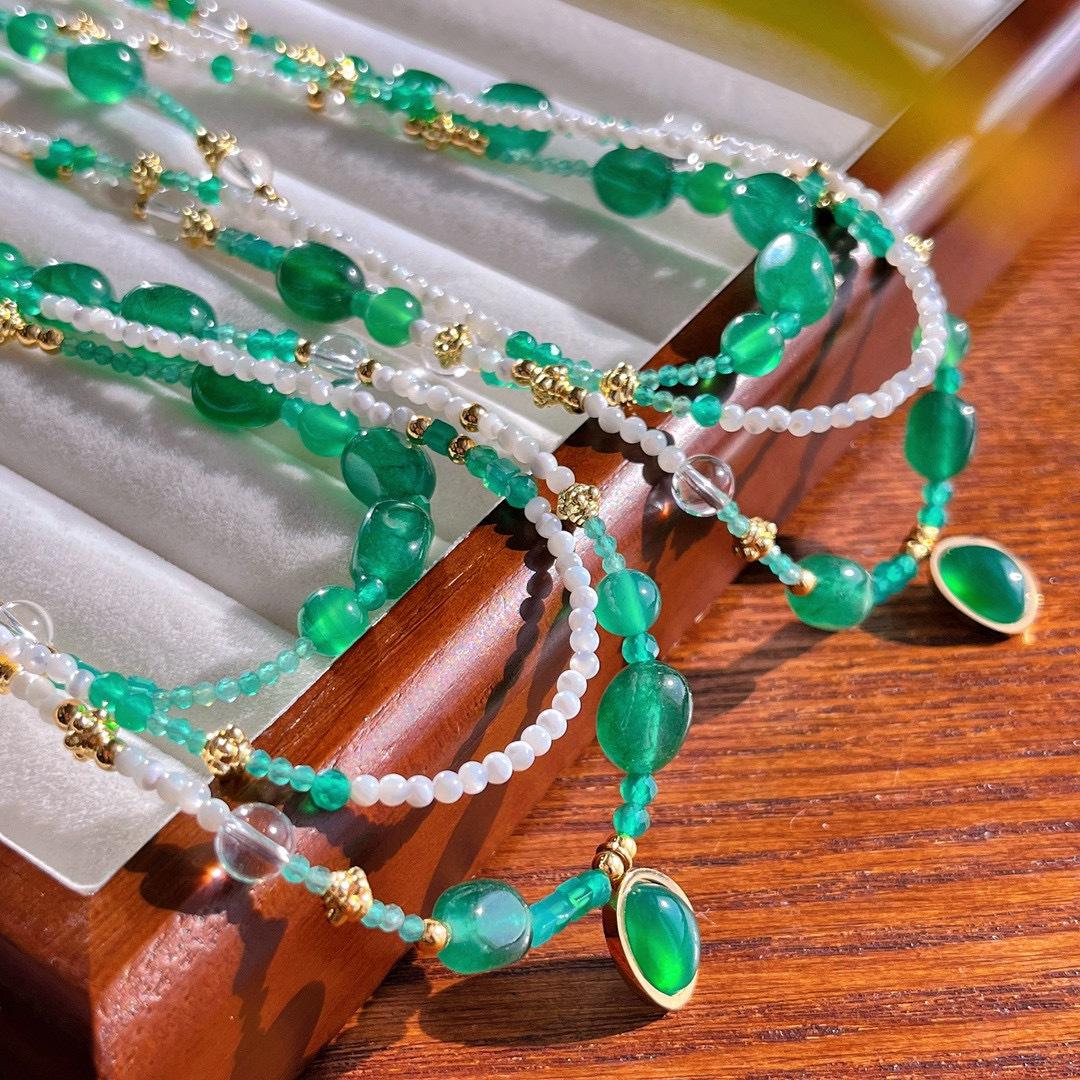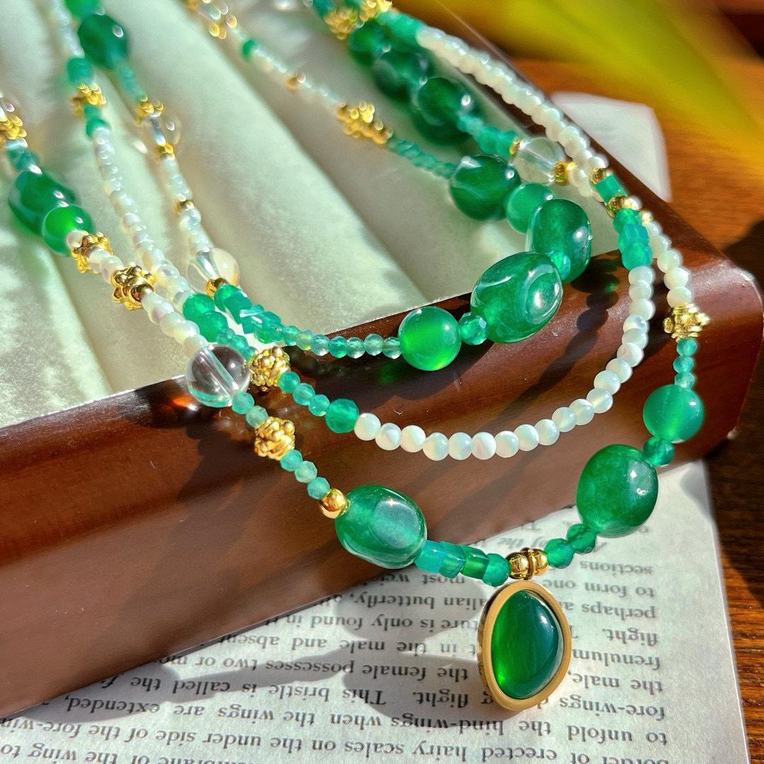 Otoño e invierno estilo nacional retro natural de alta calidad concha calcedonia verde cristal blanco cadena clavicular collar cadena de noche