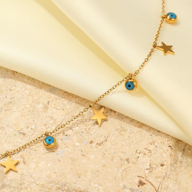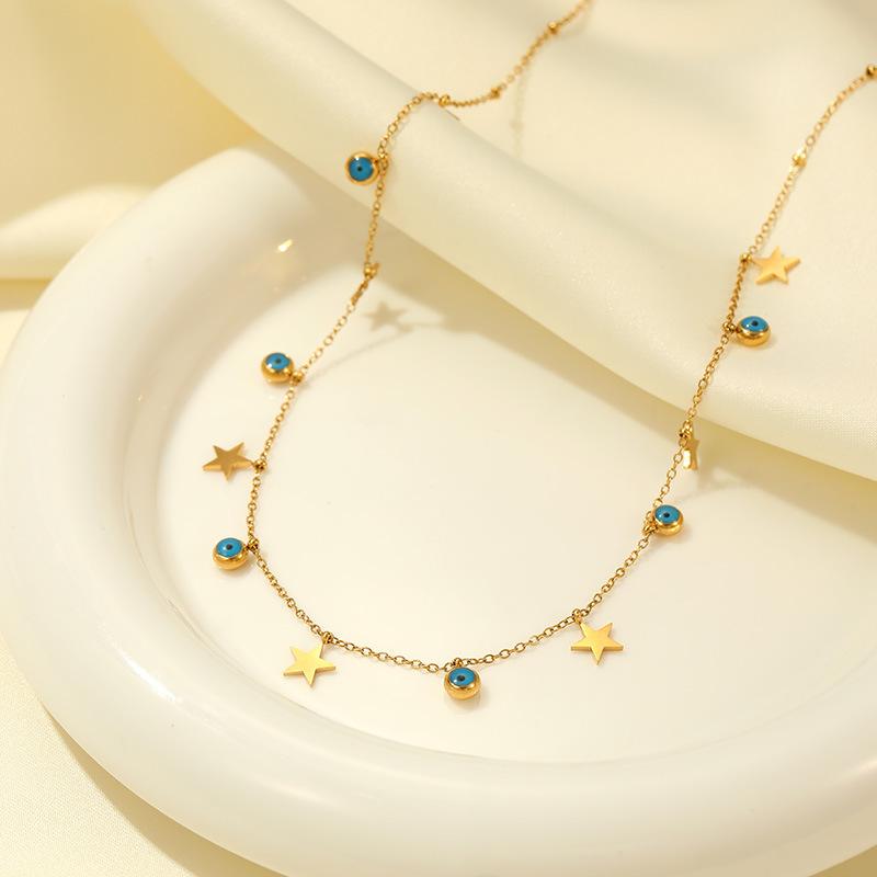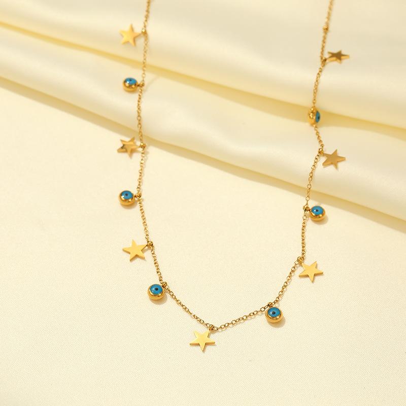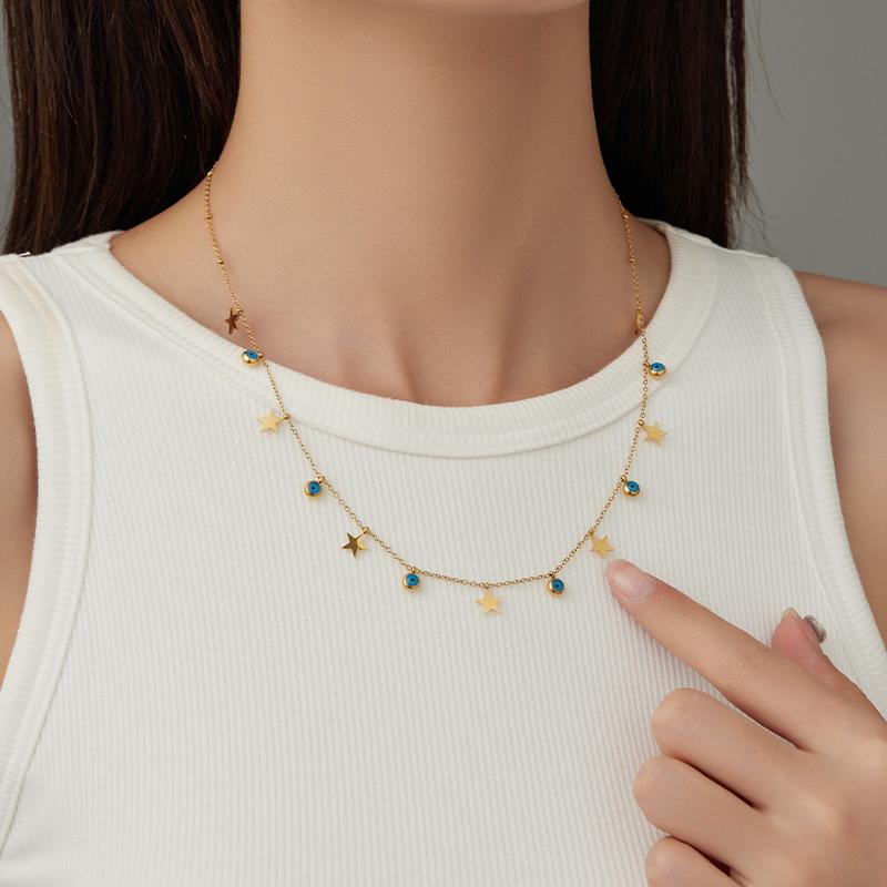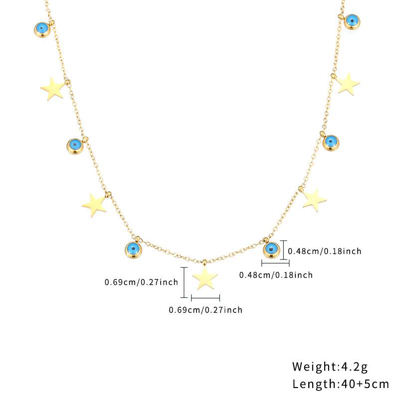 N.º de artículo: N2486-GO Tamaño: Largo de cadena 40+5 cm, ancho 1,1 mm, estrella 6,9 mm, círculo 4,8 mm, cierre de langosta 10 mm, etiqueta de cola 1 cm