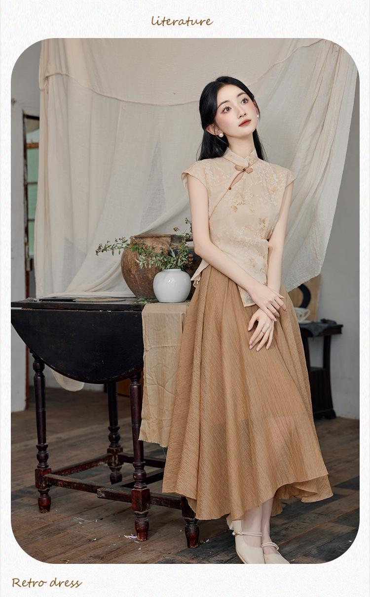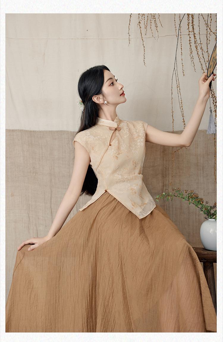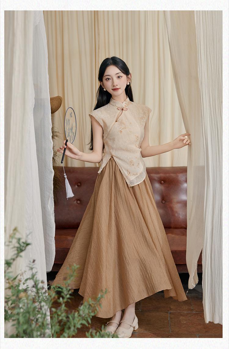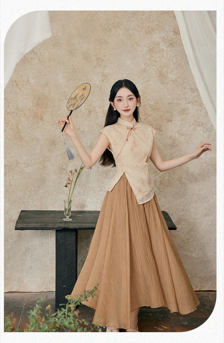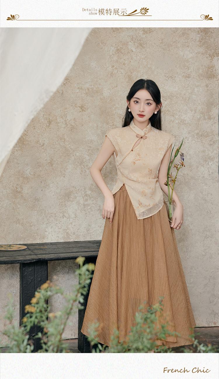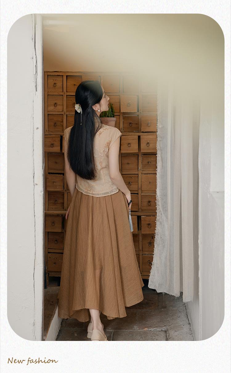 Foto Real de Tops de Manga Corta Flocados de Nueva Chinoiserie + Falda de Cintura Alta Conjunto de Ropa de Dos Piezas para Mujer Primavera y Verano 2O25
