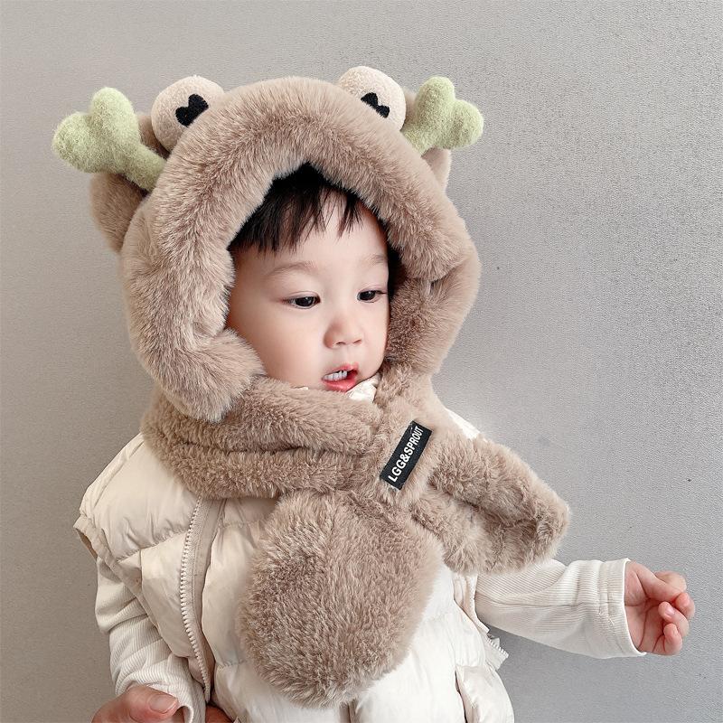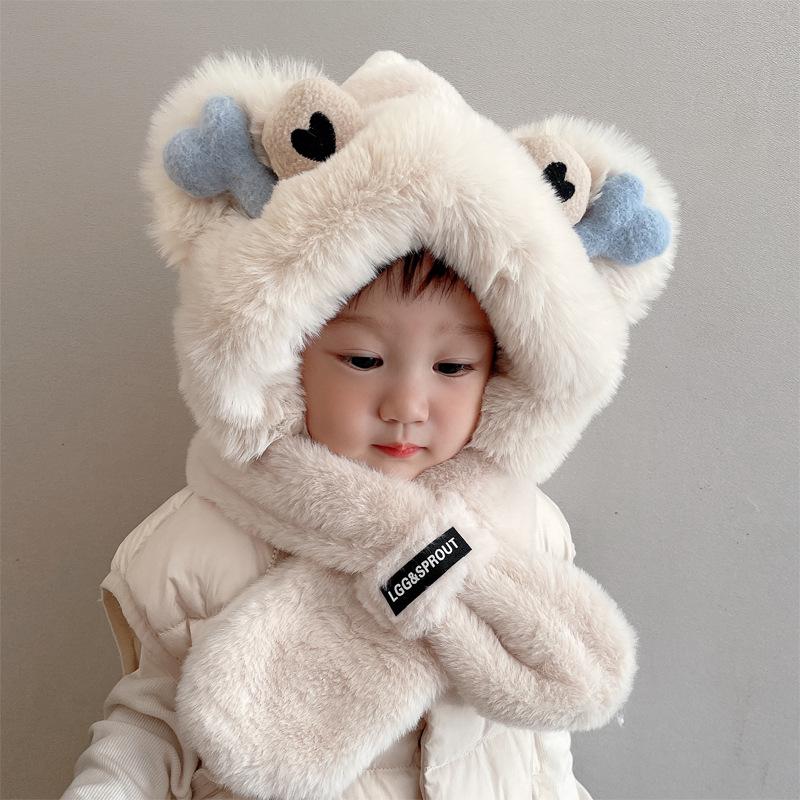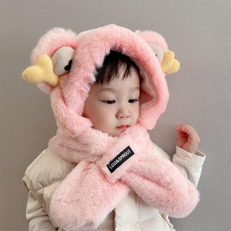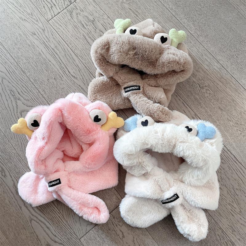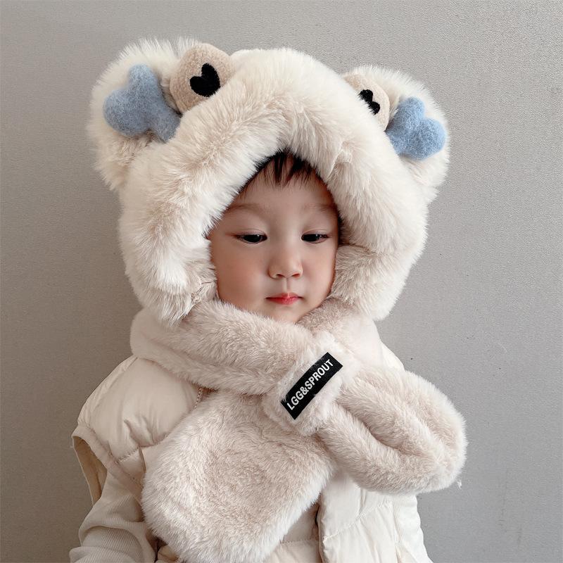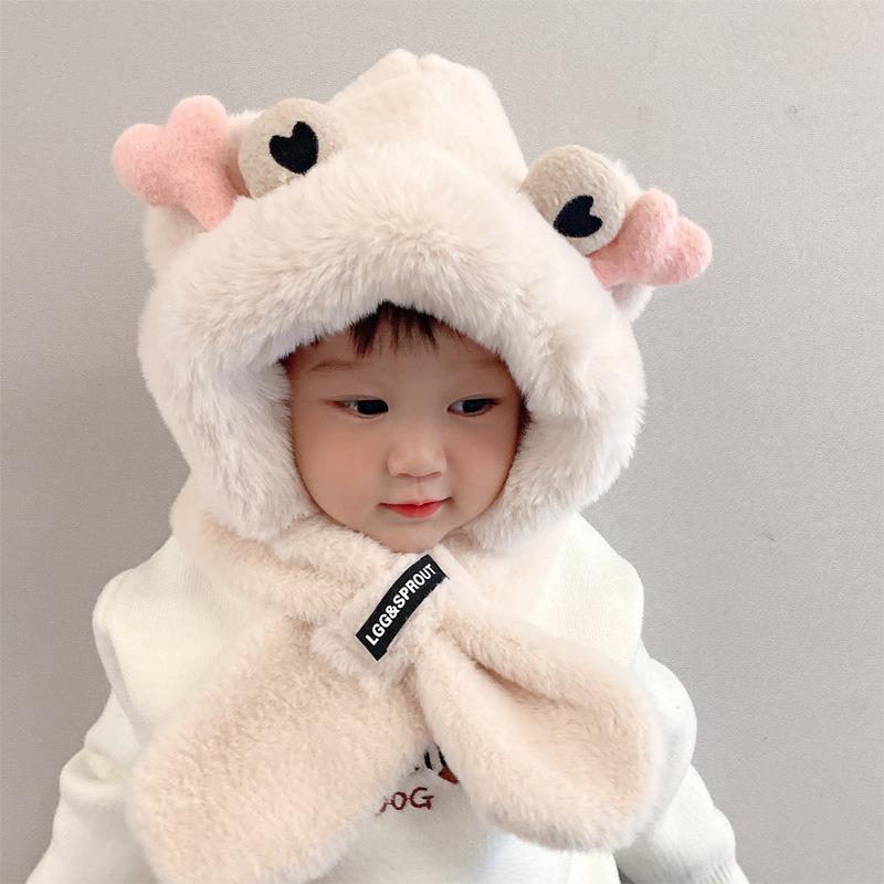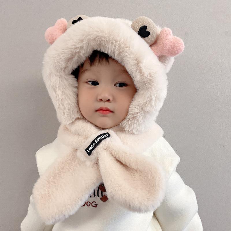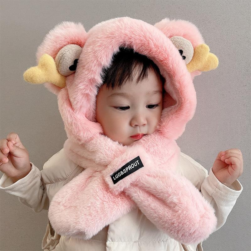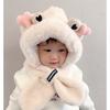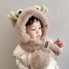 Gorro de felpa para niños, bufanda, gorro integrado, otoño e invierno, gorro con protección auditiva para niños y niñas, conjunto de dos piezas con bonitos dibujos animados