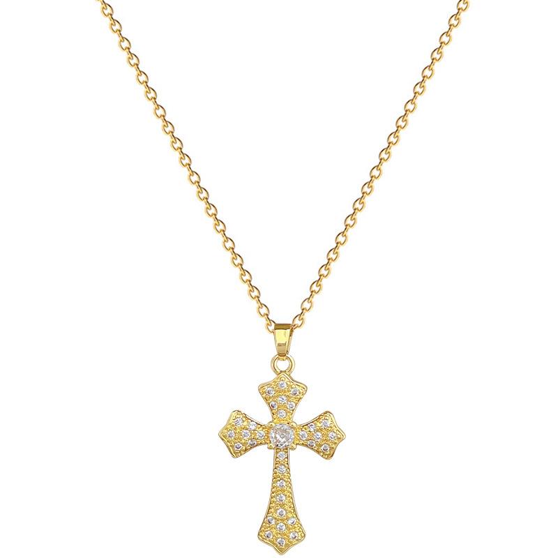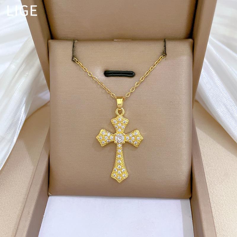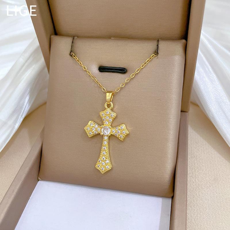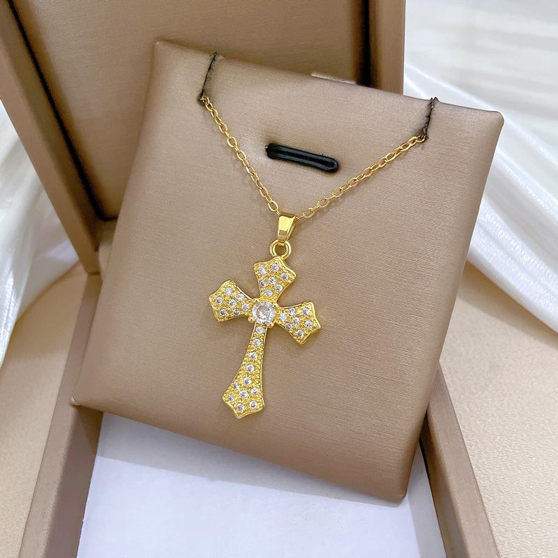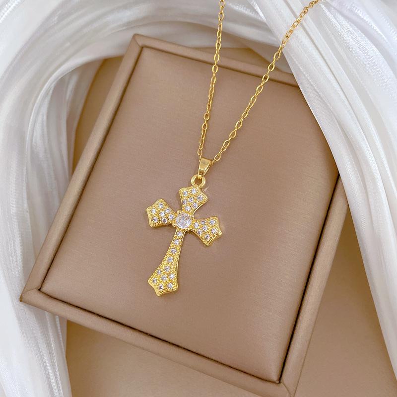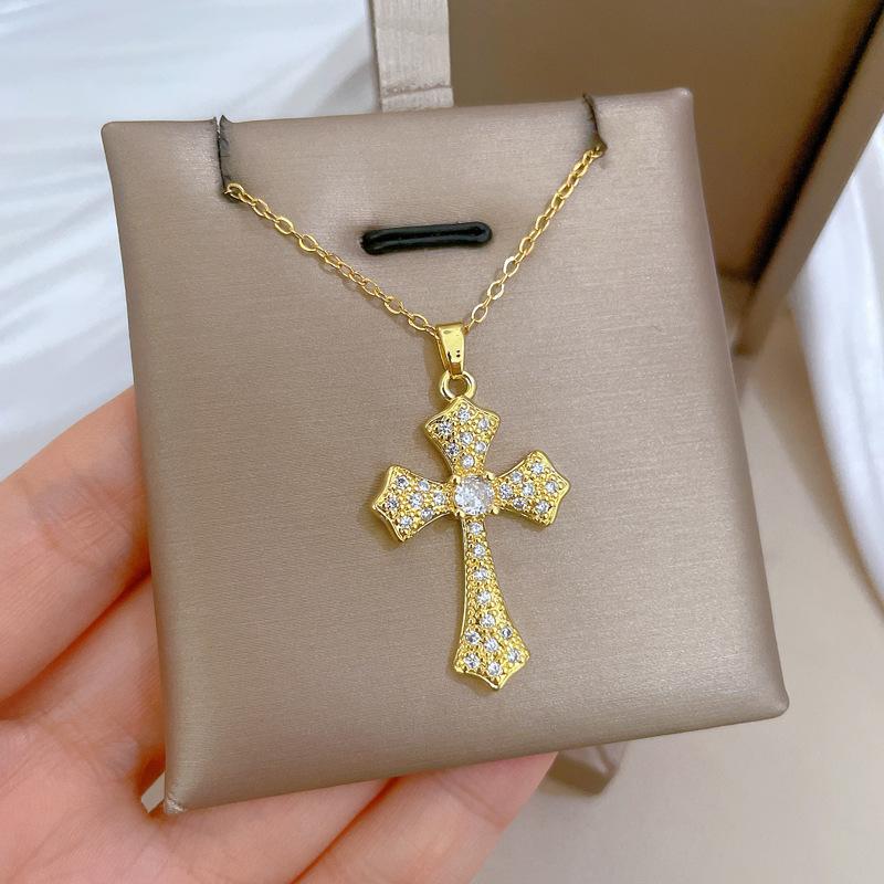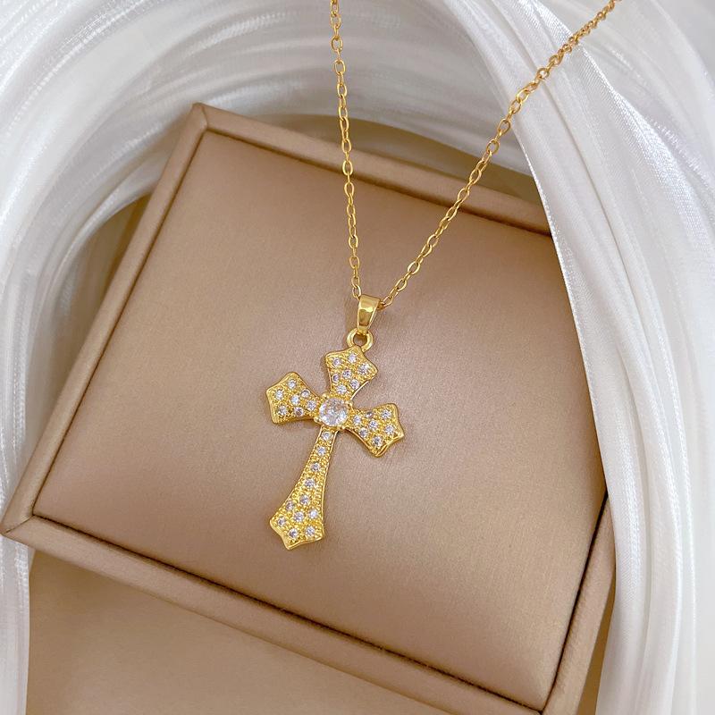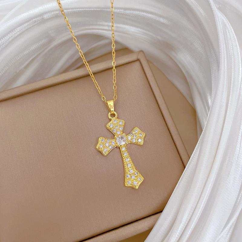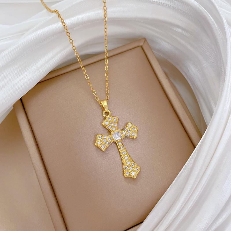 [Acero de titanio] Elegante y hermoso collar con cruz de diamantes, ligero y lleno de luz, de lujo, lleno de diamantes, cadena de clavícula para mujer, cadena de acero de titanio.