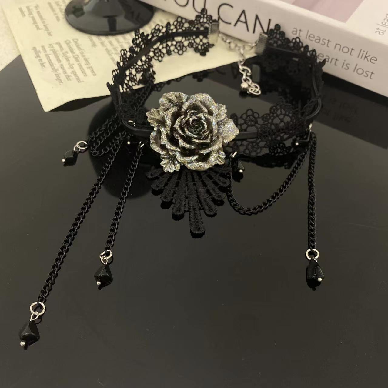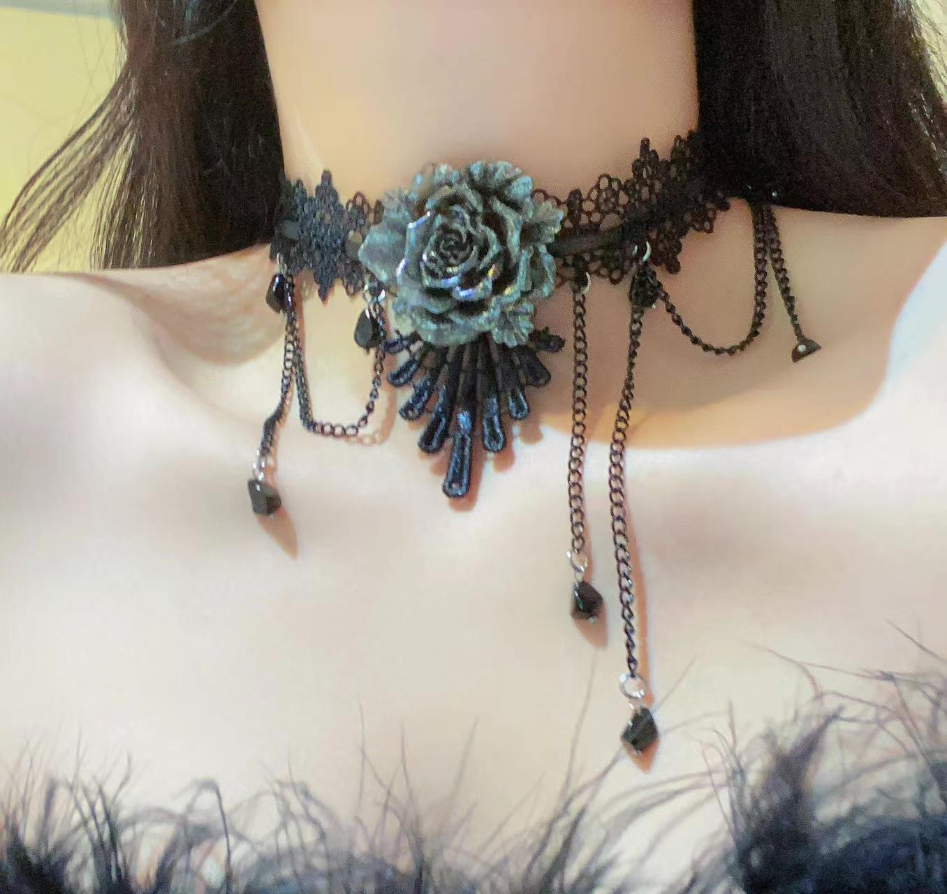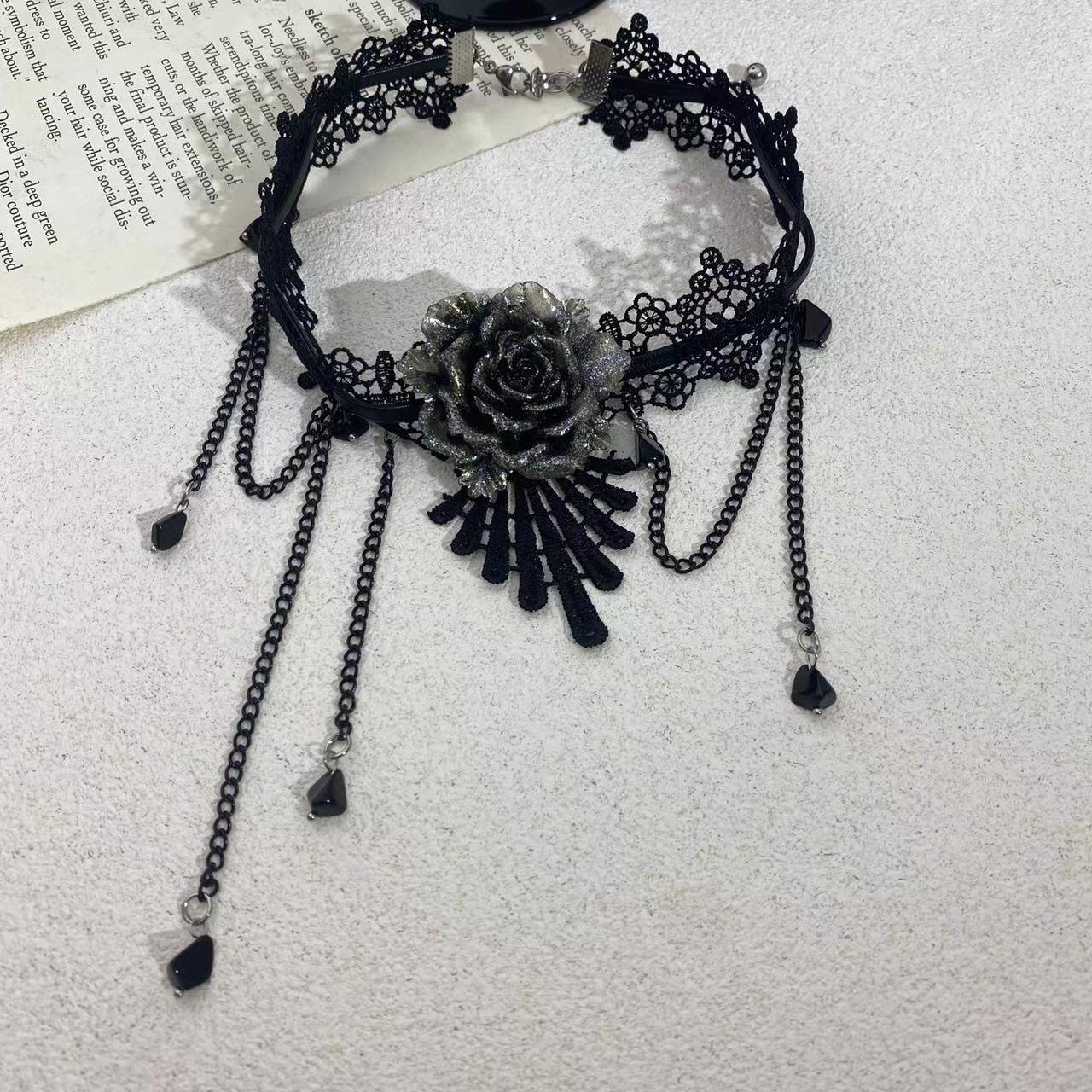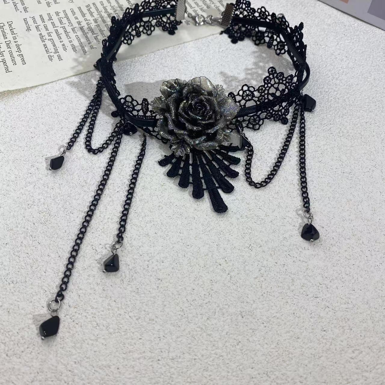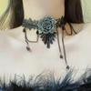 Collar decorativo de encaje negro para mujer, colgante con borlas y correa de cuello rosa, Gargantilla Diablo