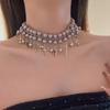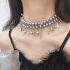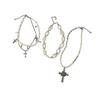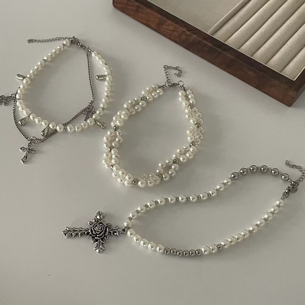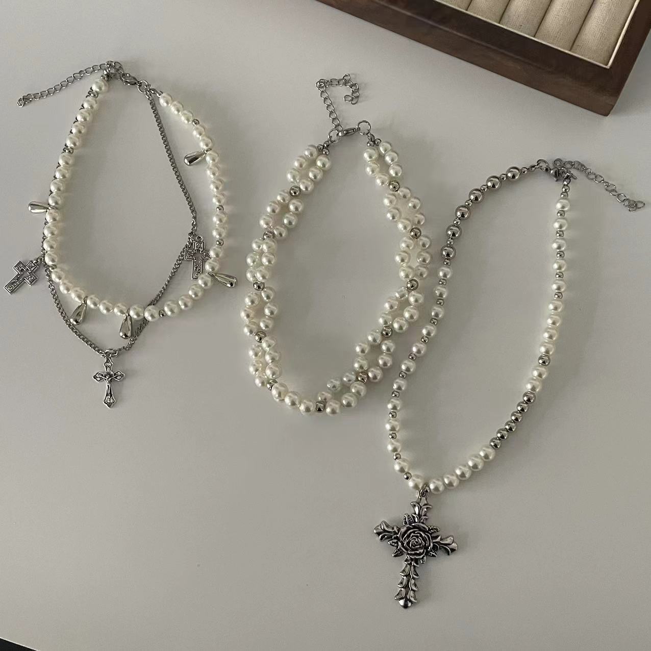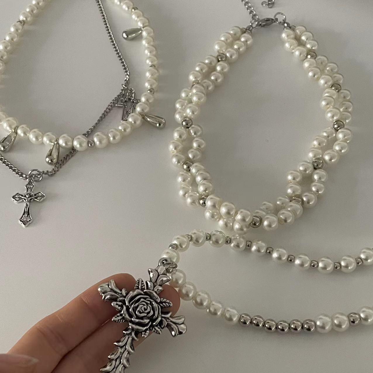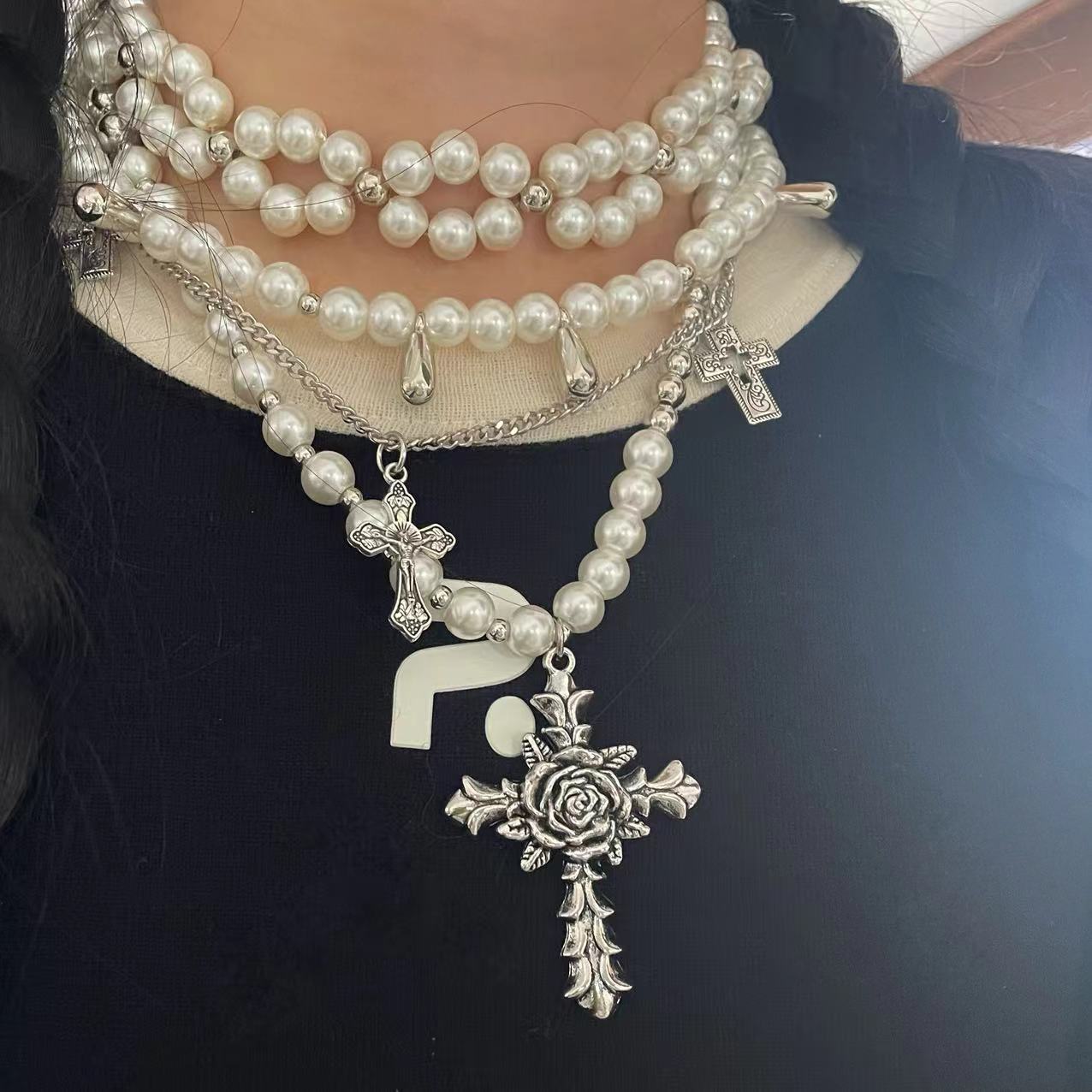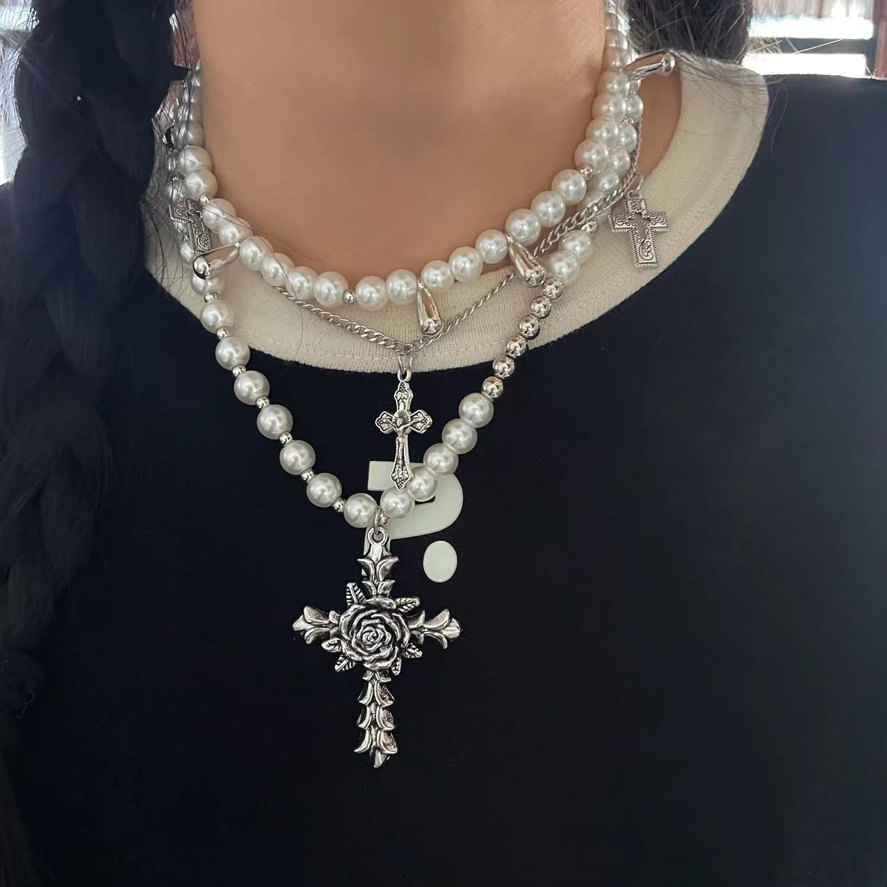 Collar de cruz de flores apiladas multicapa con perlas retro francesas, gargantilla industrial pesada, collar de cruz de perlas multicapa