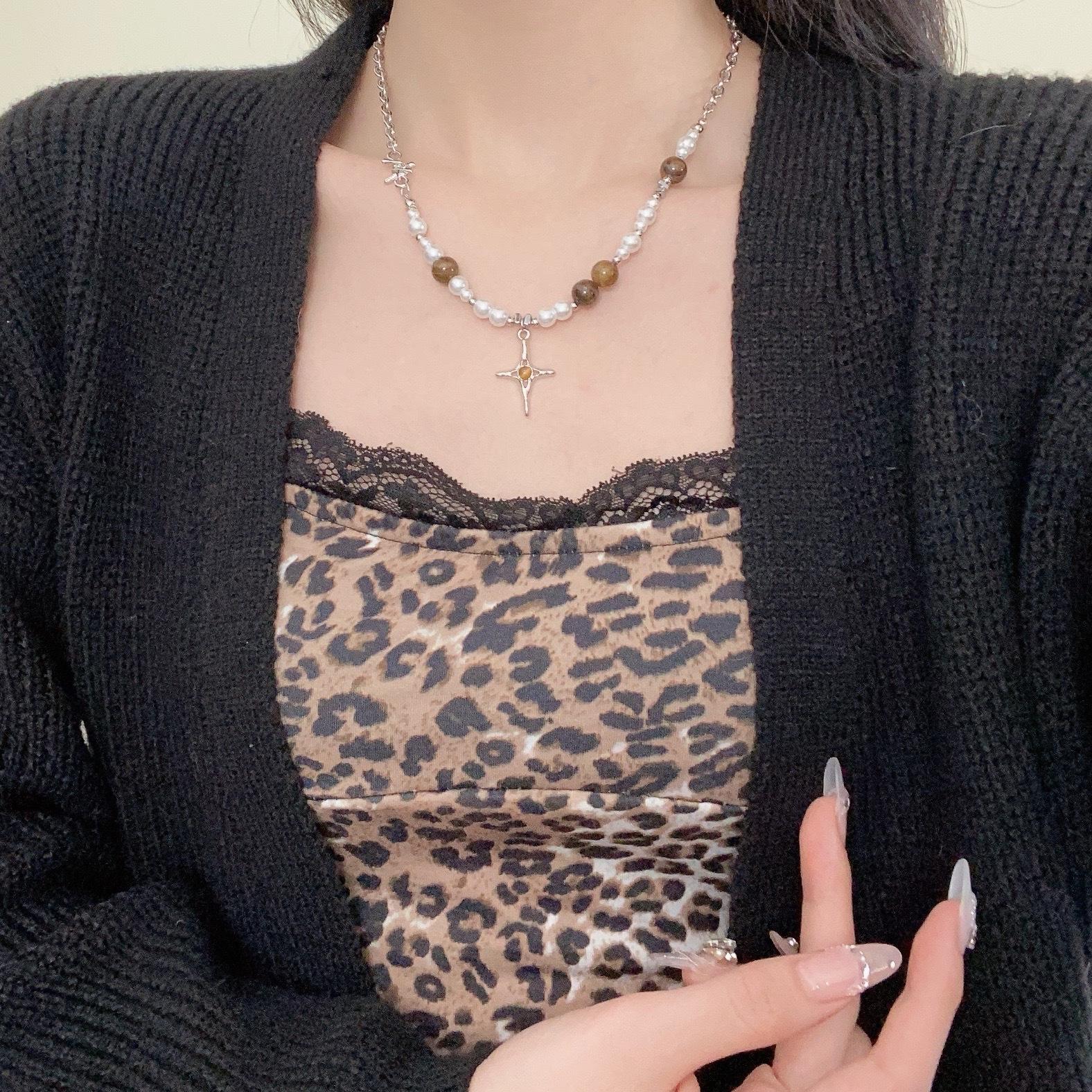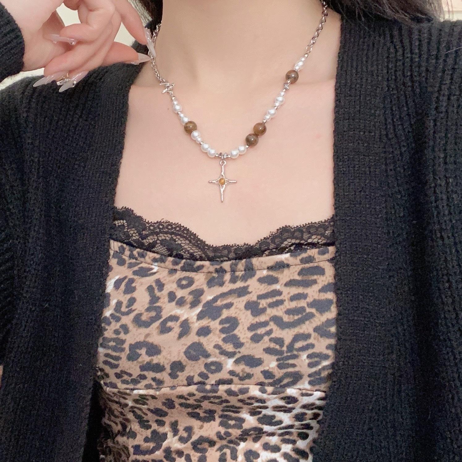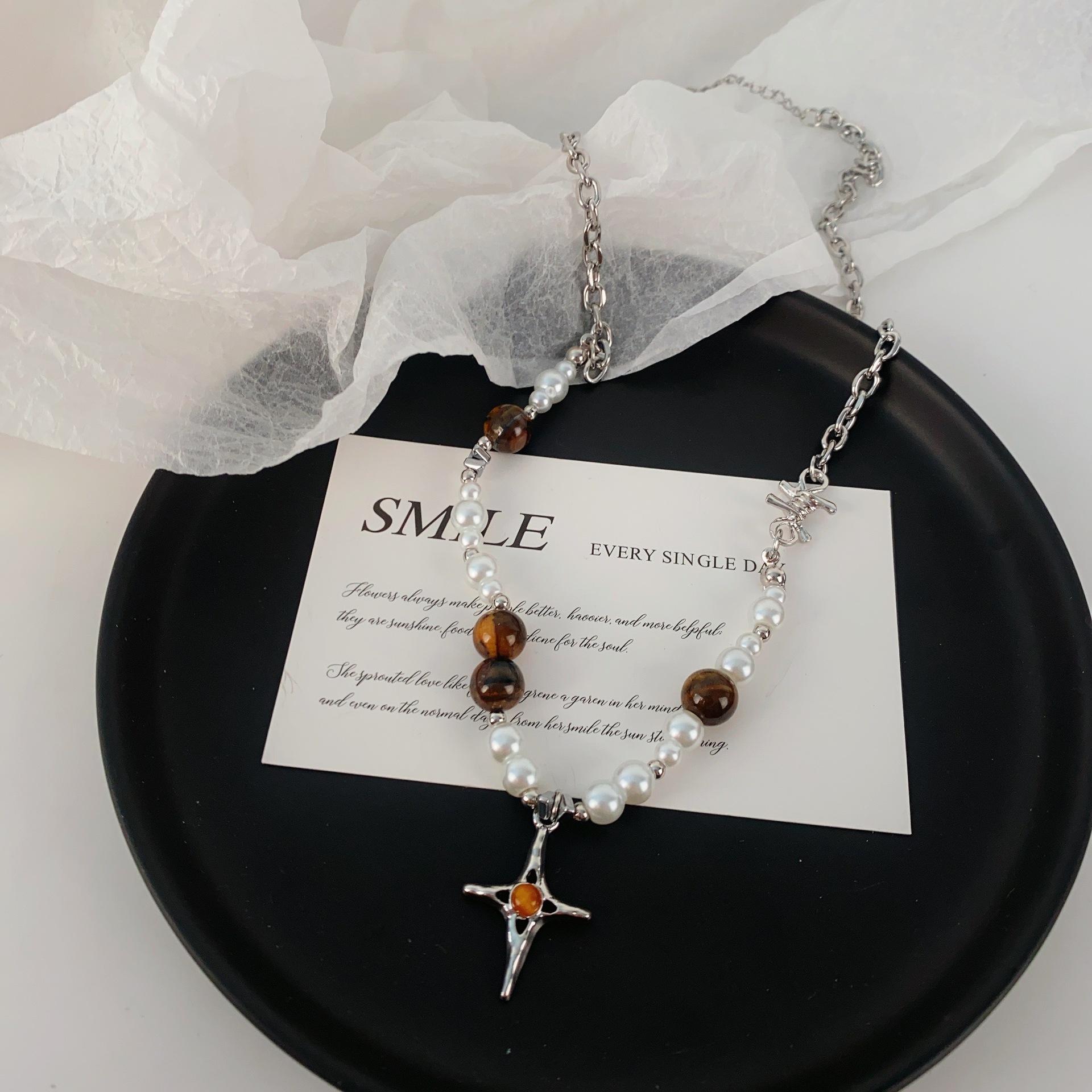 Maillard tiger eye stone imitation pearl cross clavicle chain
