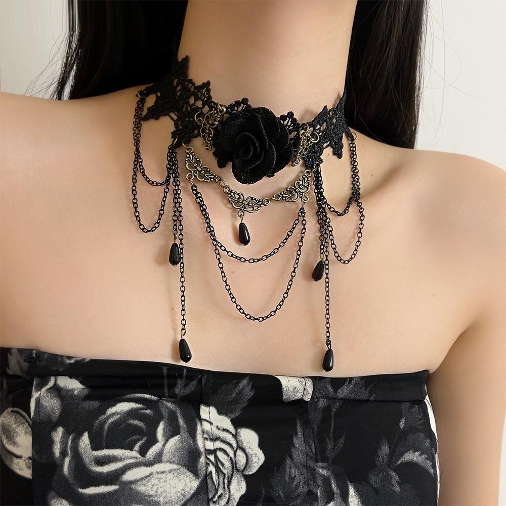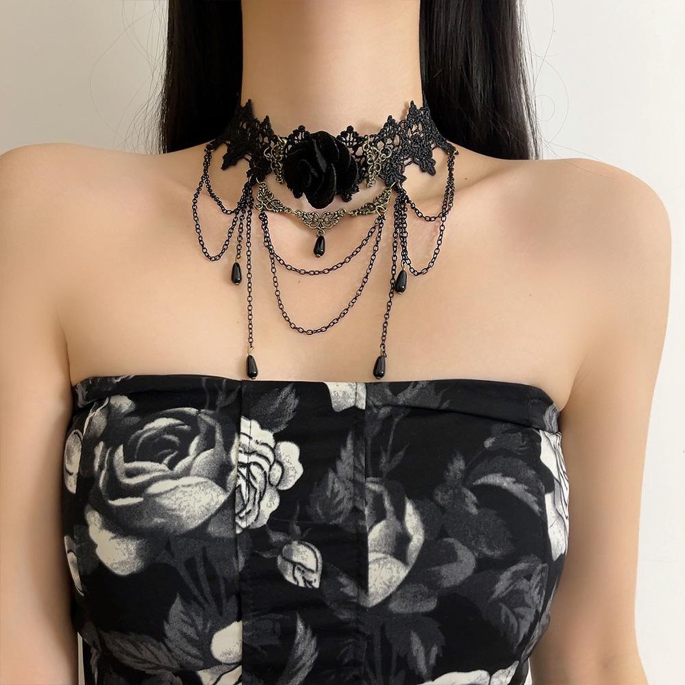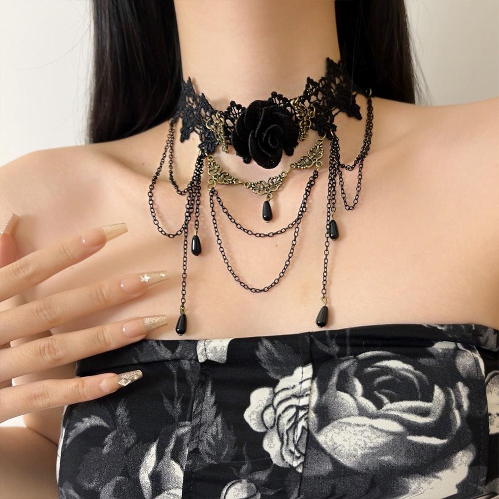 Collar Choker de Encaje de Especias Diablo Flor Vintage Gótico Gotas de Agua Borla Cadena Clavícula Nicho Distintivo Cadena de Cuello