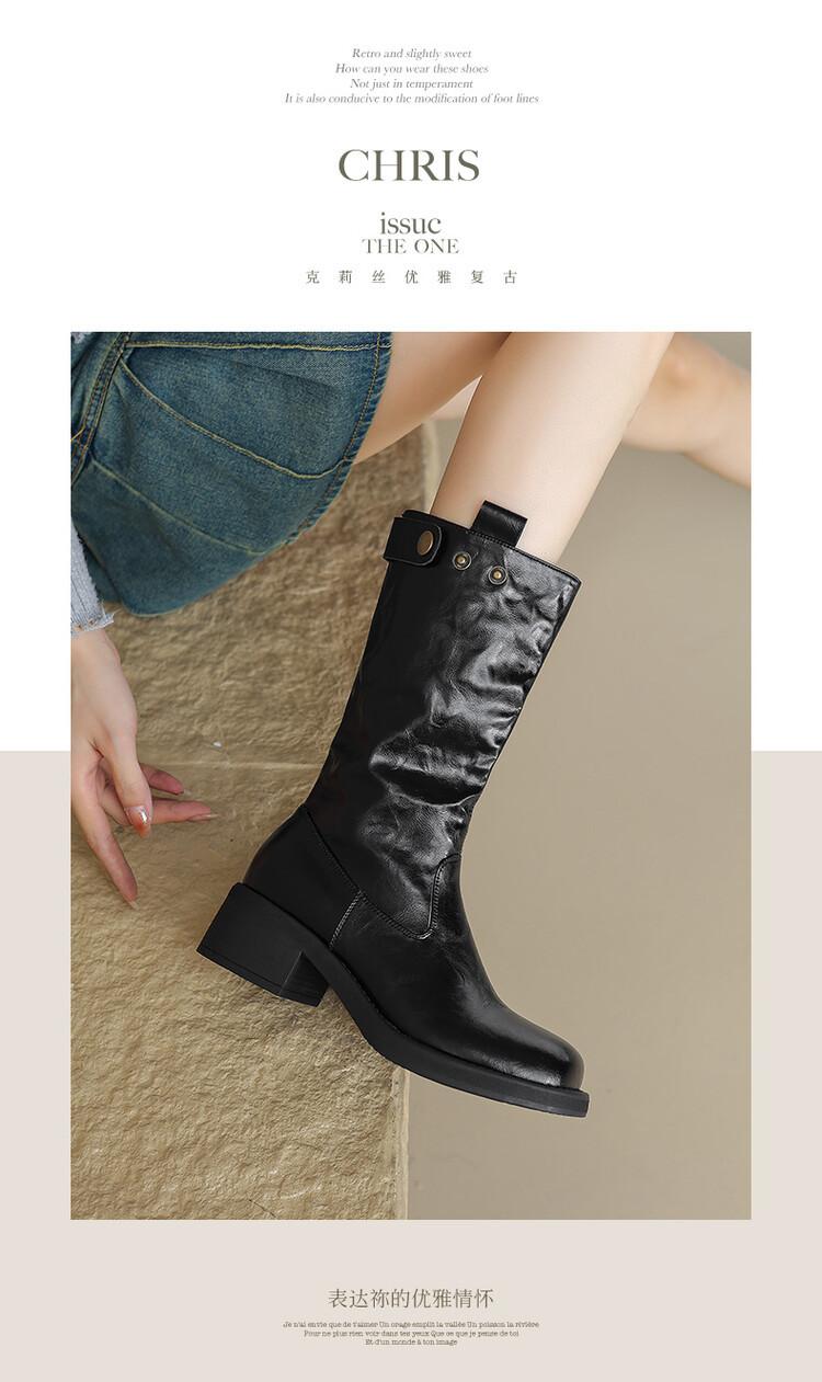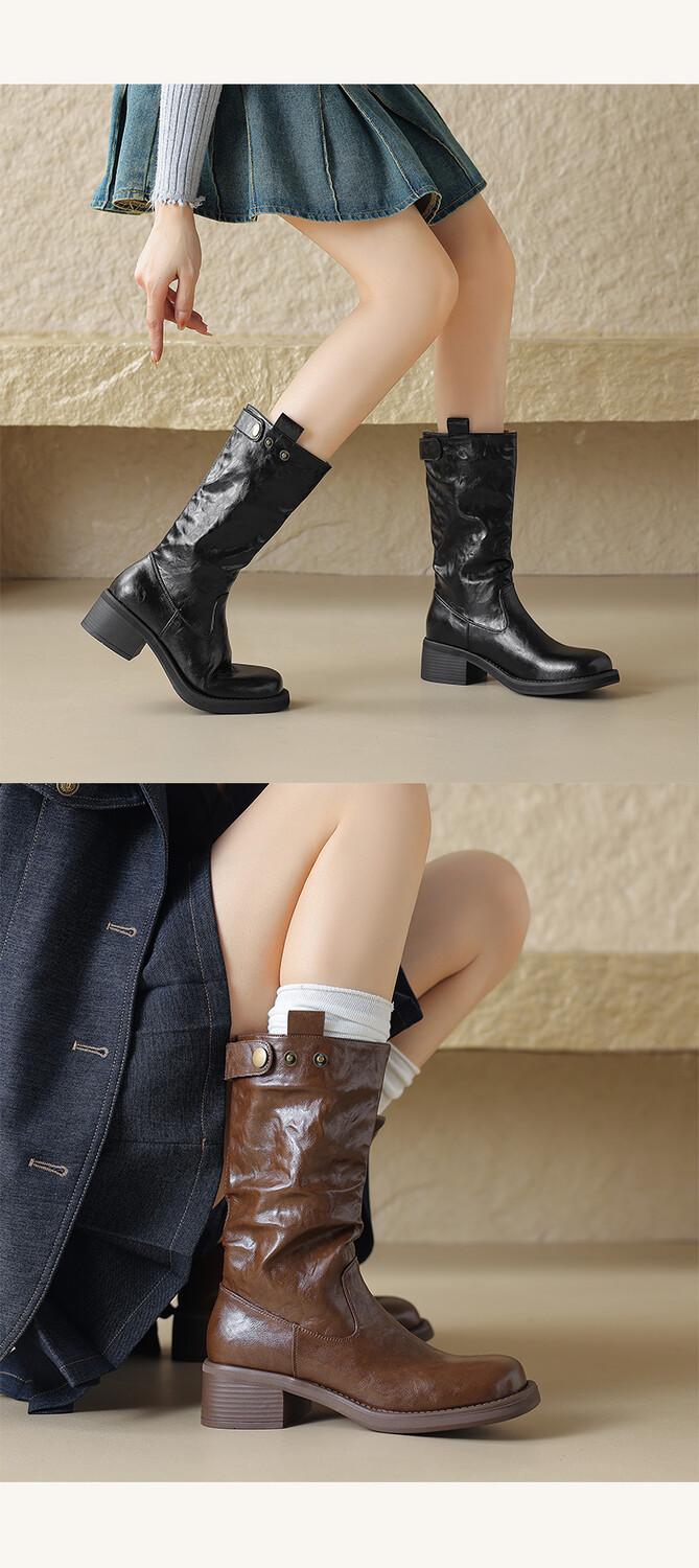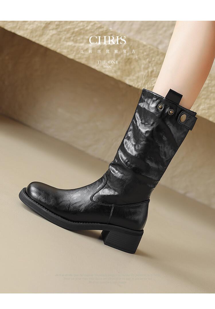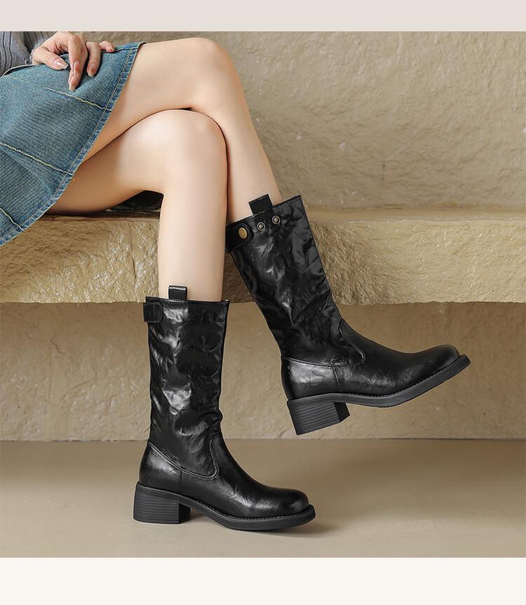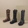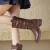 Botas retro de media caña para mujer, adelgazantes, plisadas, de piel auténtica, con forro polar, para otoño/invierno, de tacón medio grueso, estilo western europeo y americano, de mezclilla, para otoño/invierno.