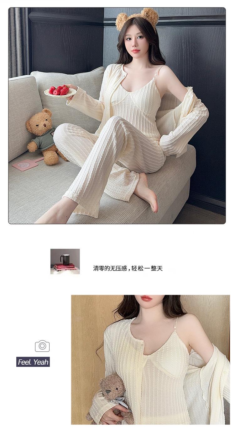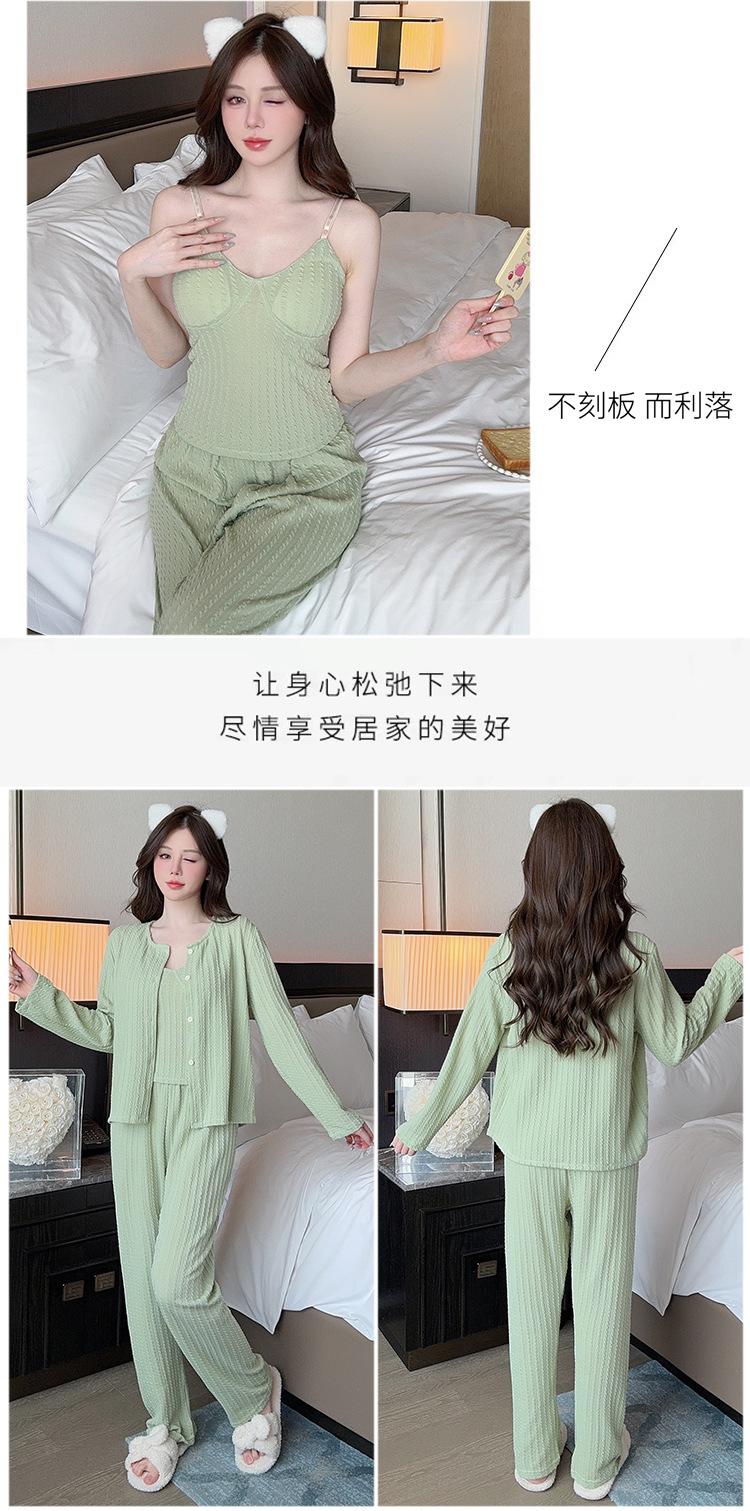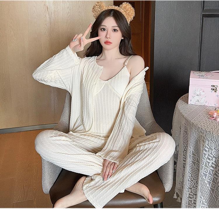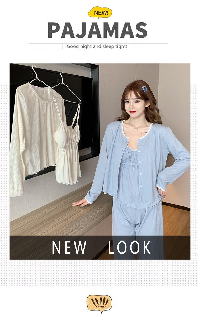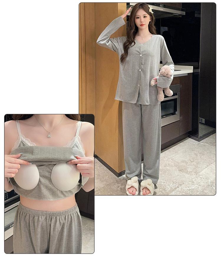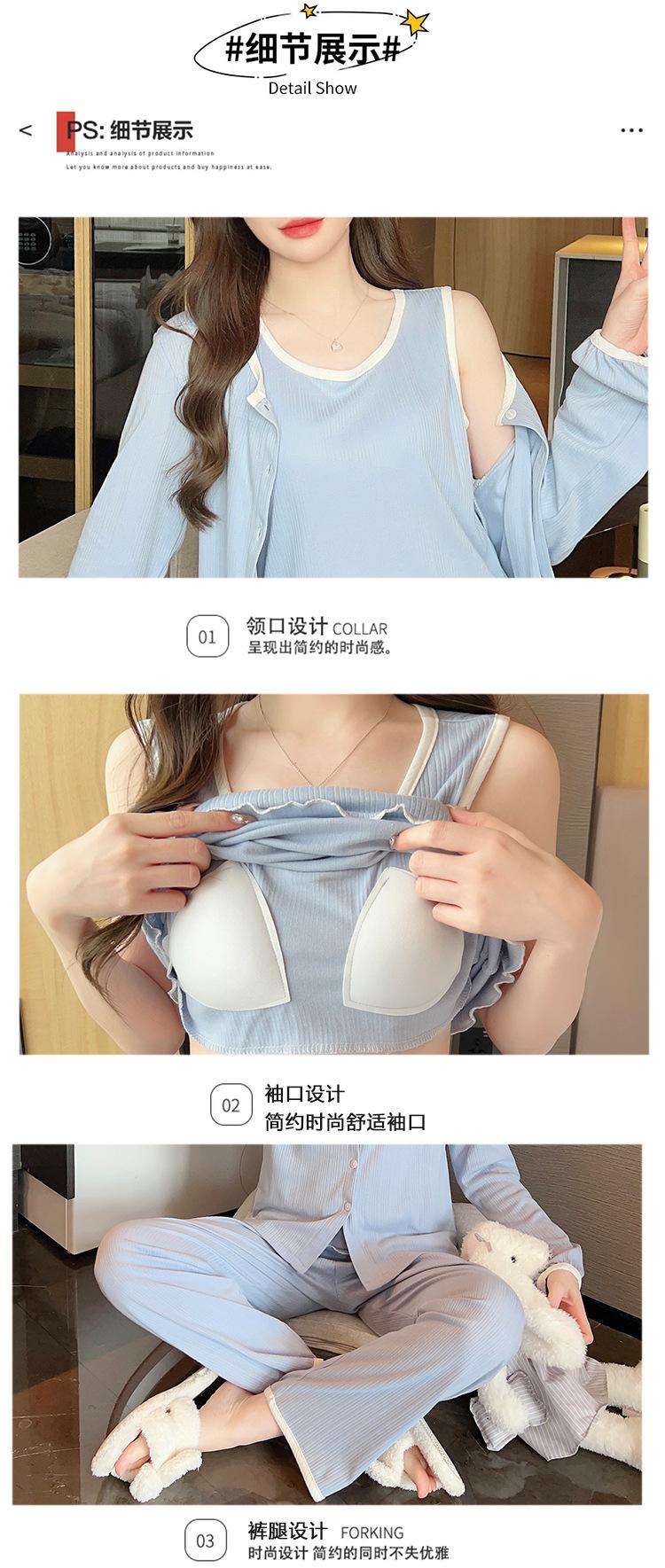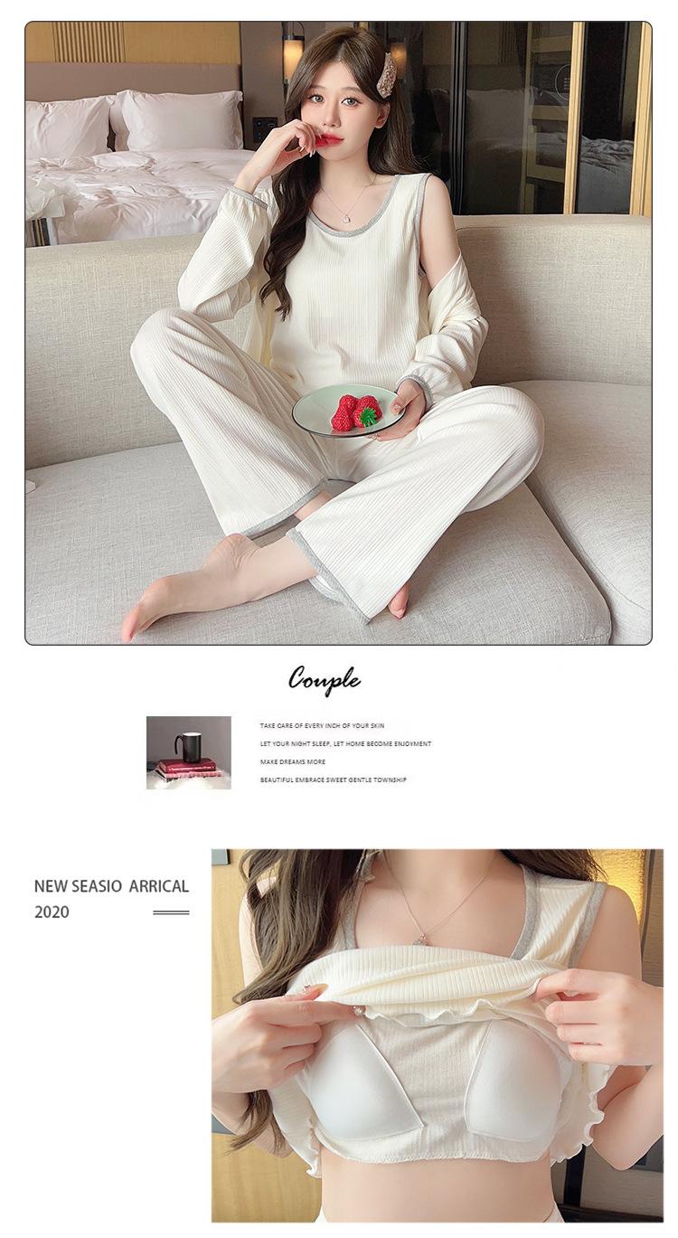 Conjunto nuevo de tres piezas para primavera y verano 2025 6535 Algodón con chaleco desmontable con almohadilla en el pecho + mangas largas + pantalones Pijama de mujer