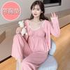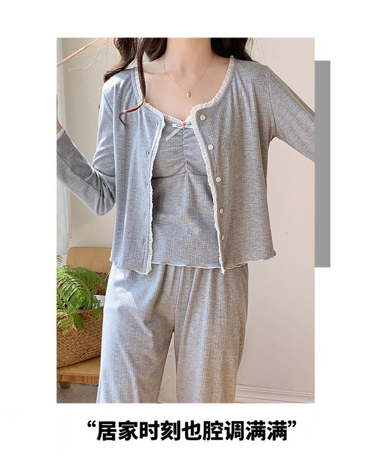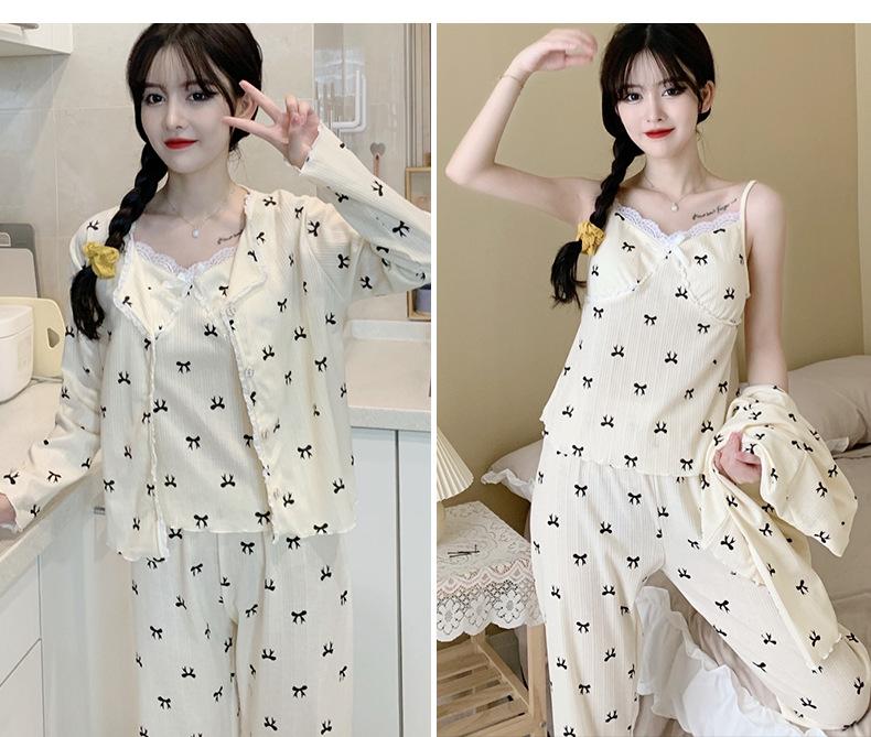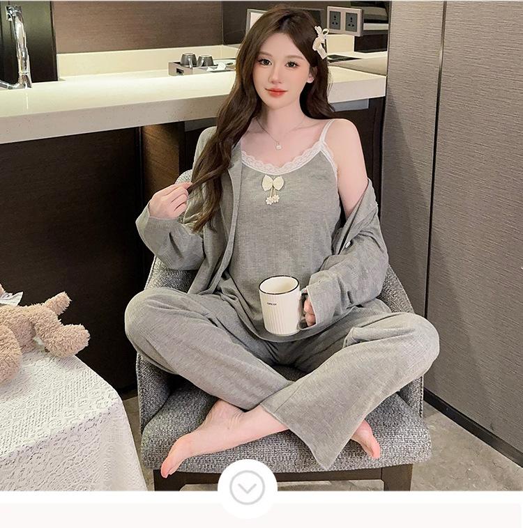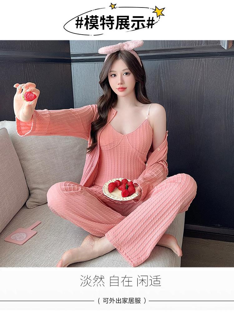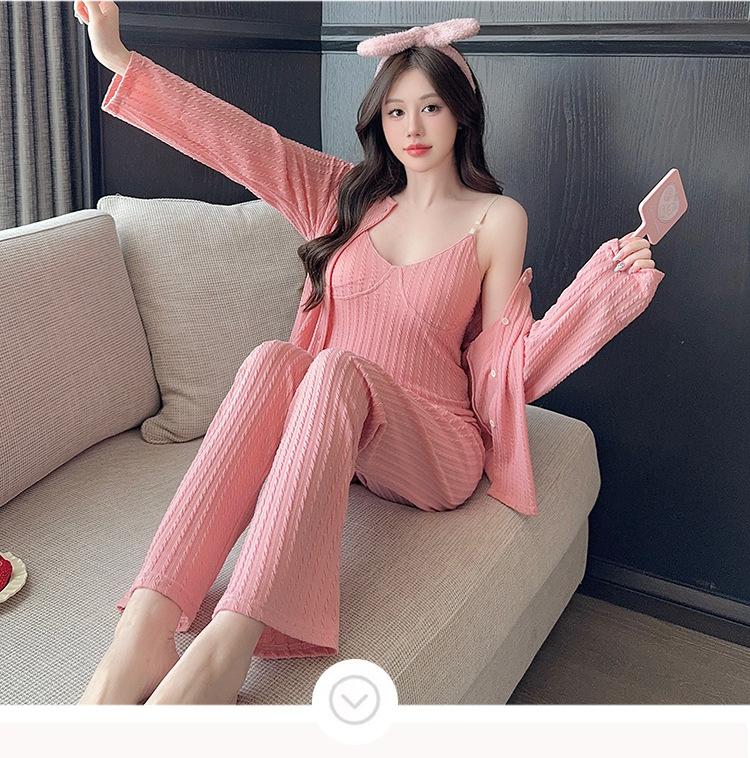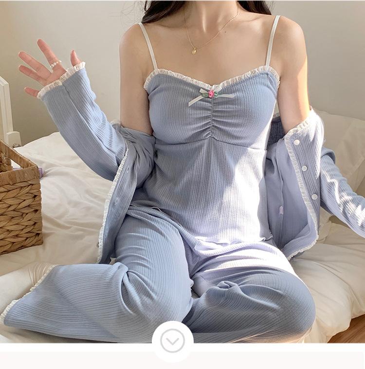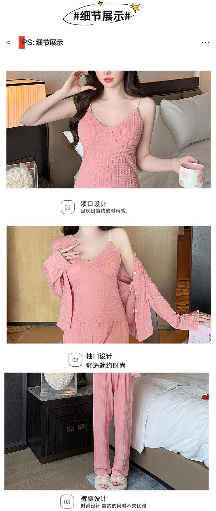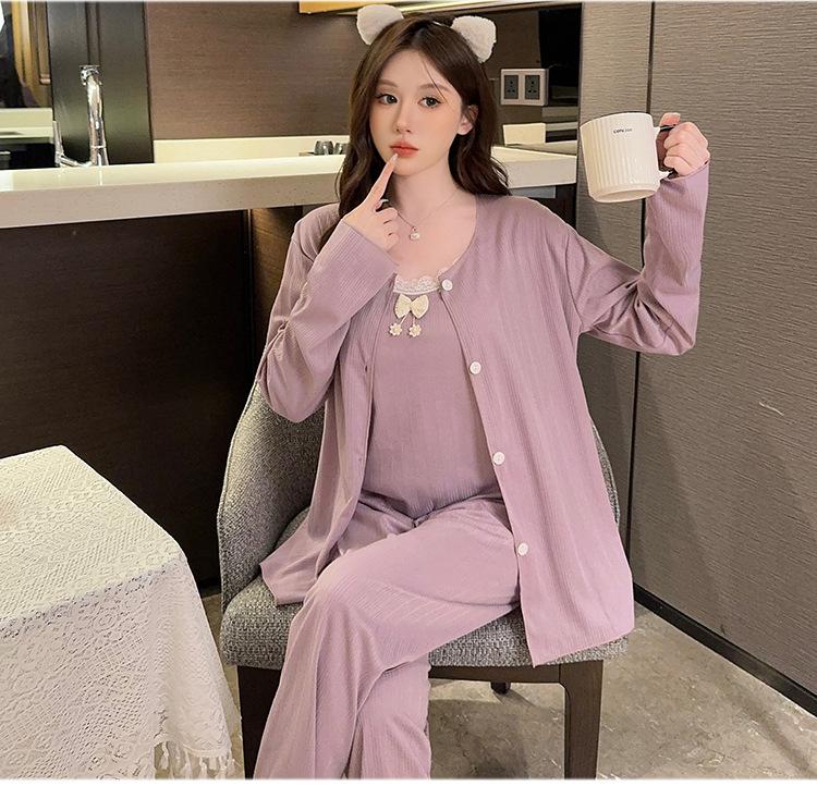 Conjunto nuevo de tres piezas para primavera y verano 2025 6535 Algodón con chaleco desmontable con almohadilla en el pecho + mangas largas + pantalones Pijama de mujer