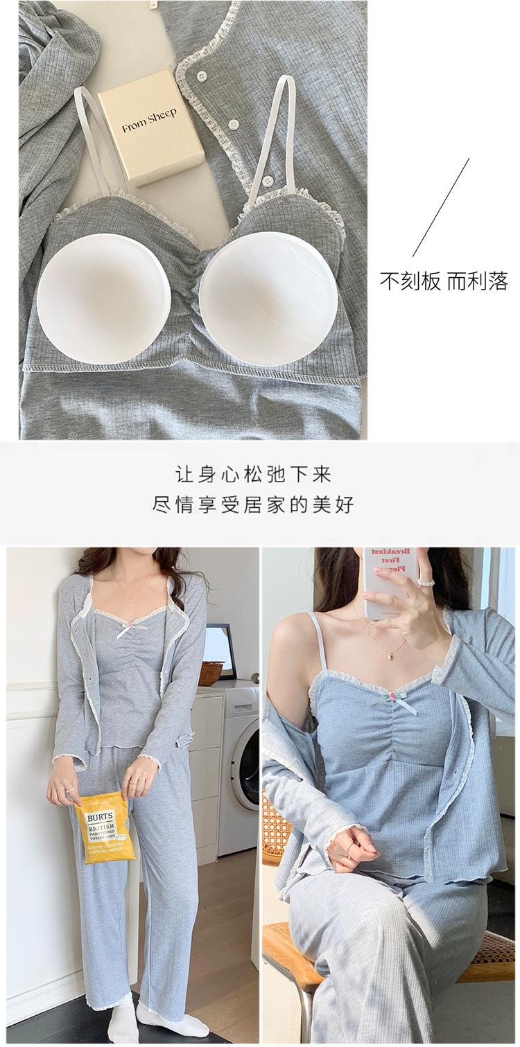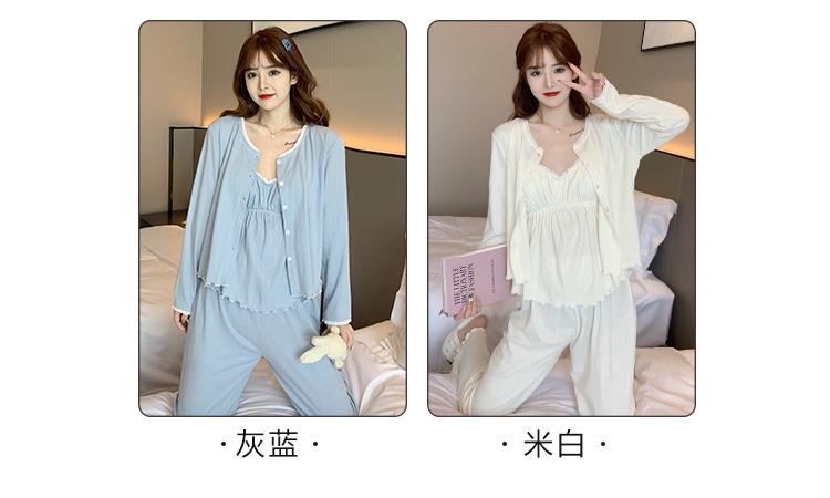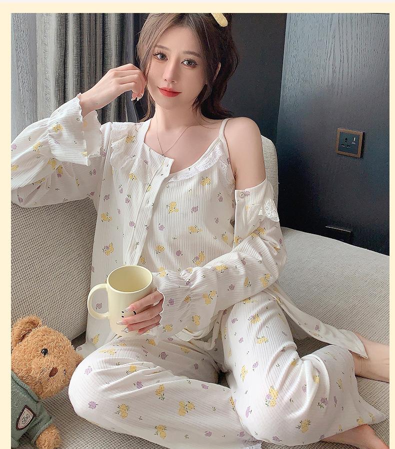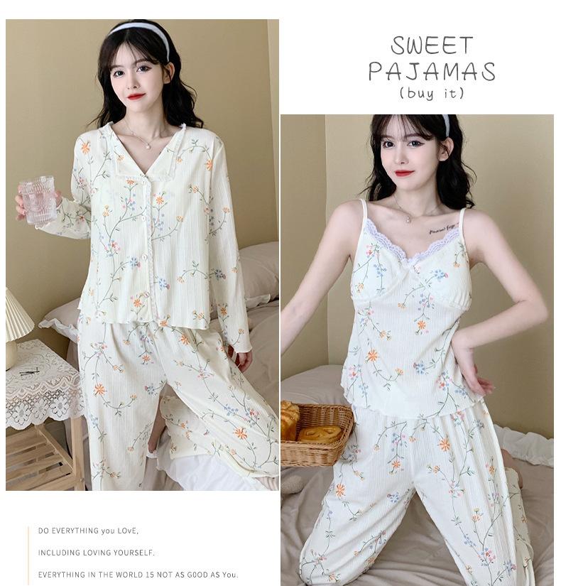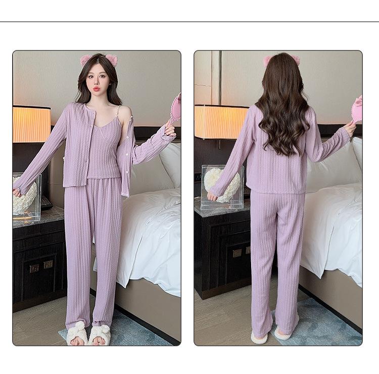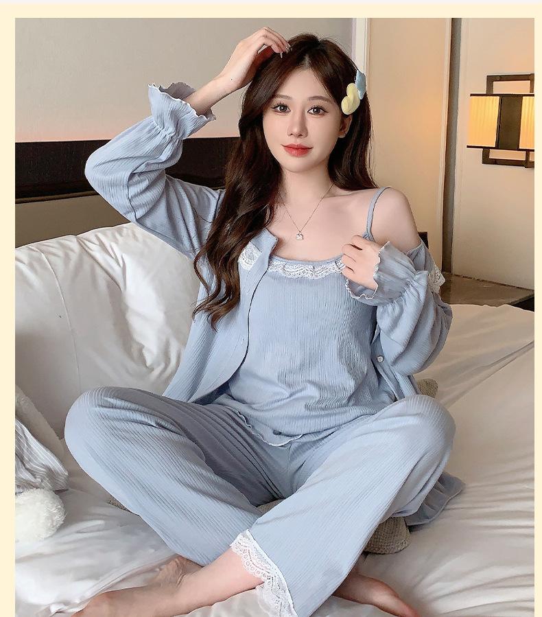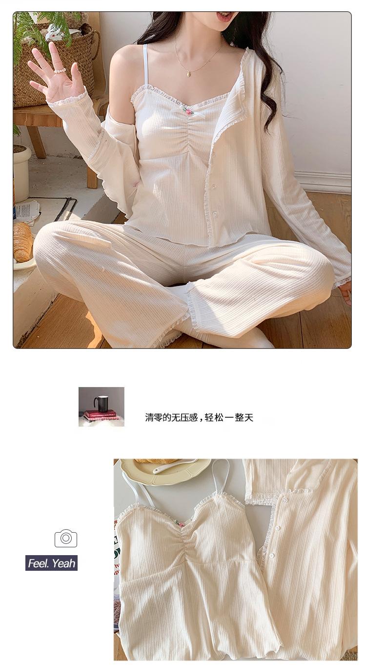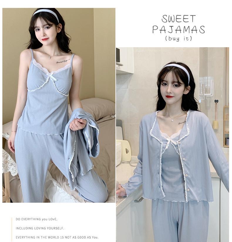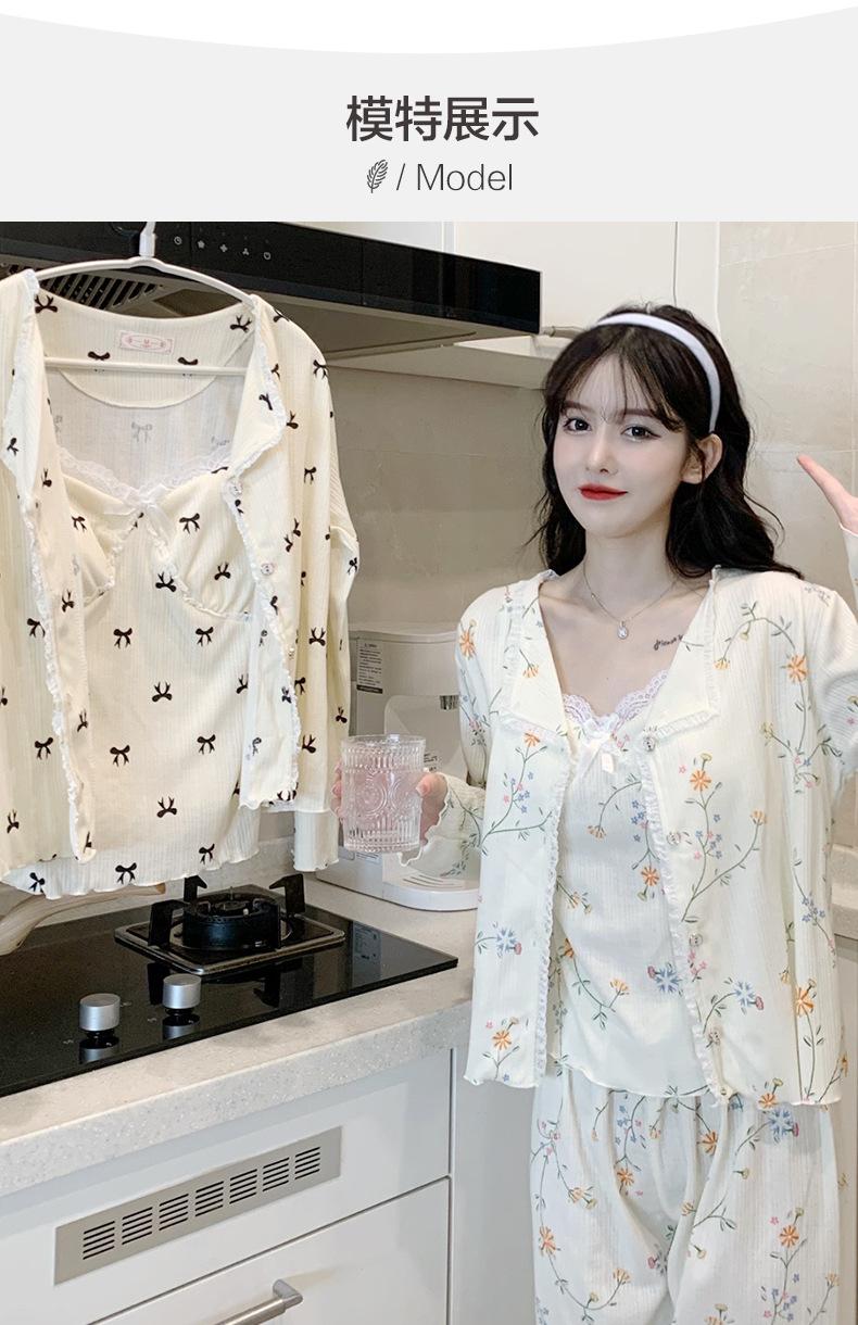 Conjunto nuevo de tres piezas para primavera y verano 2025 6535 Algodón con chaleco desmontable con almohadilla en el pecho + mangas largas + pantalones Pijama de mujer