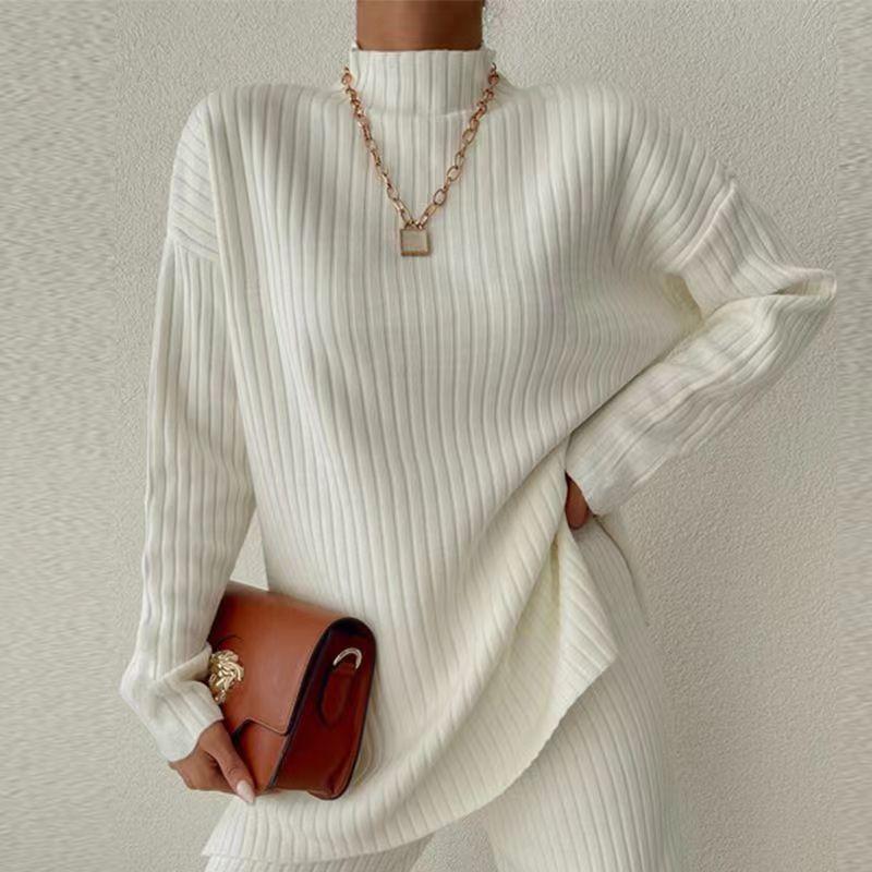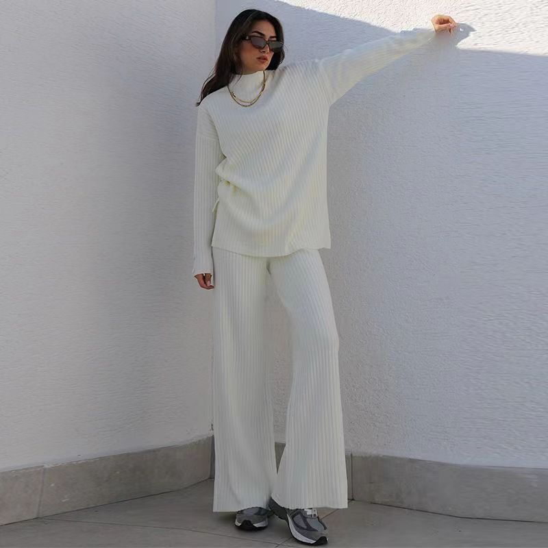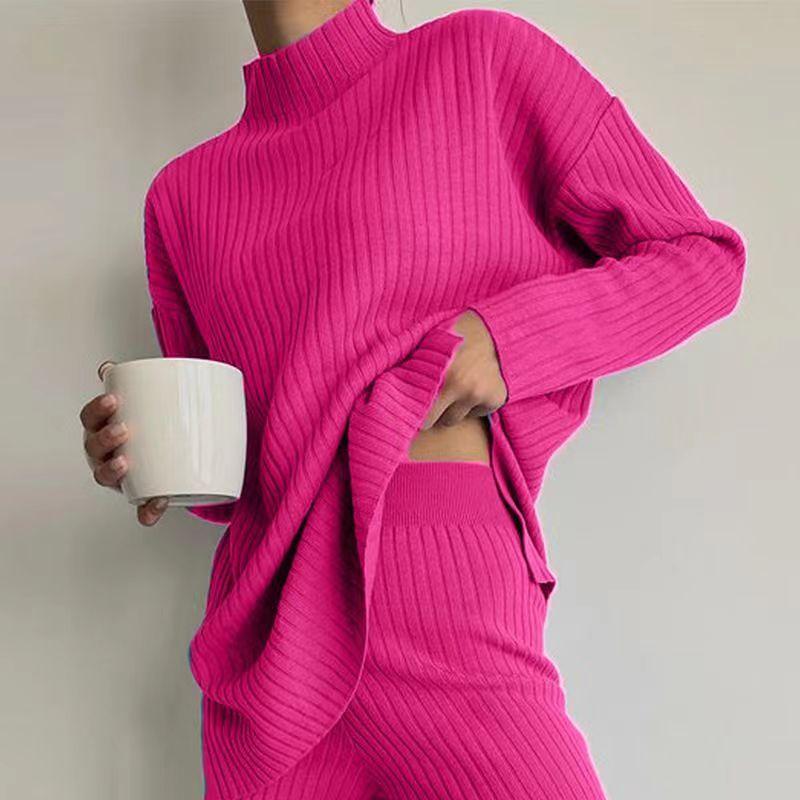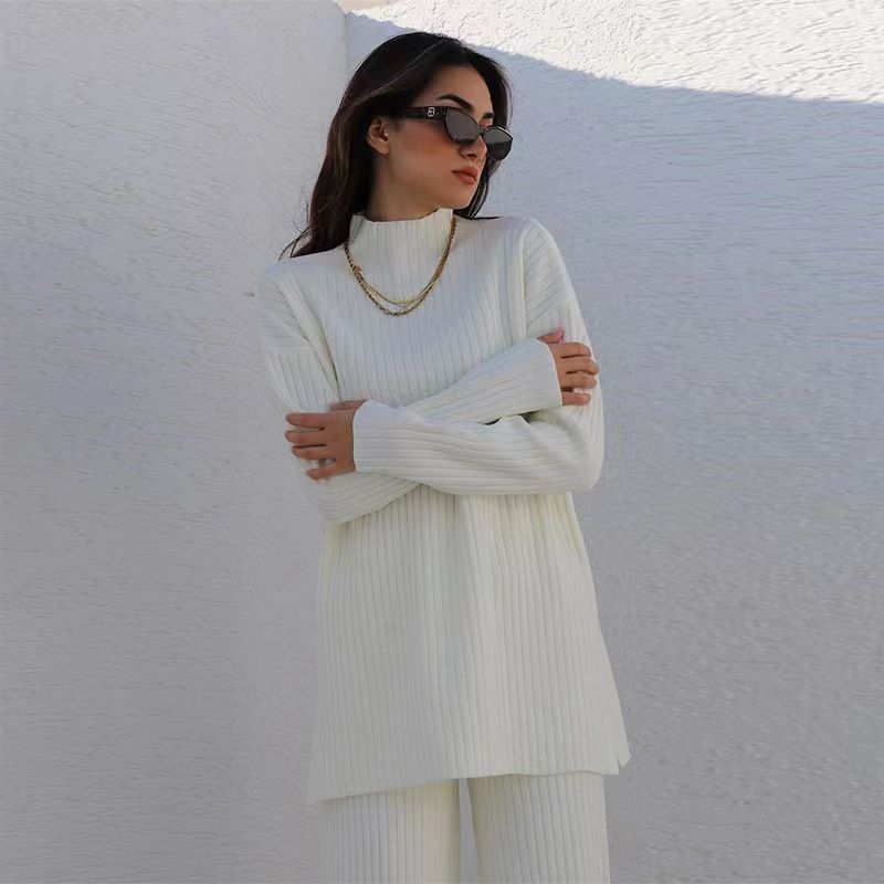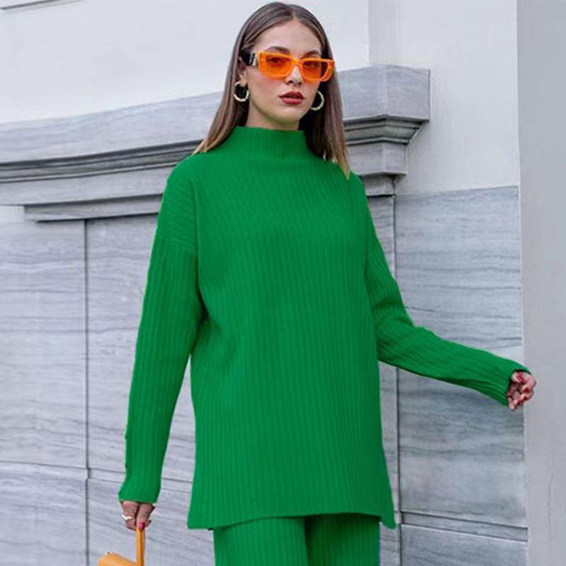 Nuevo Conjunto de Dos Piezas Transfronterizo Europeo y Americano Moda Casual Adelgazante Cuello Semi-Alto Manga Larga Color Sólido Conjunto de Suéter de Punto para Mujer