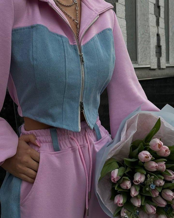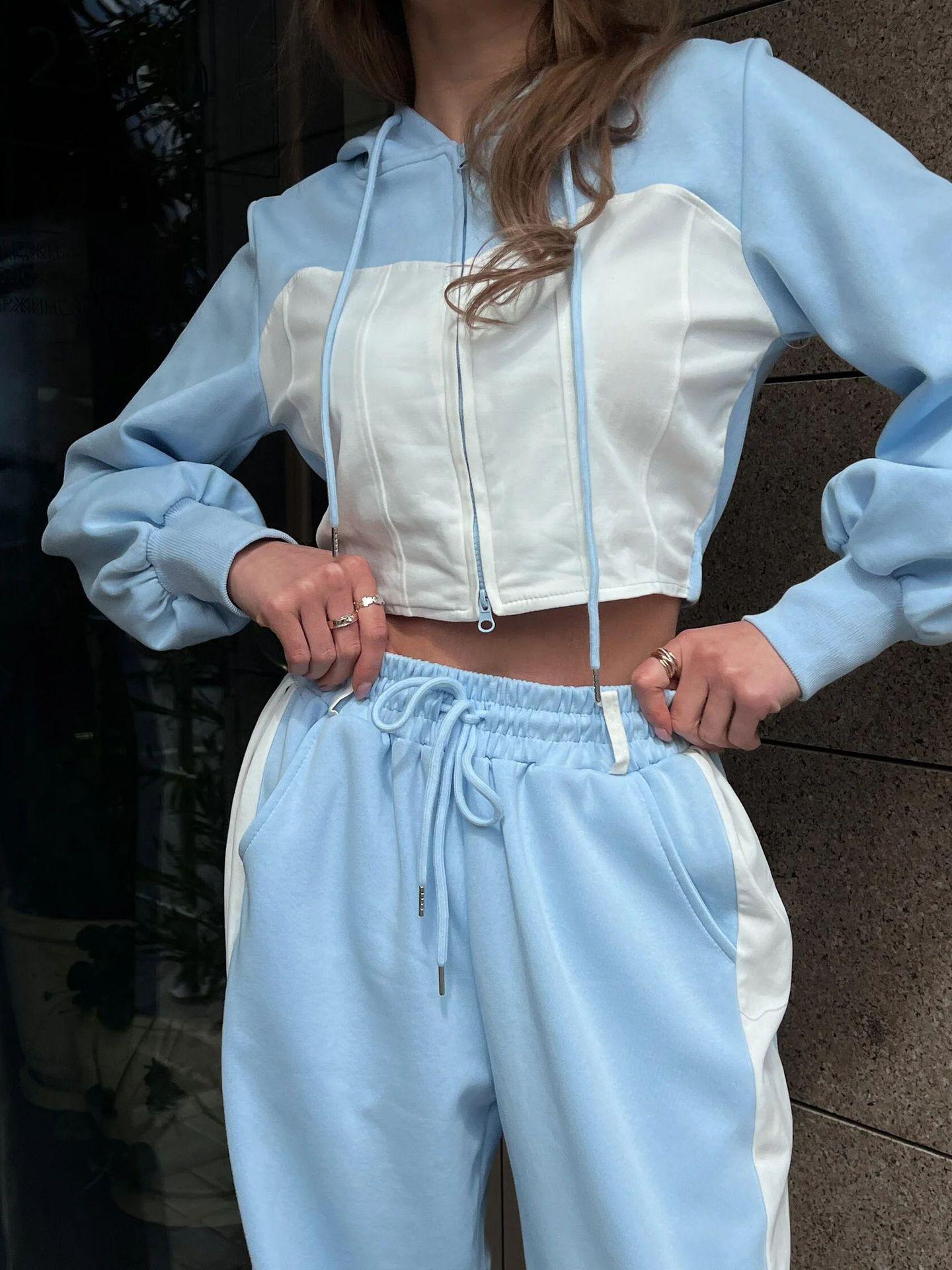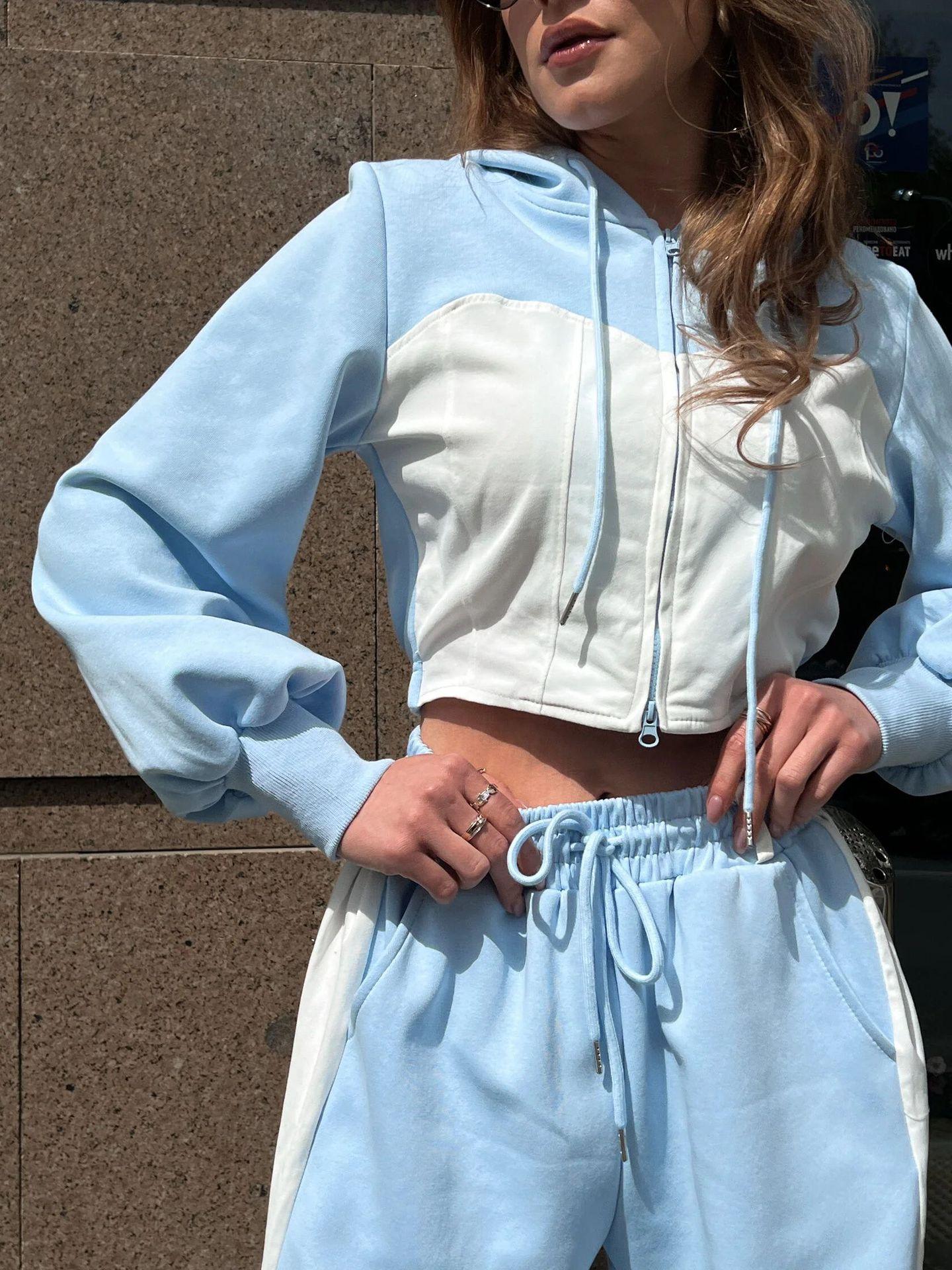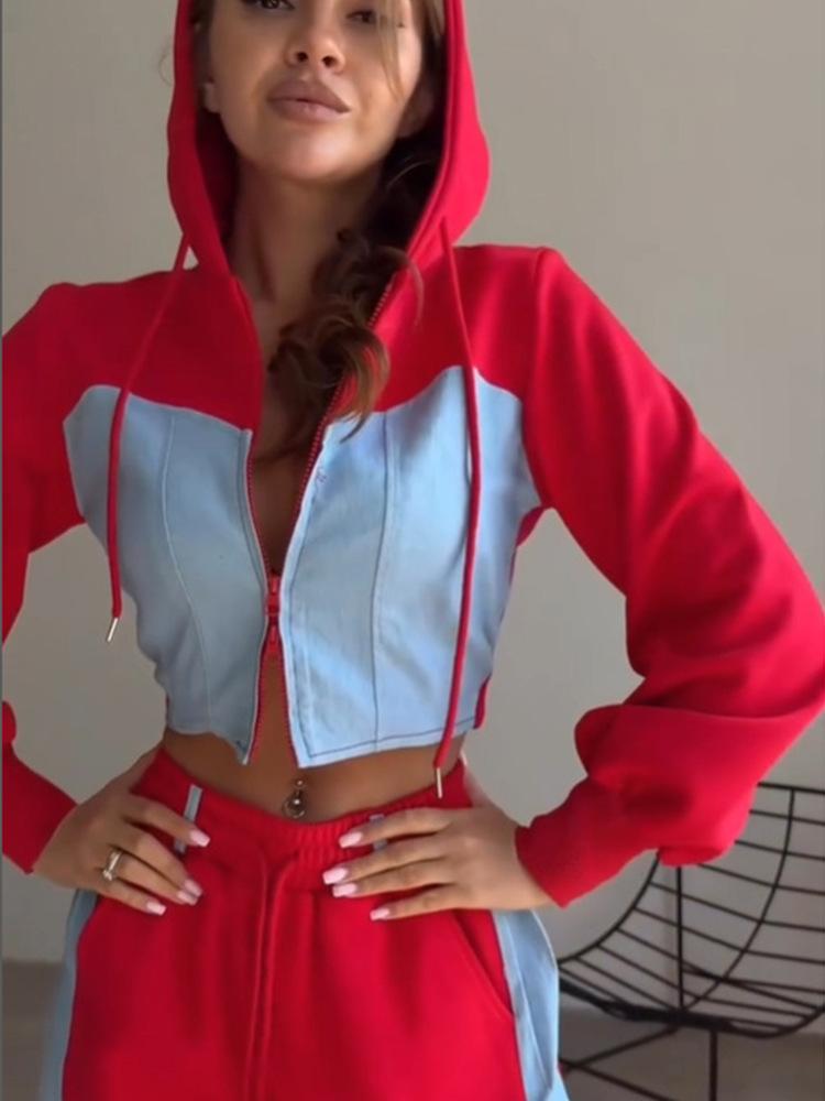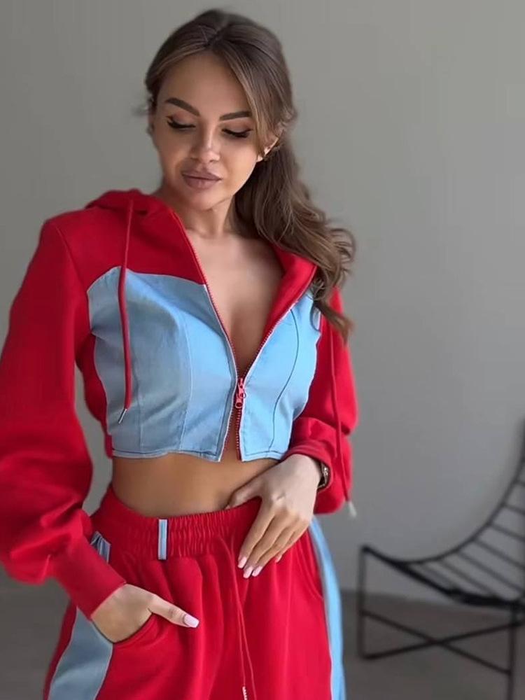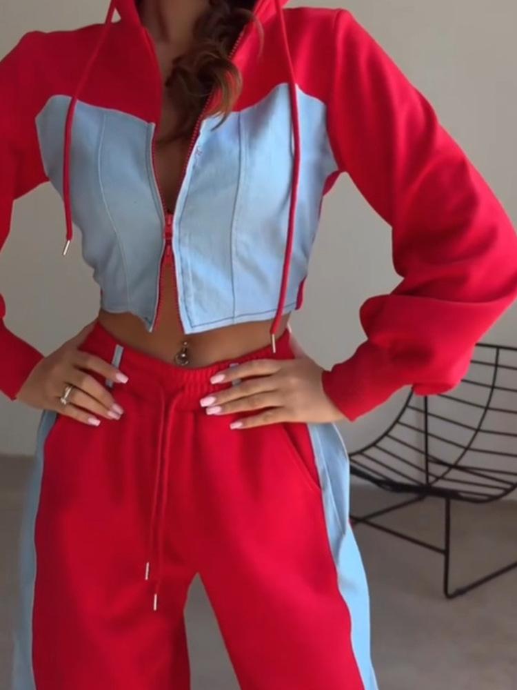 Amazon comercio exterior traje de moda de combinación de colores para mujer europea y americana sexy cintura descubierta sudadera con capucha cárdigan de contraste pantalones deportivos dos piezas