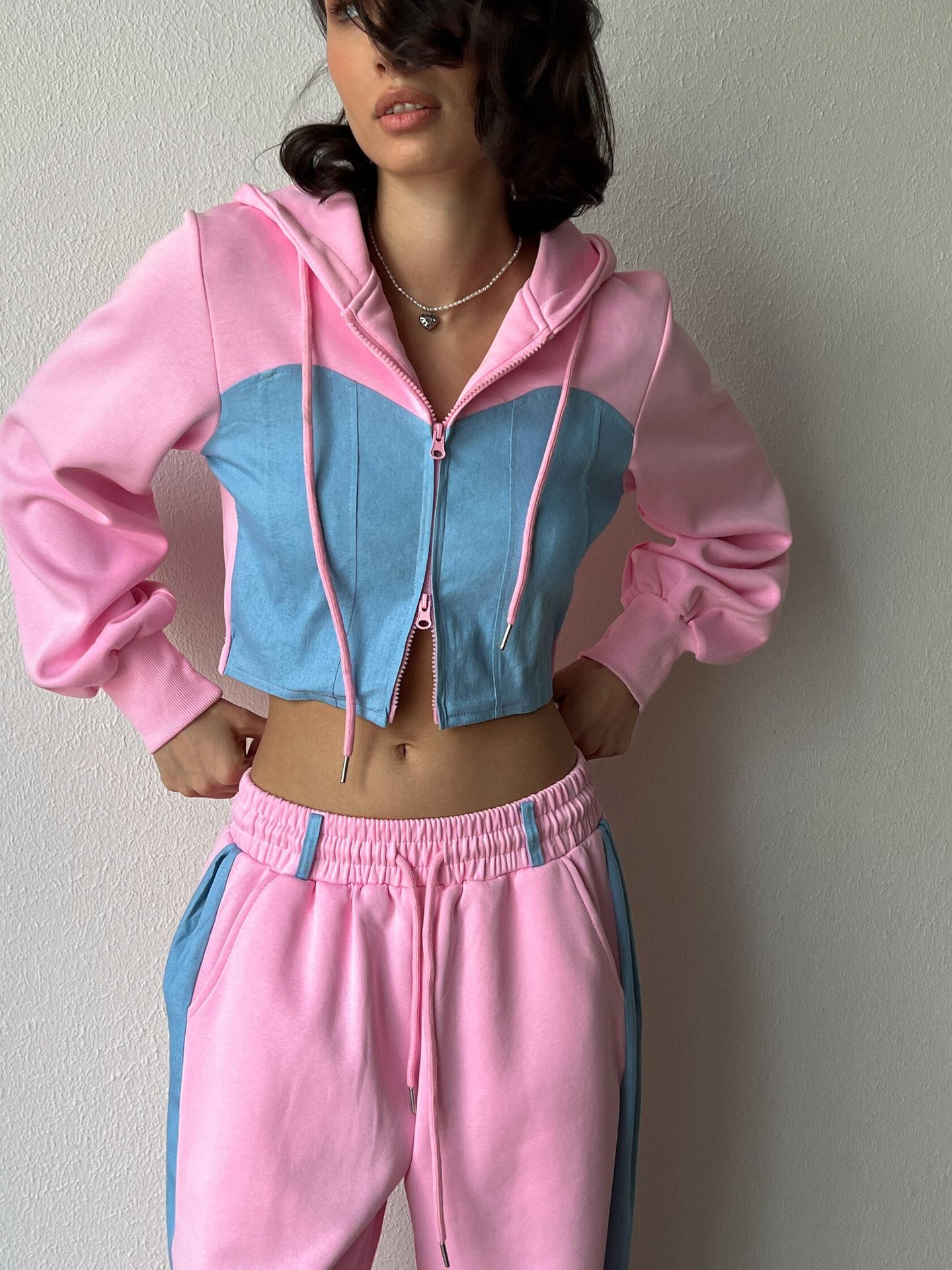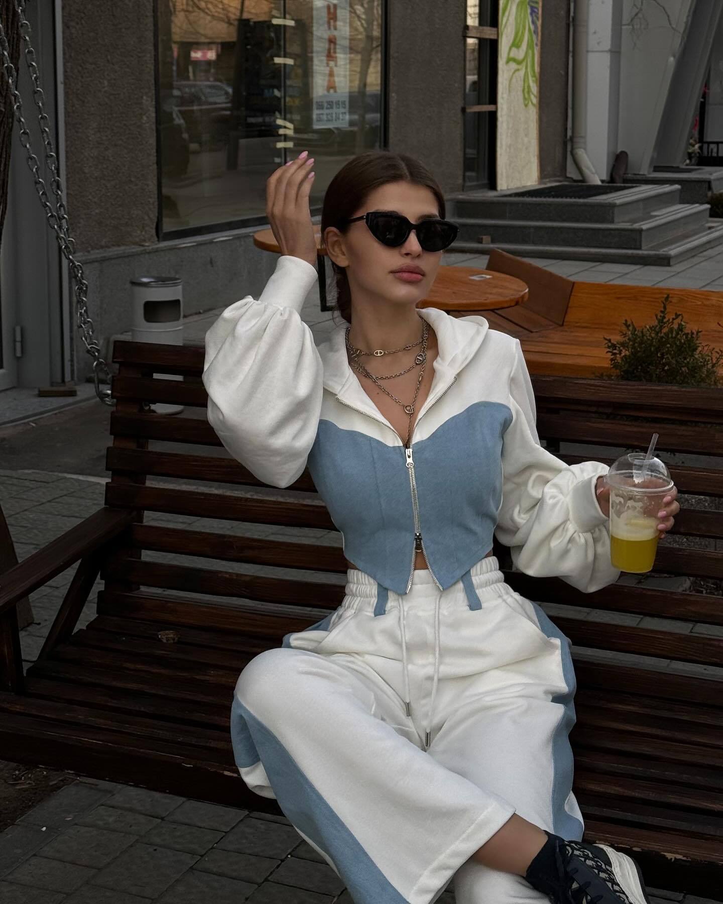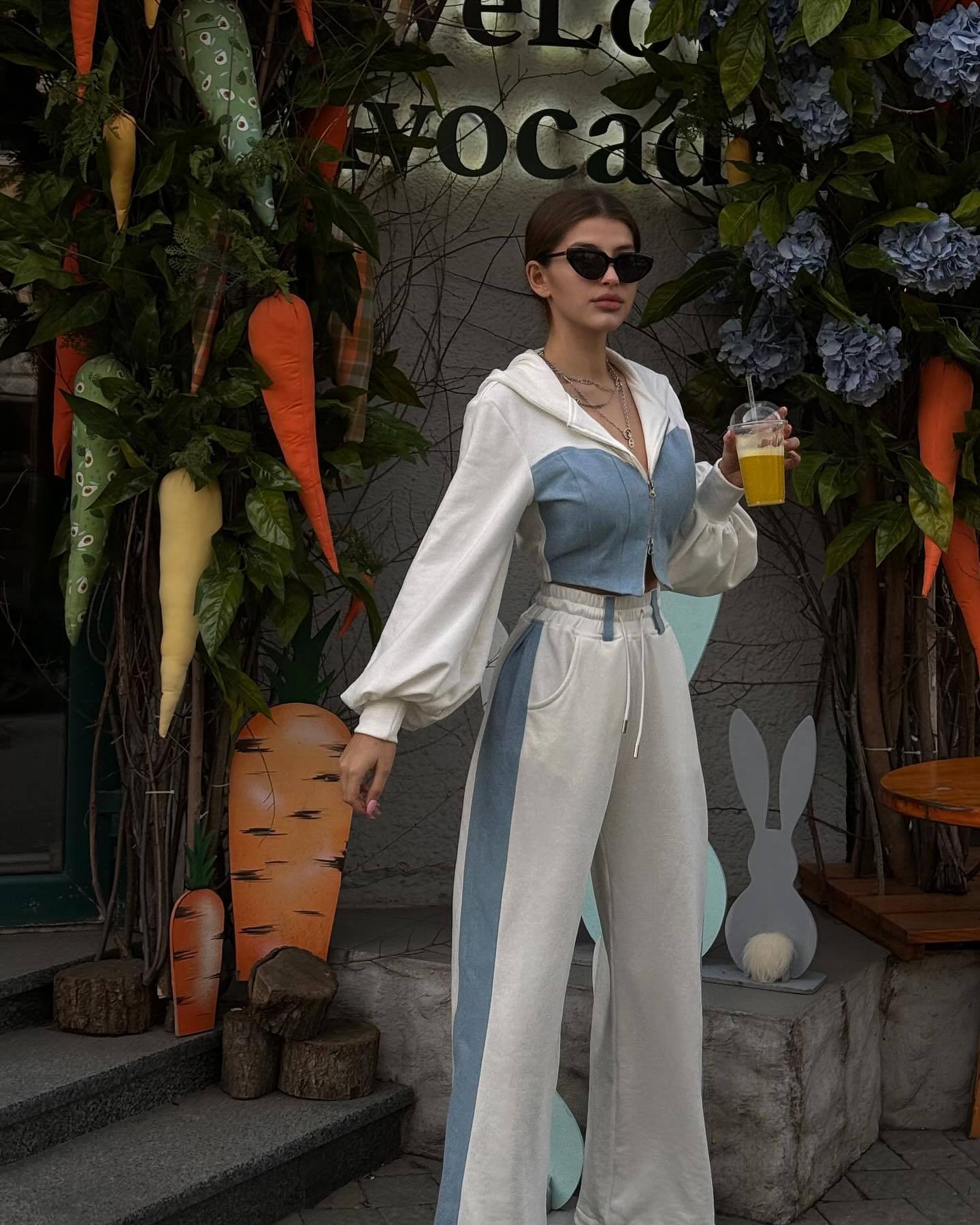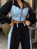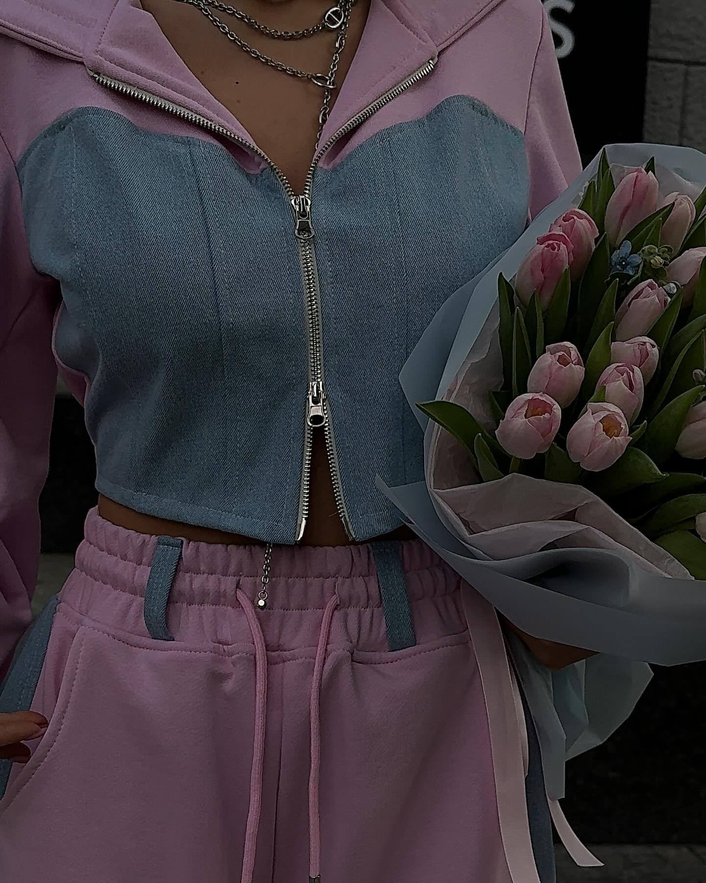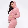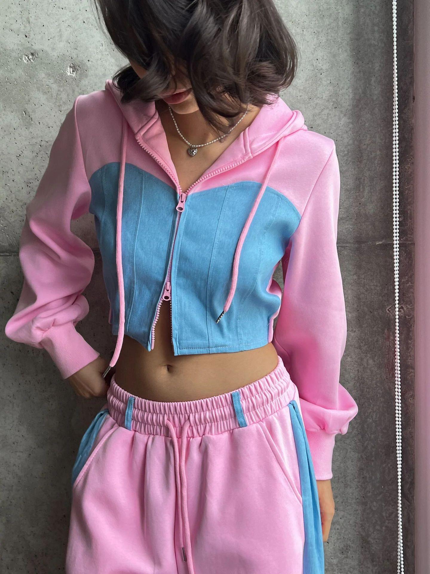 Amazon comercio exterior traje de moda de combinación de colores para mujer europea y americana sexy cintura descubierta sudadera con capucha cárdigan de contraste pantalones deportivos dos piezas