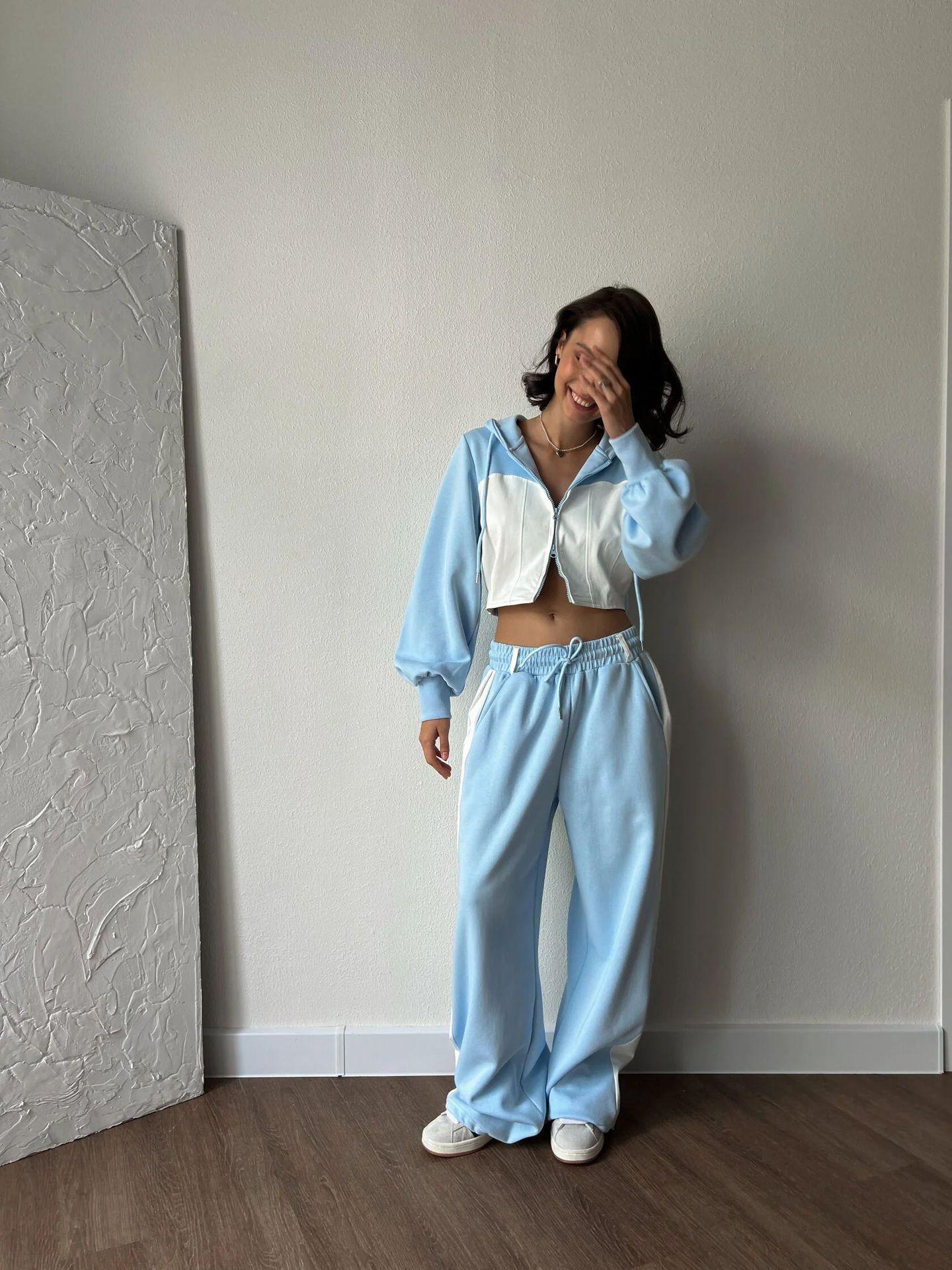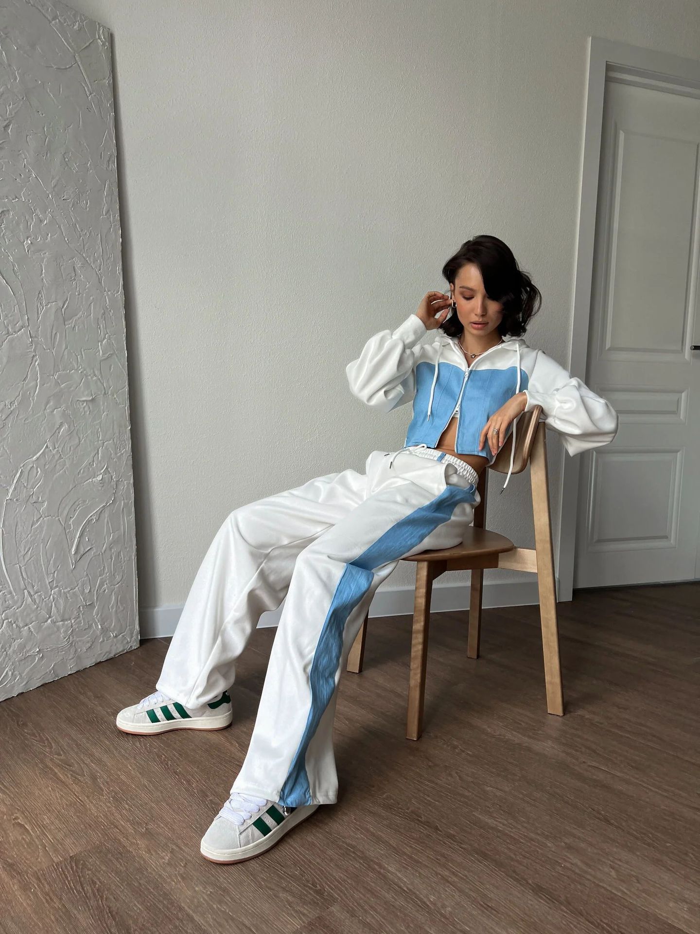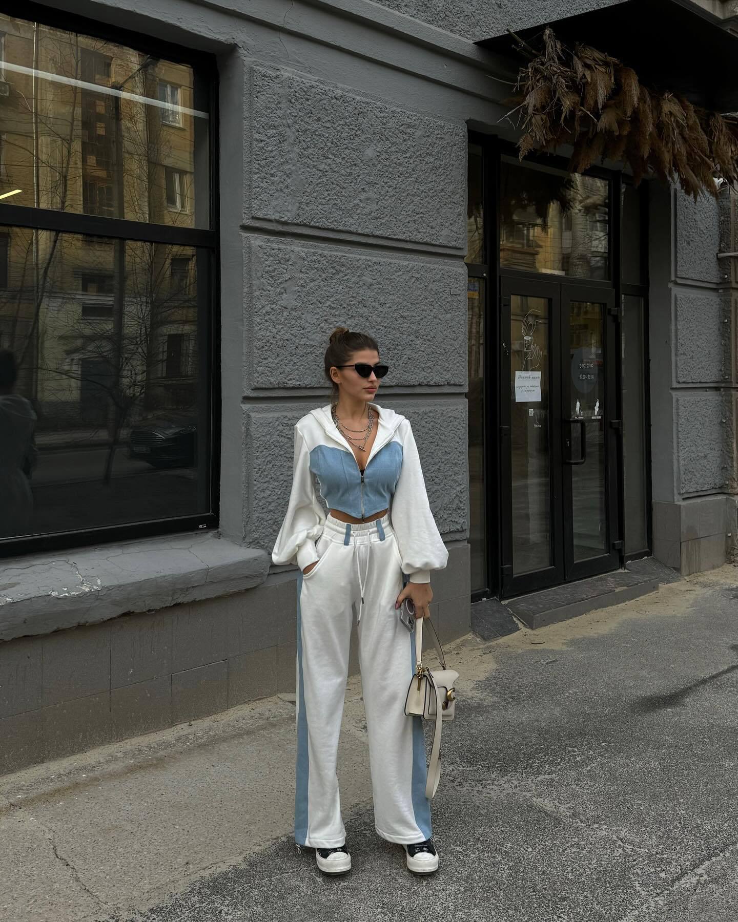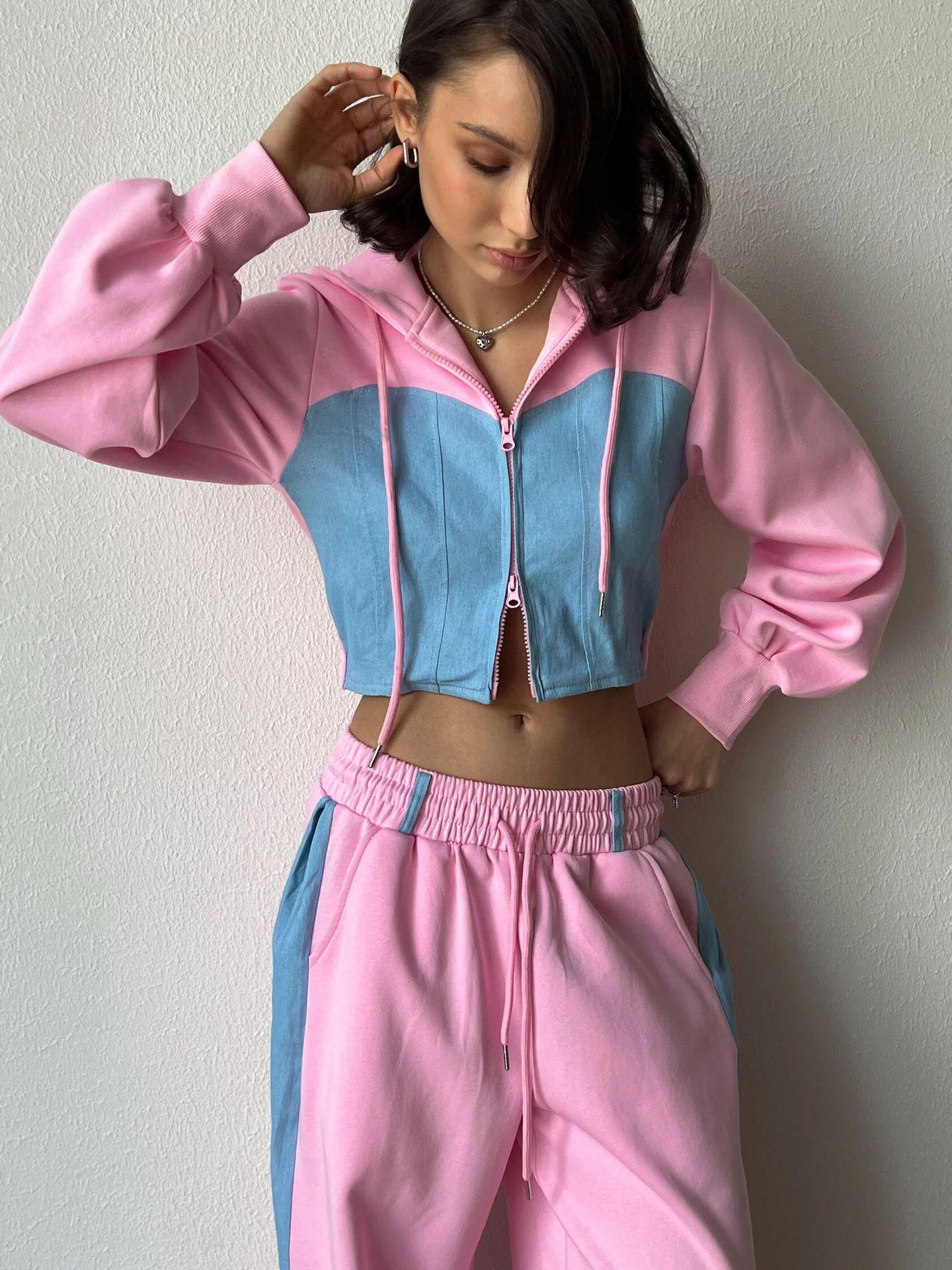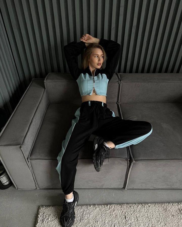 Amazon comercio exterior traje de moda de combinación de colores para mujer europea y americana sexy cintura descubierta sudadera con capucha cárdigan de contraste pantalones deportivos dos piezas