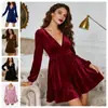 Primavera y verano 2025 Nueva ropa de mujer Ropa de mujer Color sólido Escote en V profundo Mangas ligeras Vestido corto con volantes de terciopelo dorado