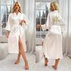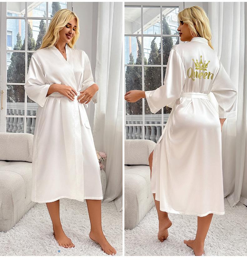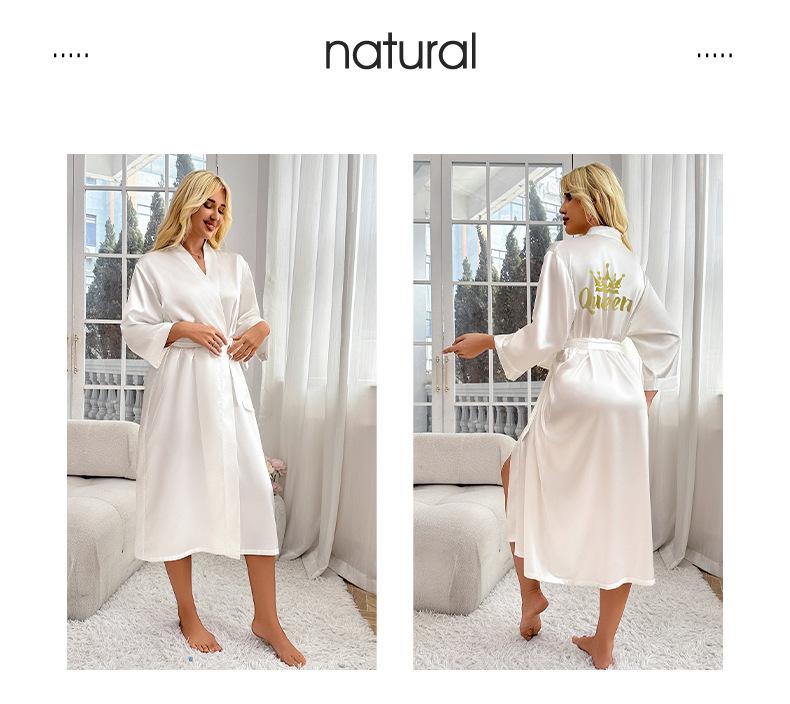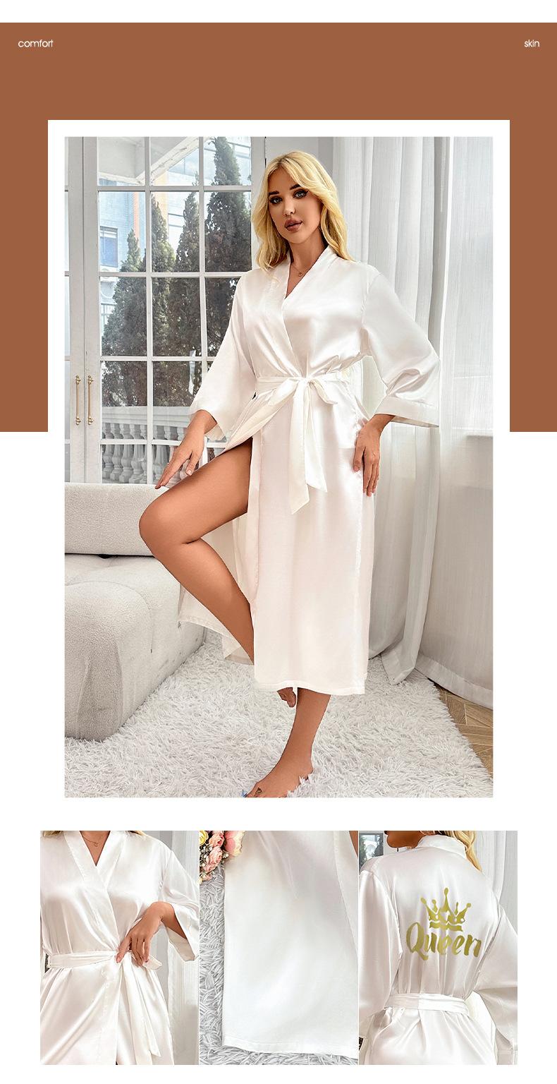 Nuevo Pijama Sexy Francés de Seda de Hielo Transfronterizo para Mujer Primavera y Verano Estampado de Reina Color Puro Camisón Largo Bata en la Espalda