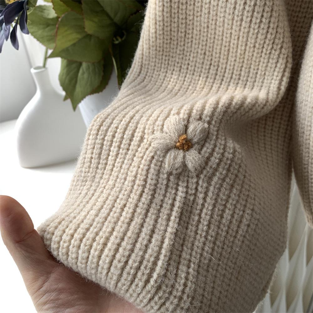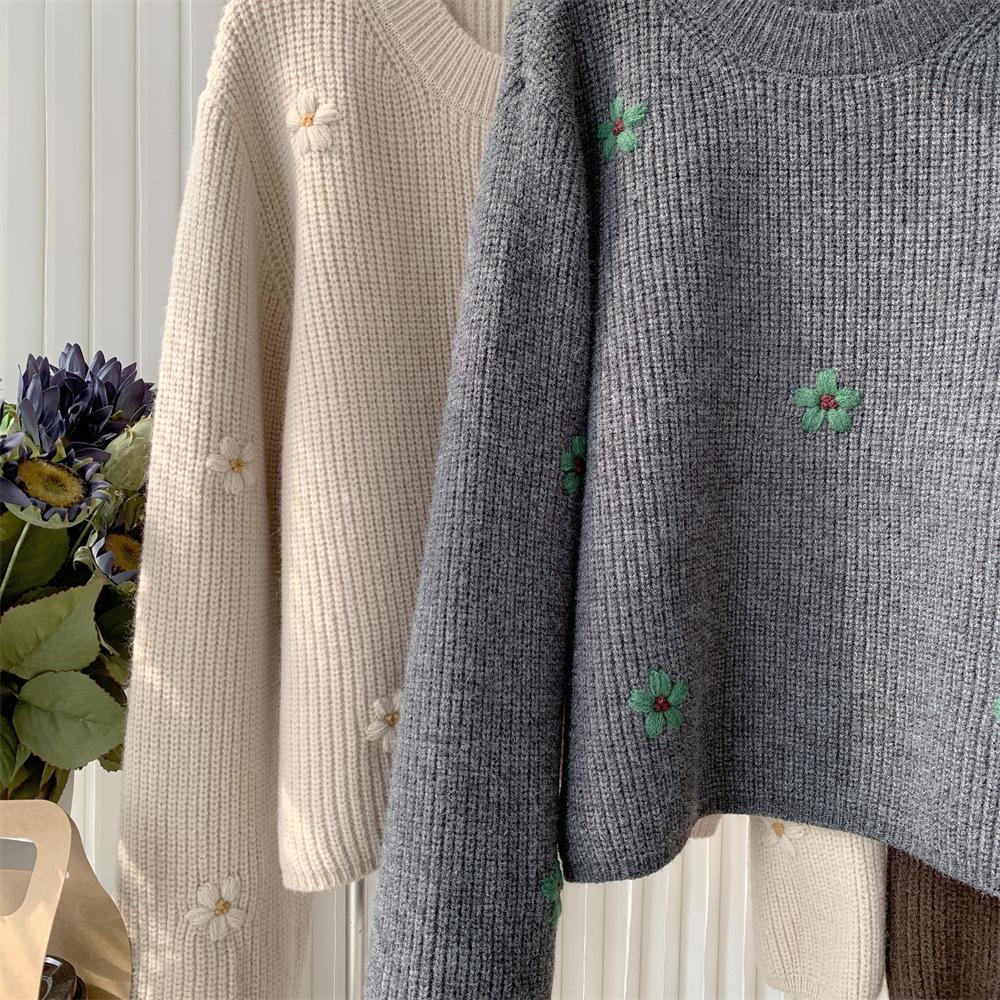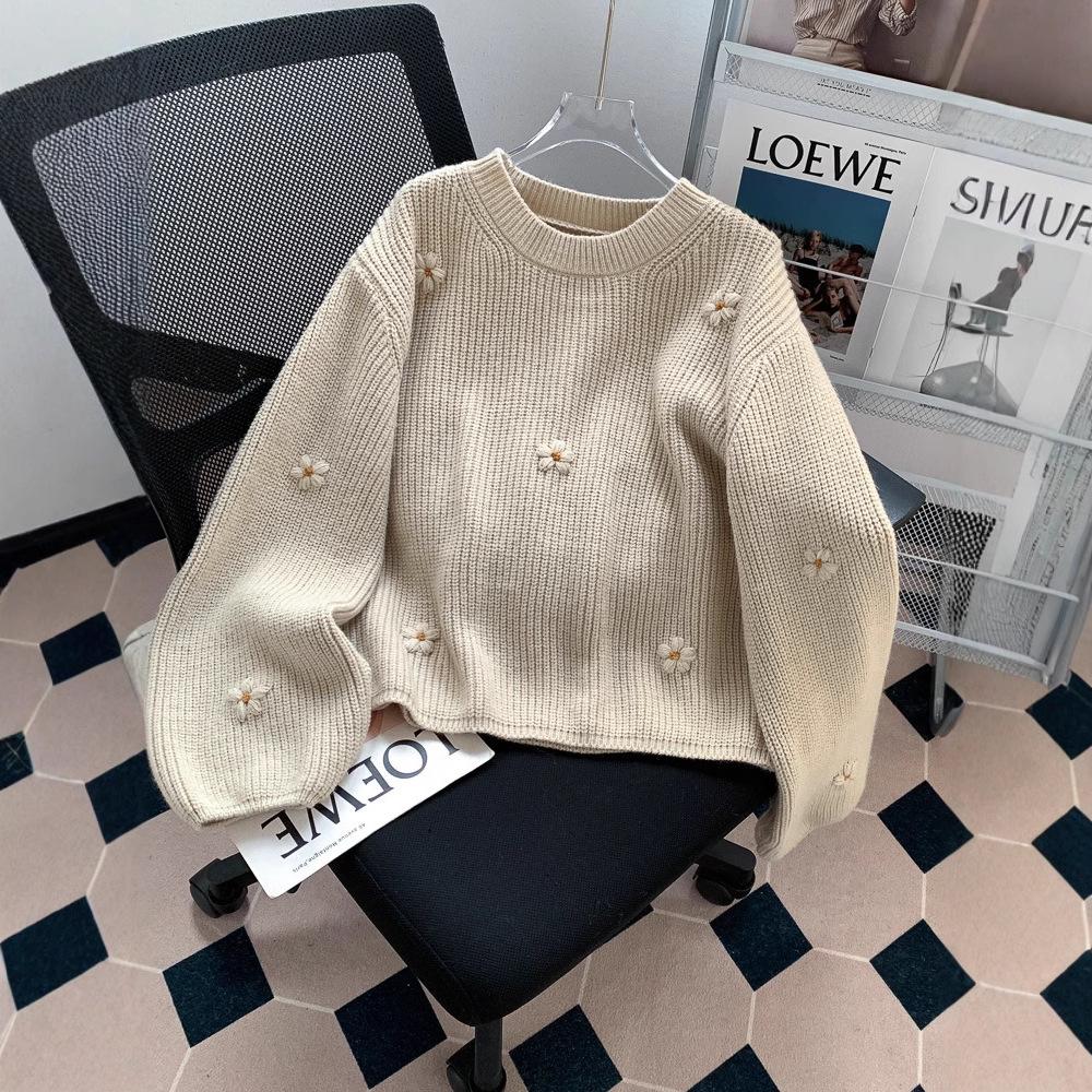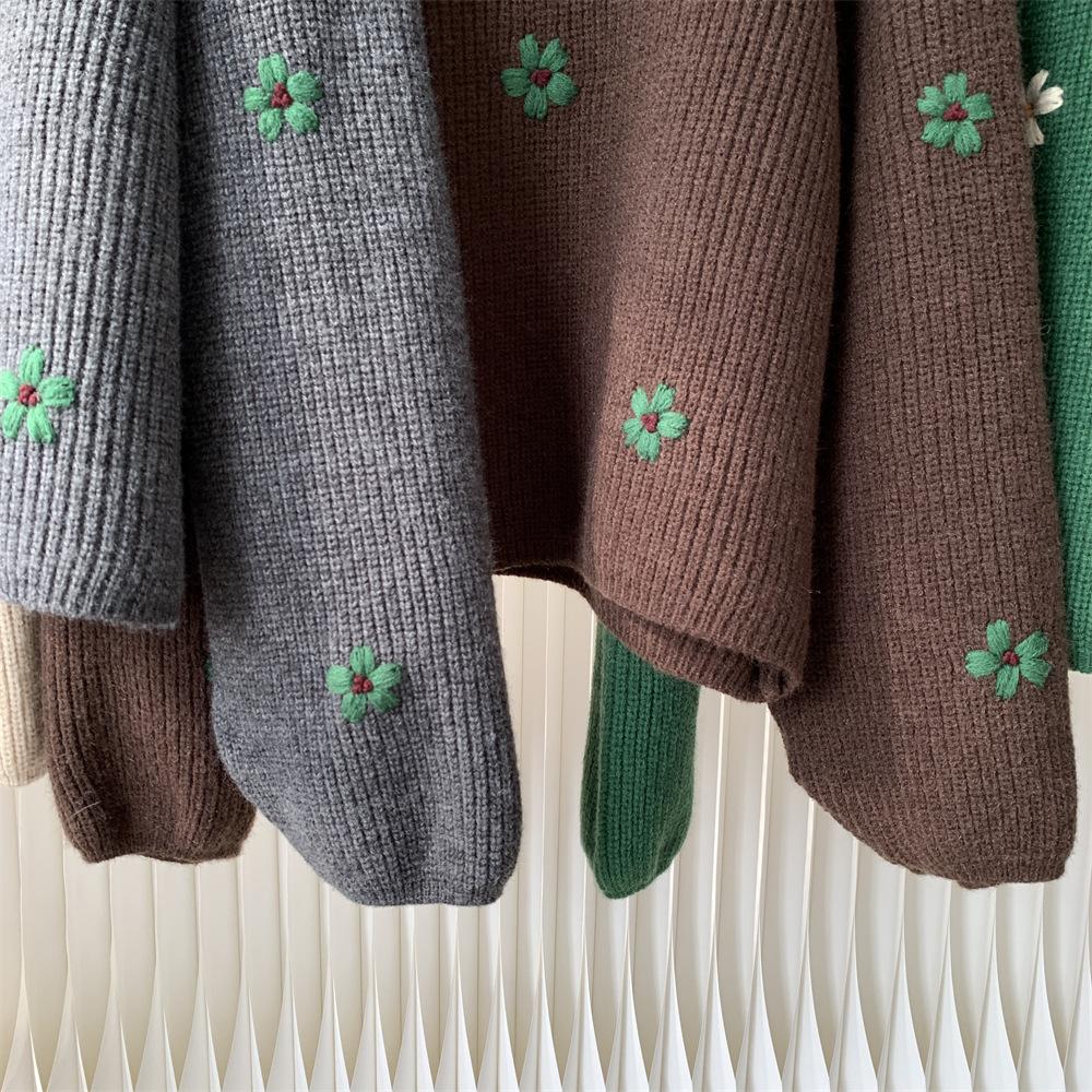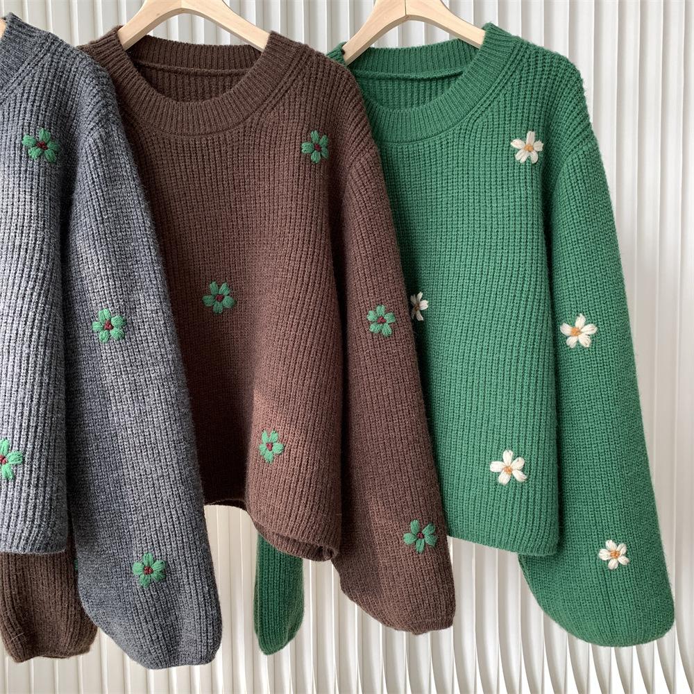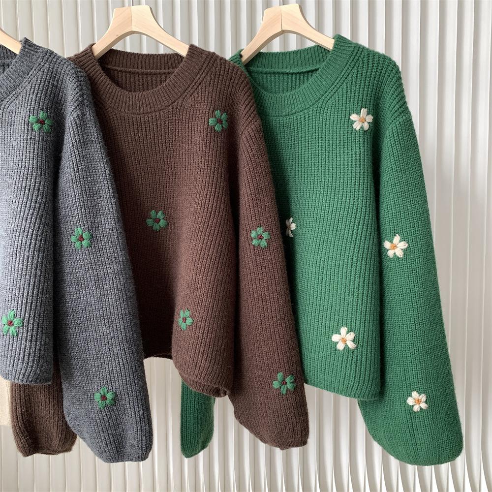 Suéter vintage con bordado de flores para mujer, otoño e invierno 2024, nuevo, holgado, estilo perezoso, suéter de punto de alta gama estilo coreano.
