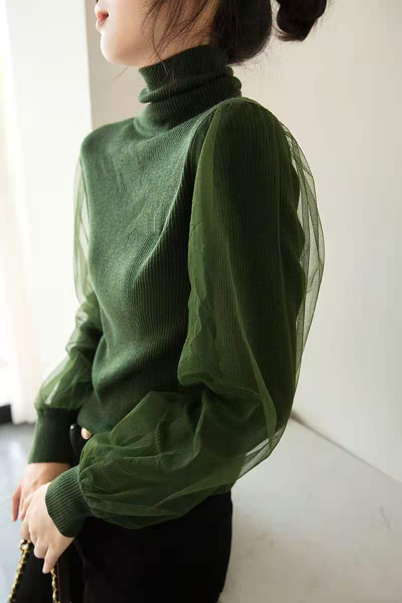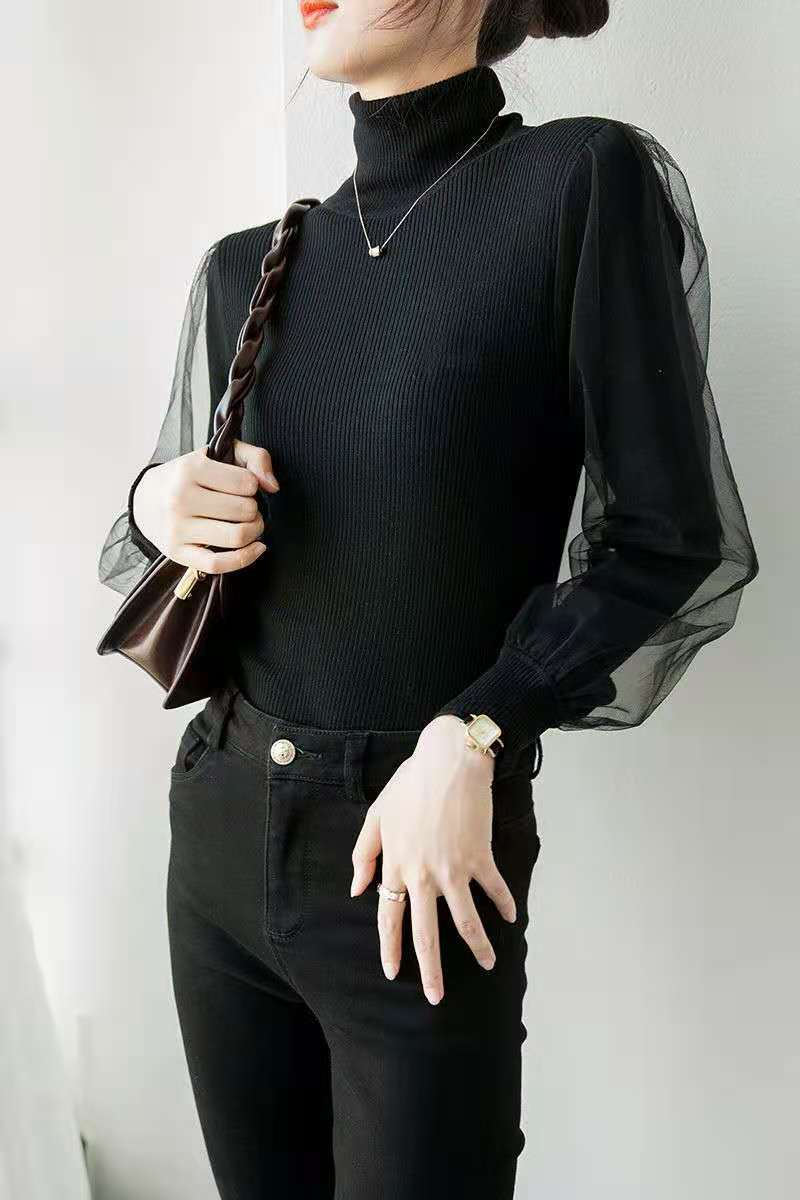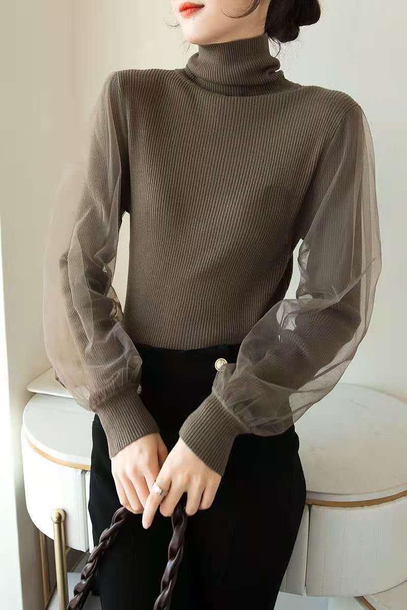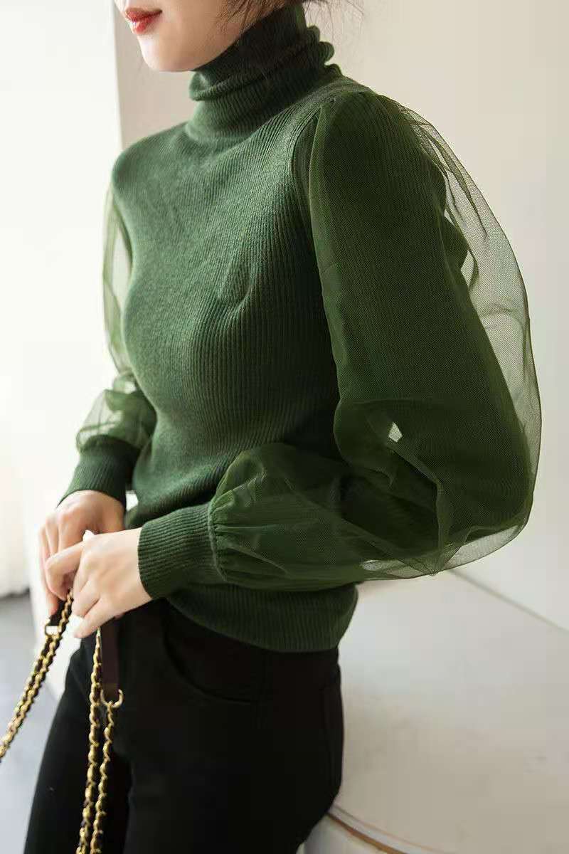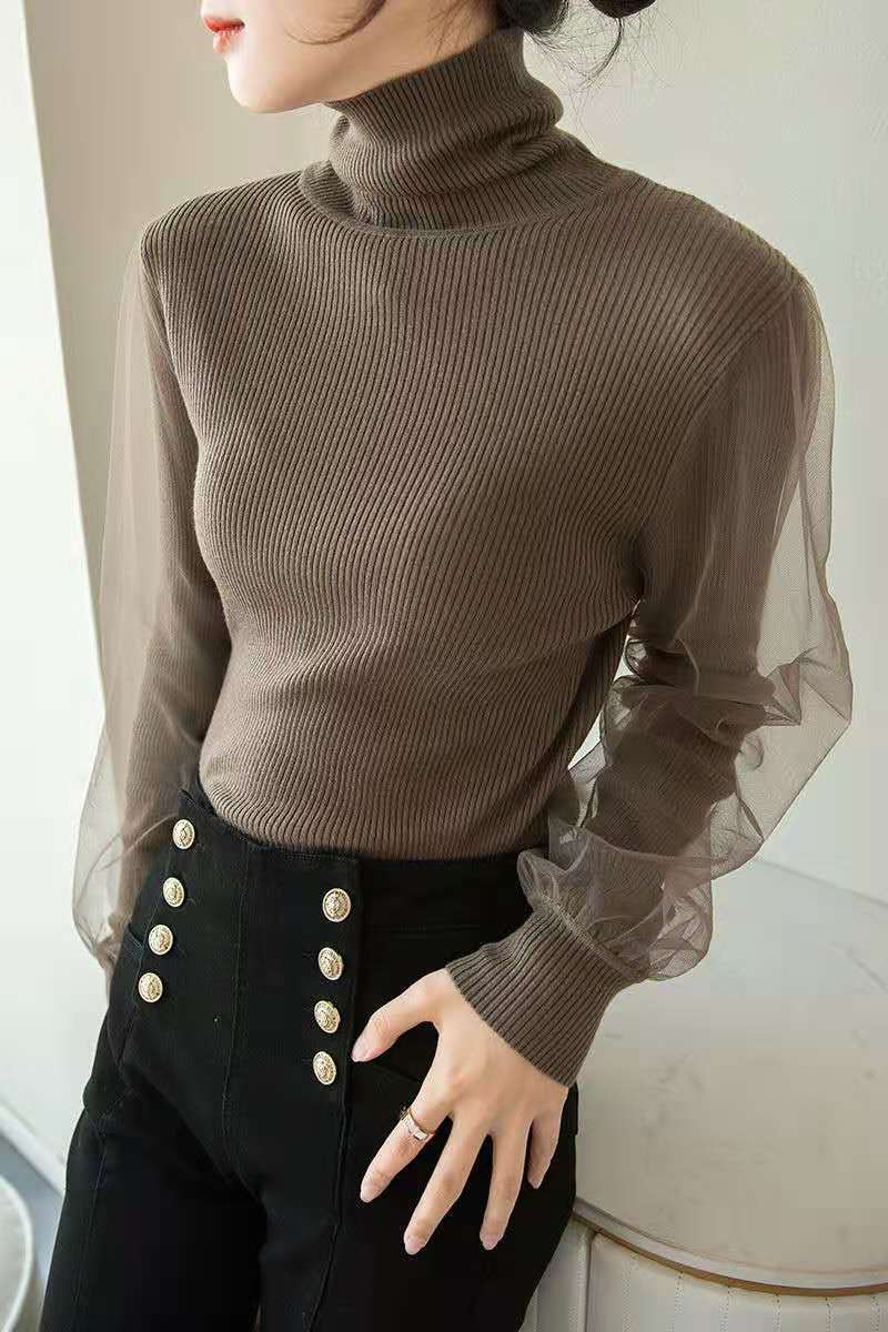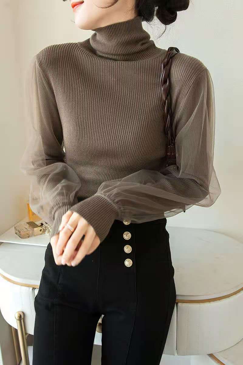 Suéter de cuello alto en stock otoño e invierno encaje malla de alta gama tejido camisa base de invierno para mujer versátil a la moda