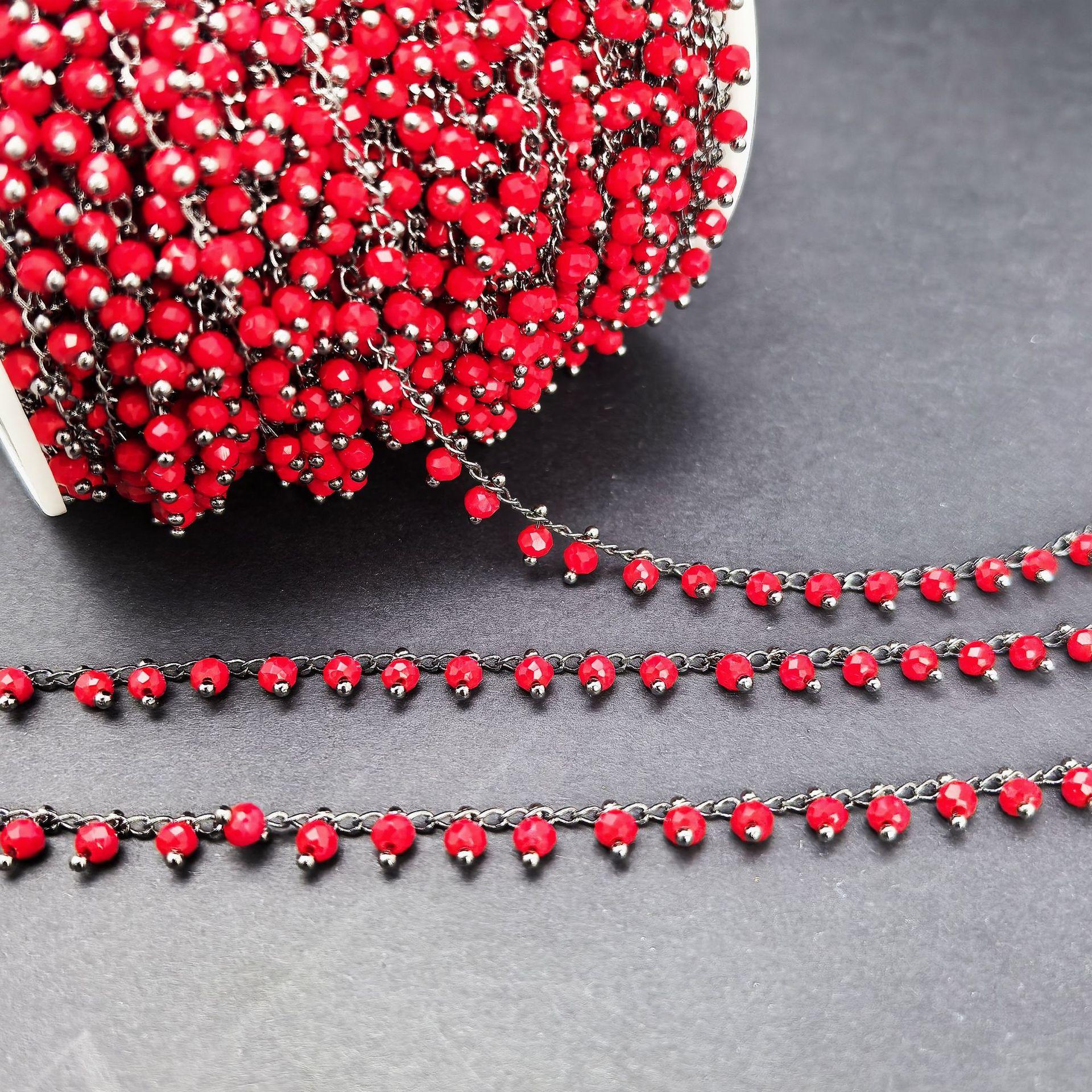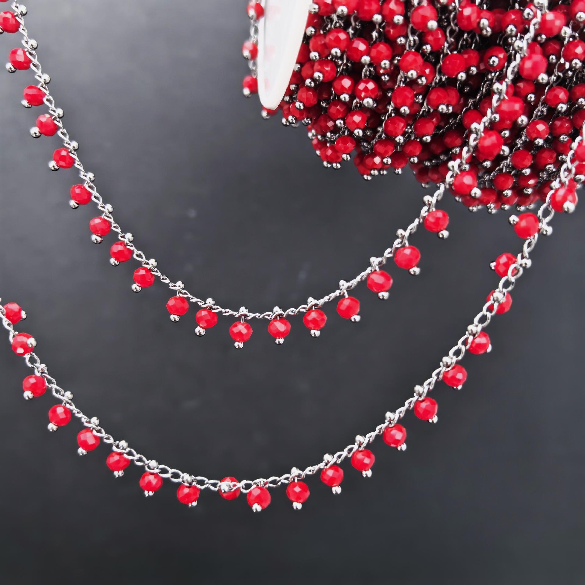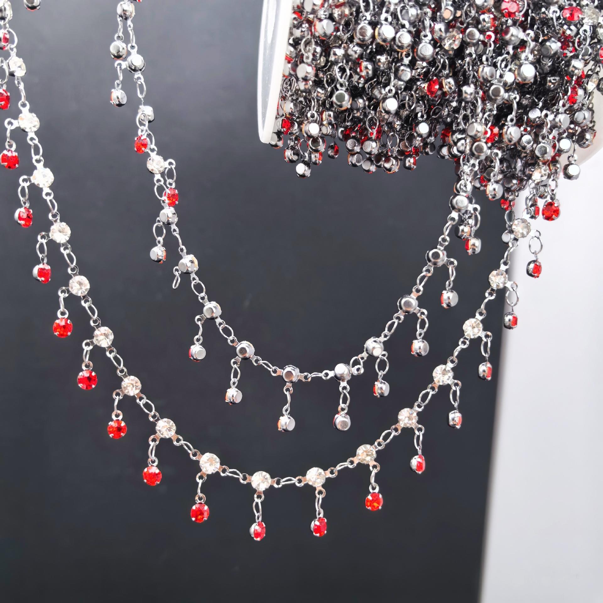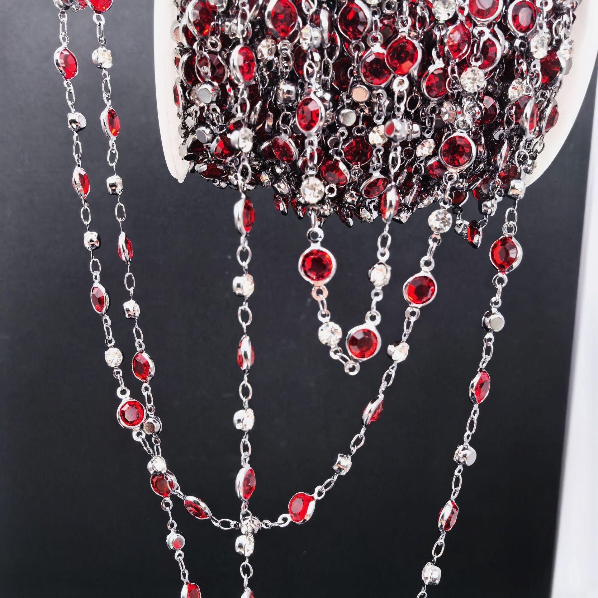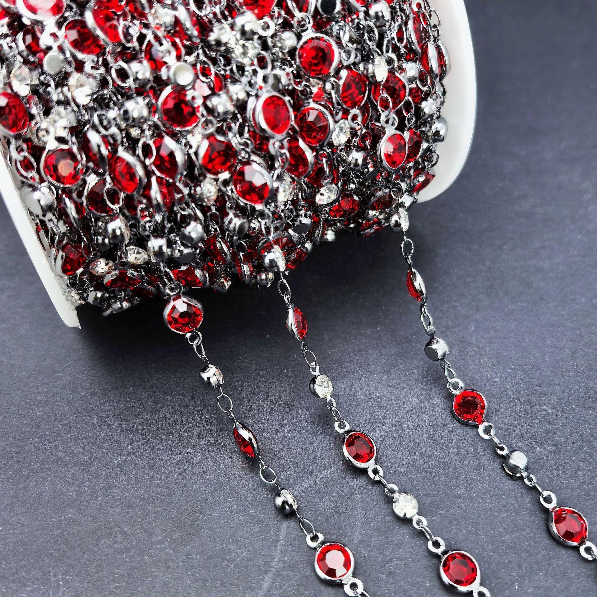 6mm red edged diamond + rhinestone chain, 6mm red triangular crystal chain, Red agate spacer chain, Red + whit...
