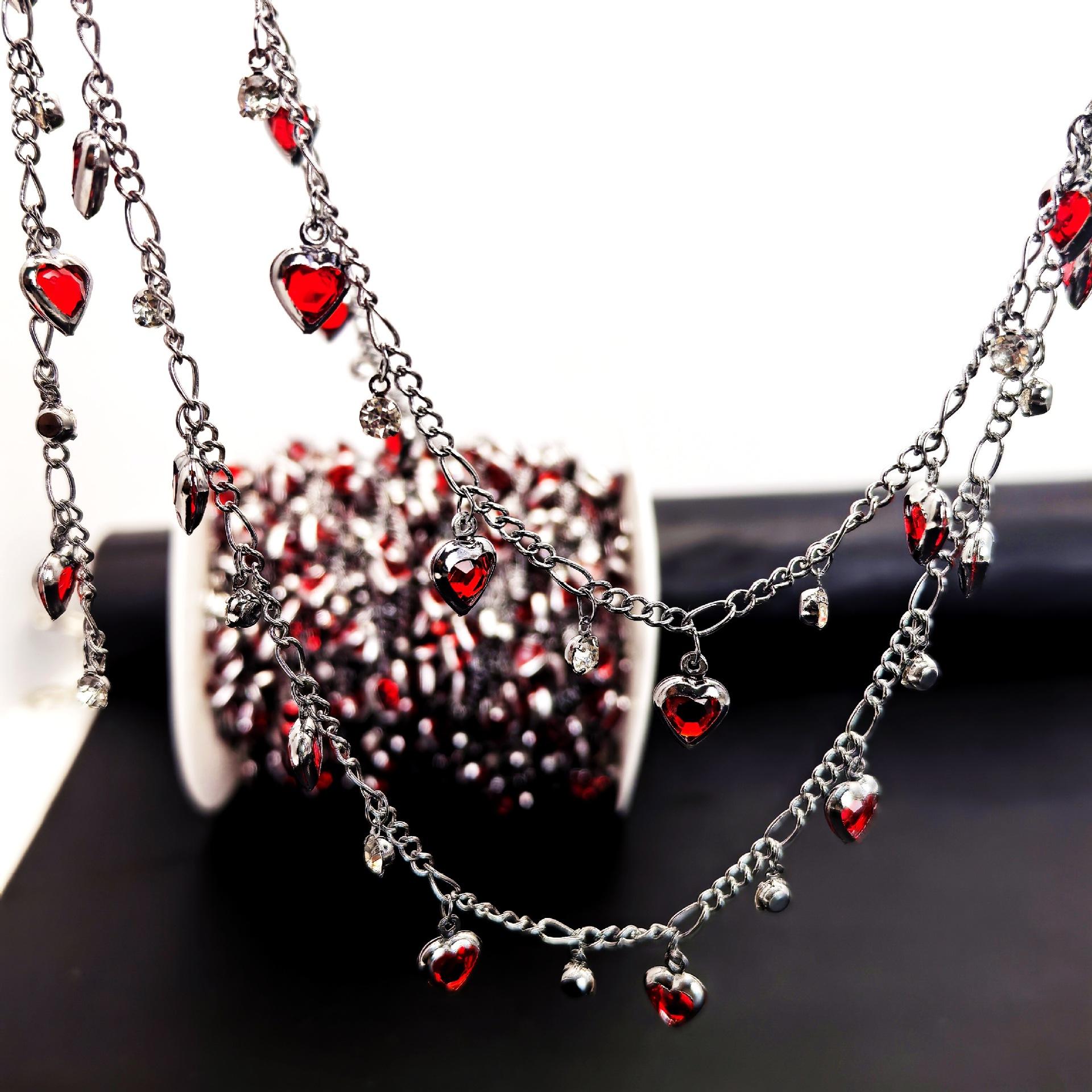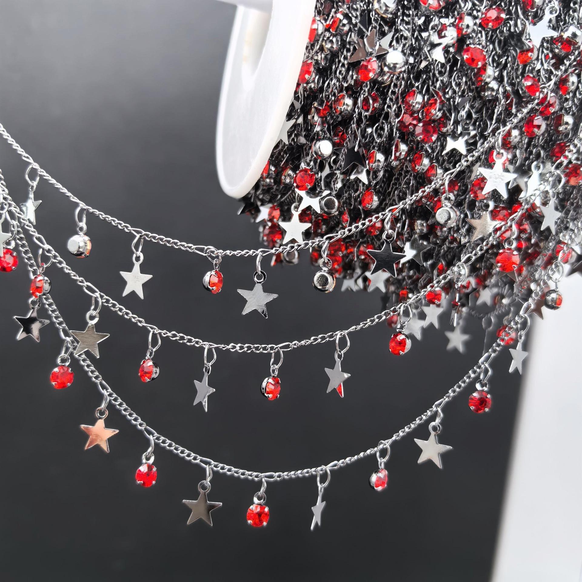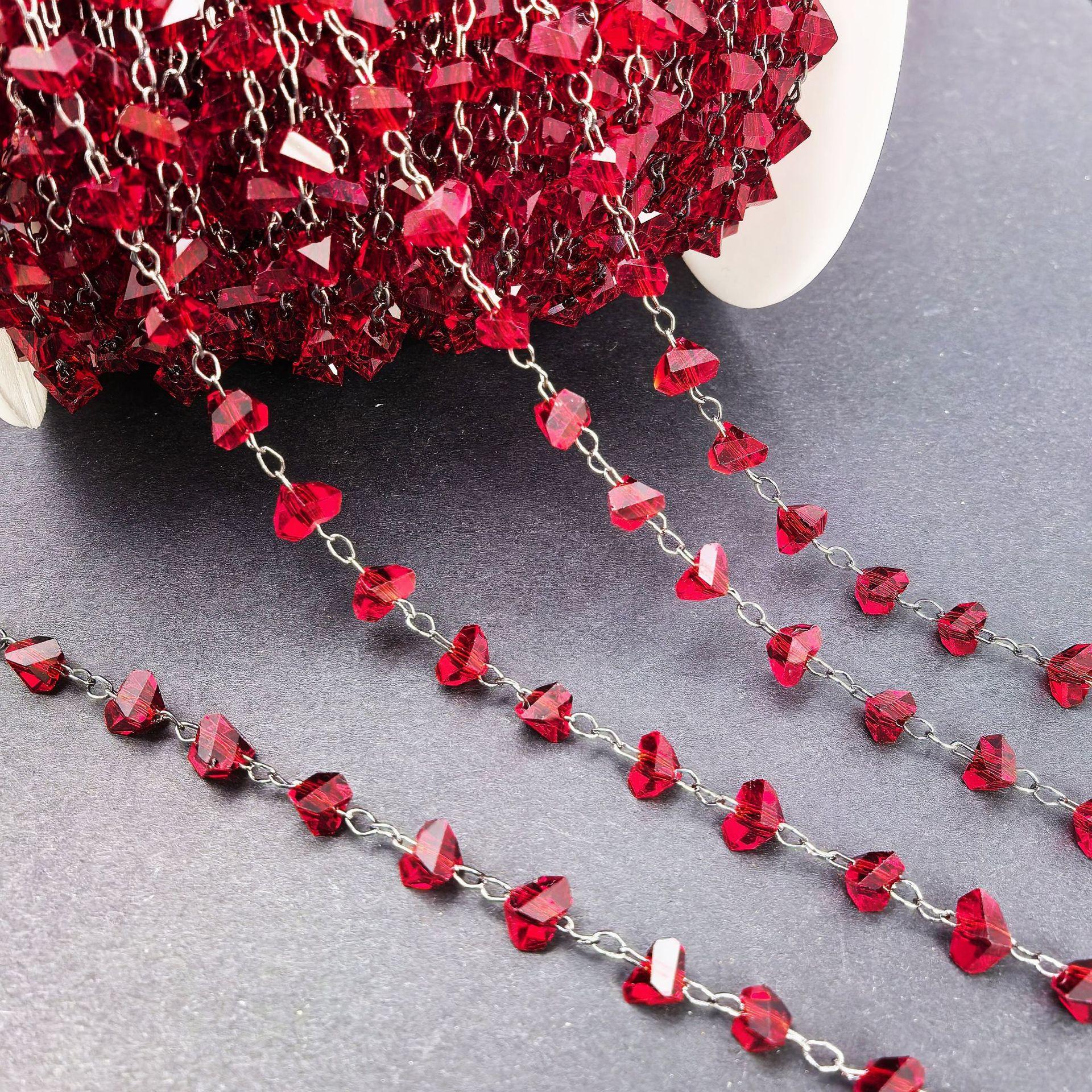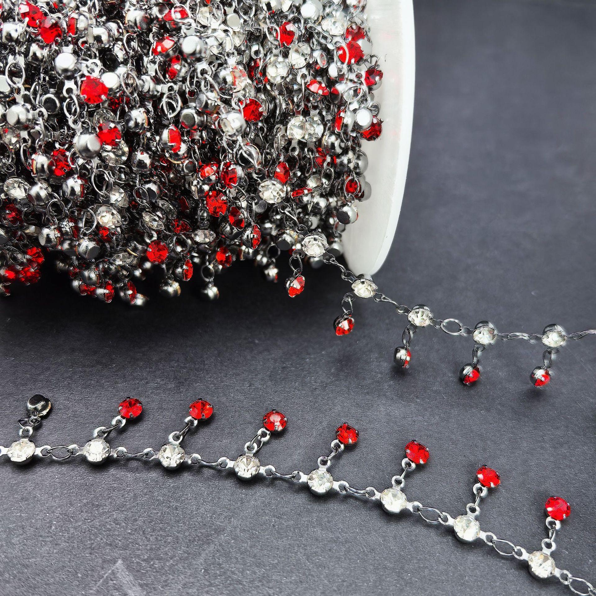 6mm red edged diamond + rhinestone chain, 6mm red triangular crystal chain, Red agate spacer chain, Red + whit...