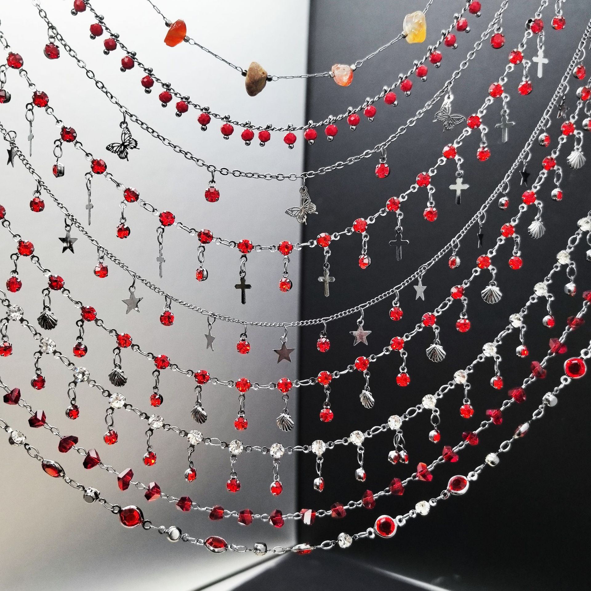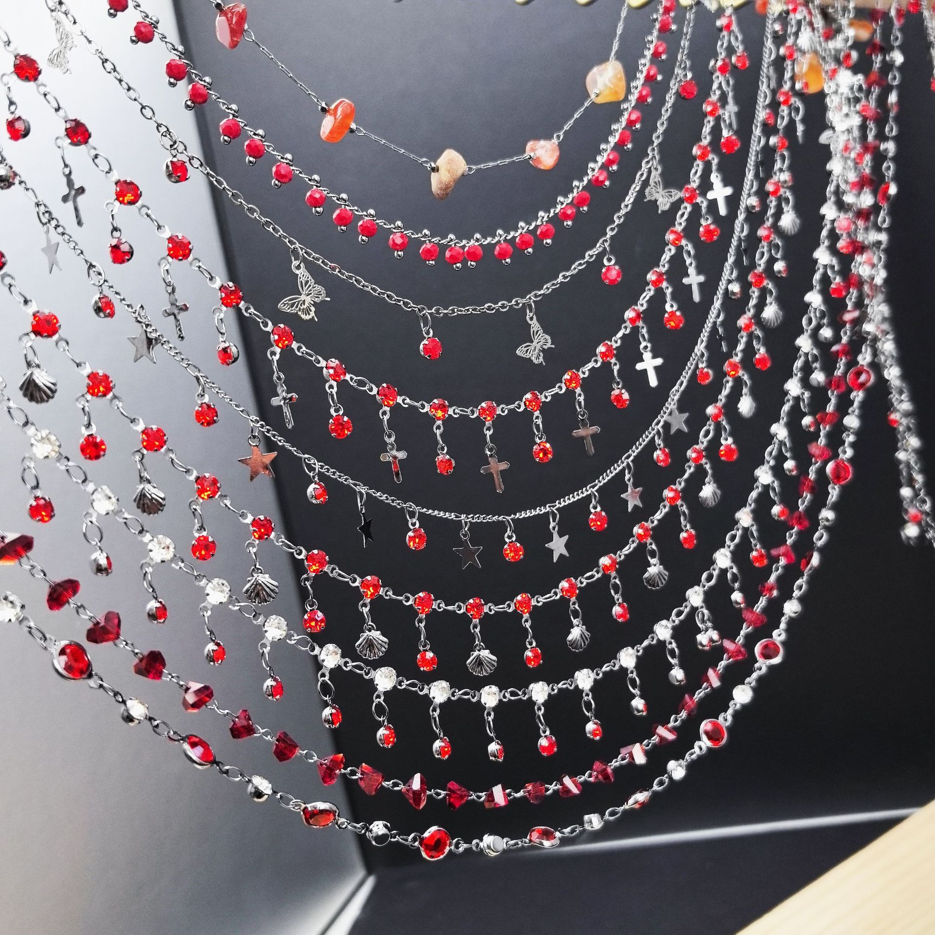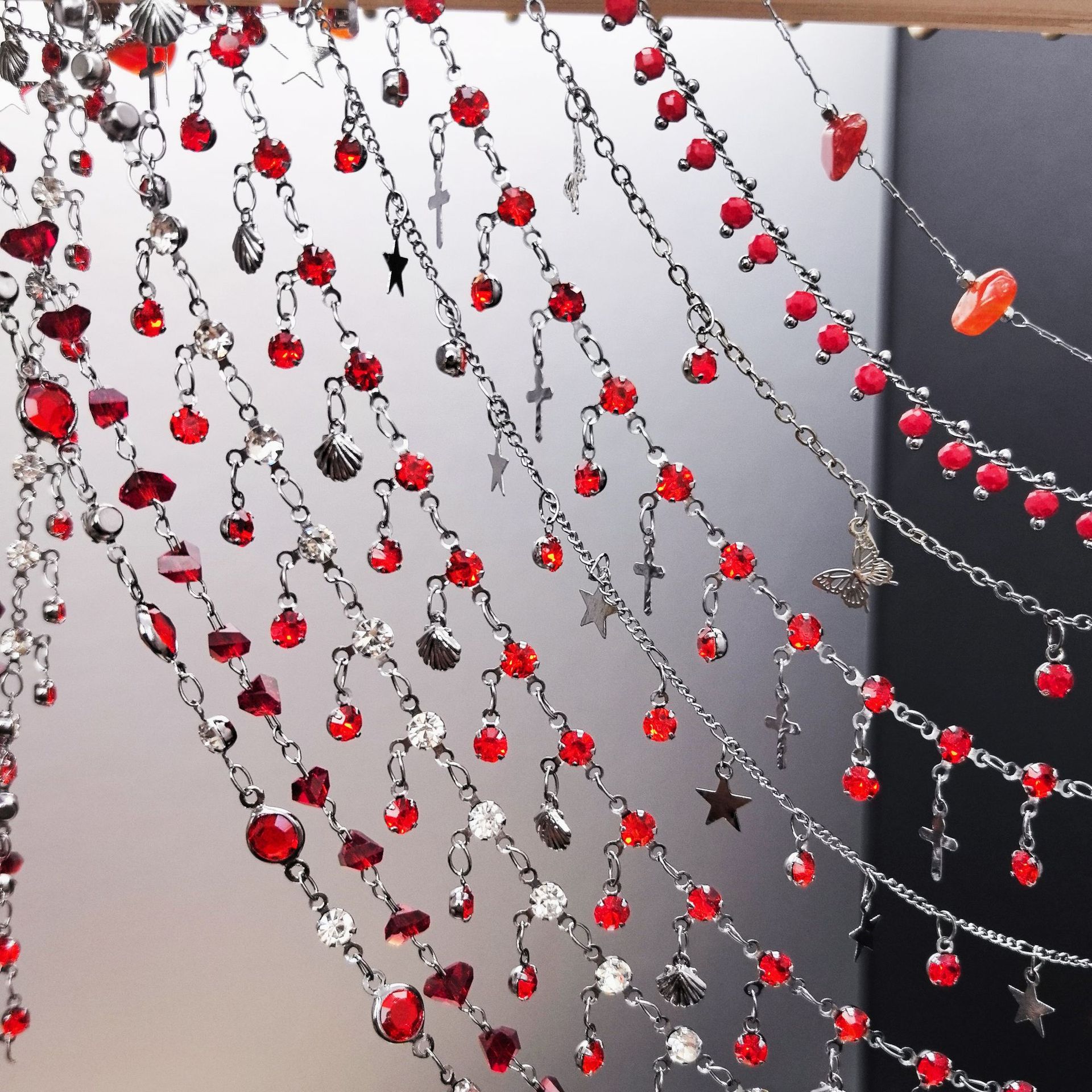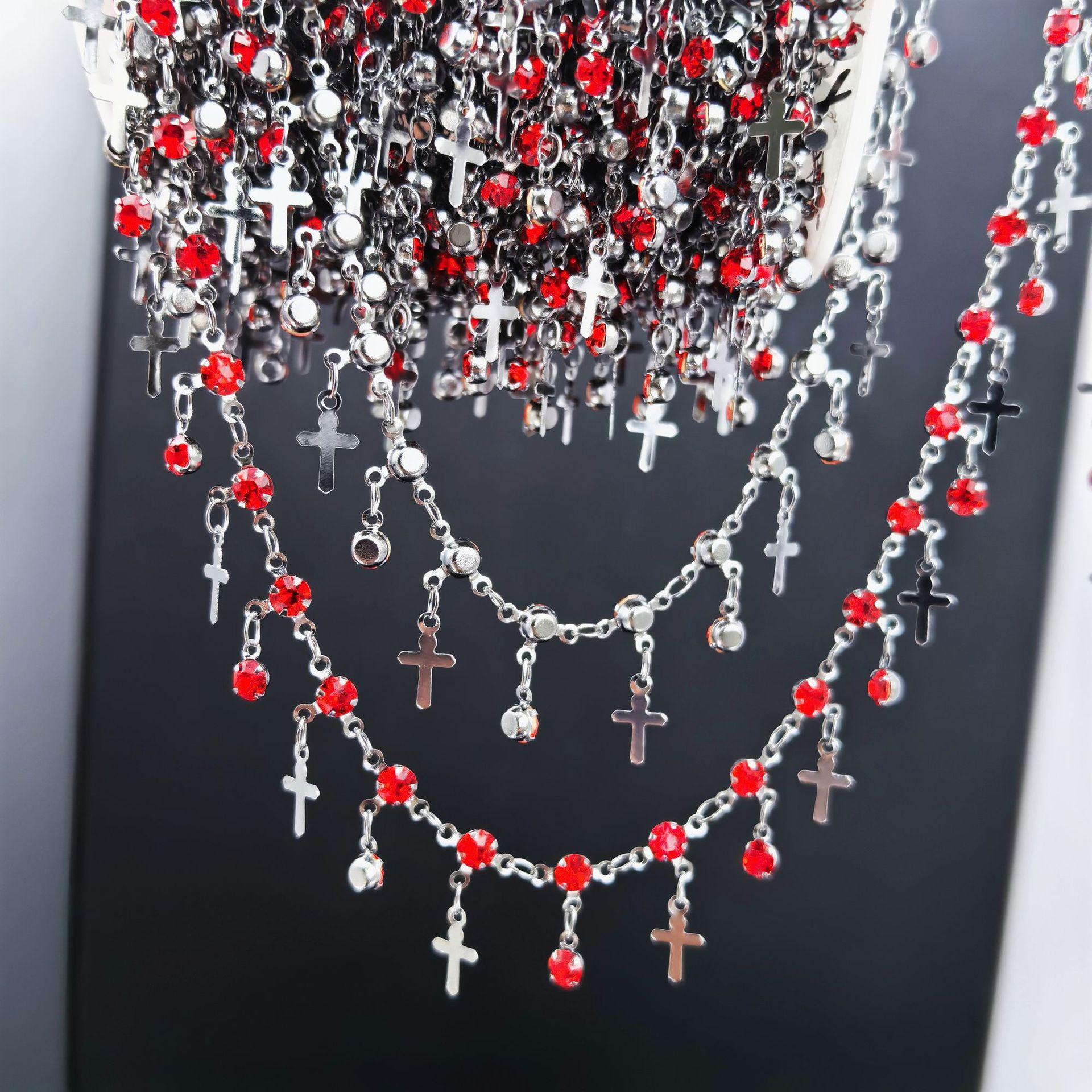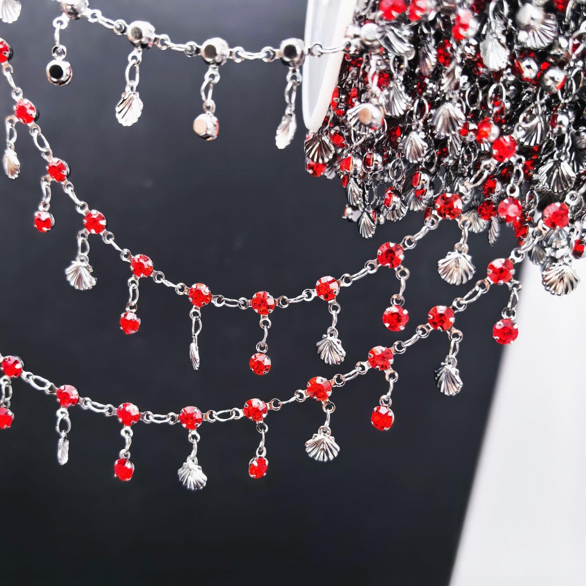 6mm red edged diamond + rhinestone chain, 6mm red triangular crystal chain, Red agate spacer chain, Red + whit...