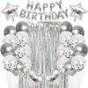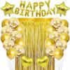 El set de lluvia de seda dorada para cumpleaños con globos negros incluye: un set de lluvia de seda de 1*2 m, un set de 13 letras de cumpleaños de 16 pulgadas, 2 globos de película de aluminio en forma de corazón de 18 pulgadas, 2 globos de película de aluminio en forma de estrella de cinco puntas de 18 pulgadas, 10 globos de lentejuelas de 12 pulgadas, 10 globos perlados y un rollo de cinta